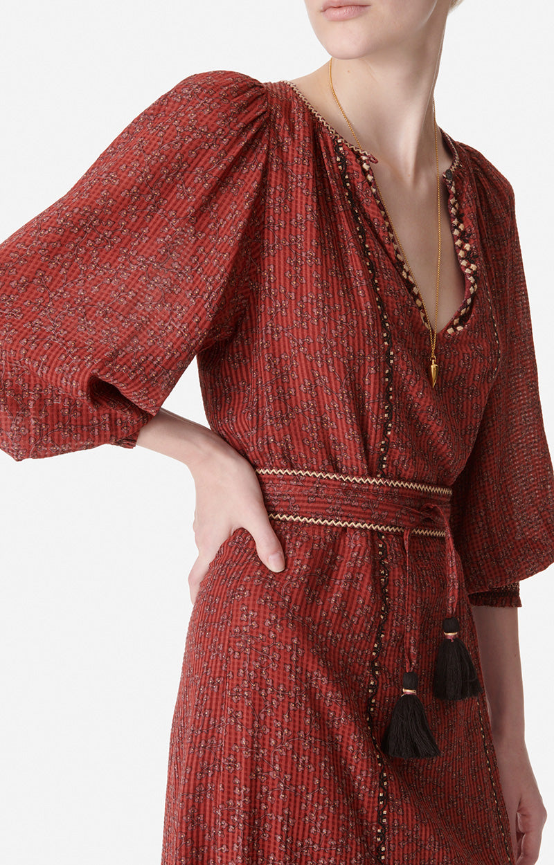 di V. Maniche a sbuffo a 3/4 affusolate con punto smock. Cintura da annodare con nappine.
