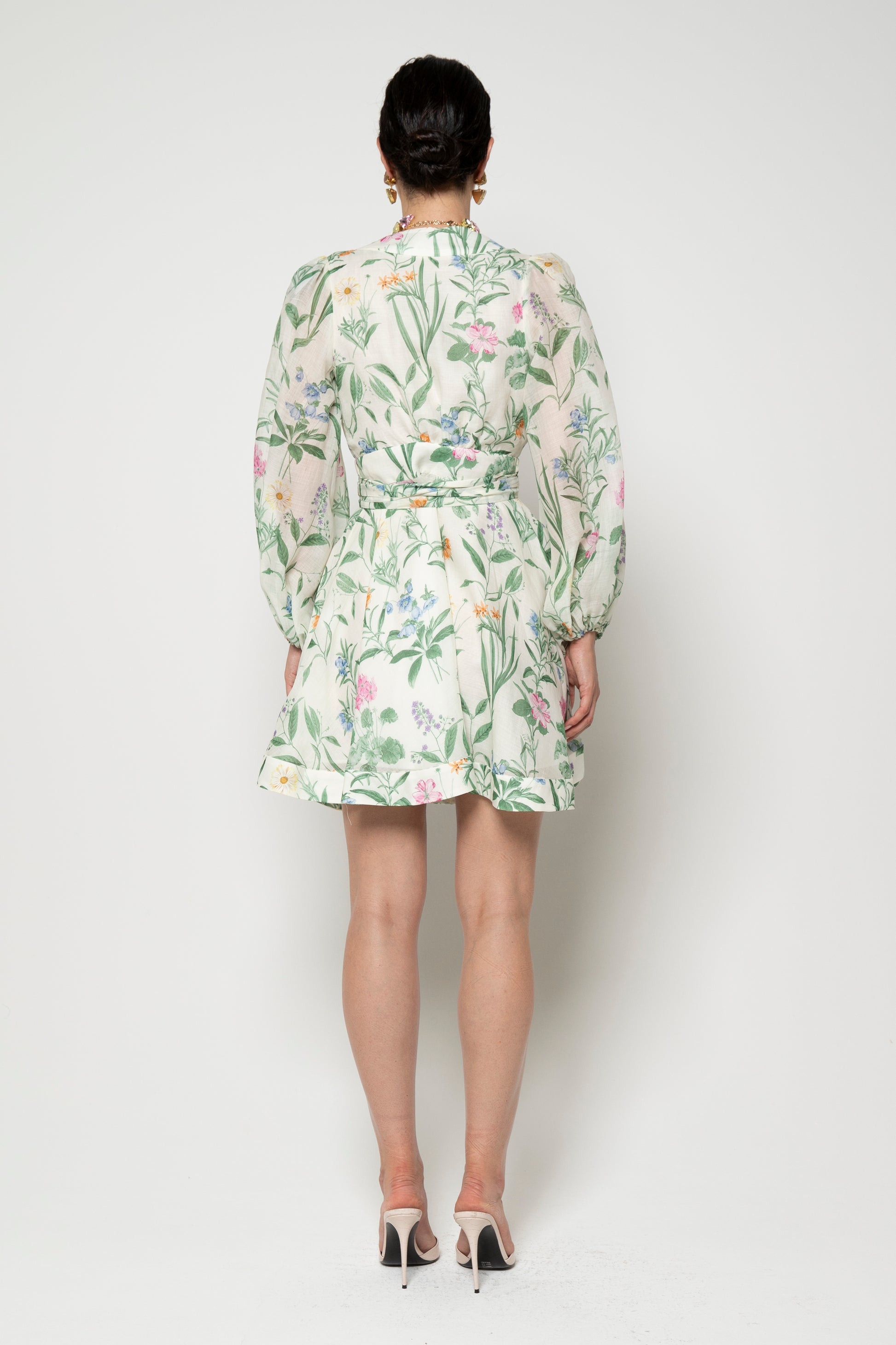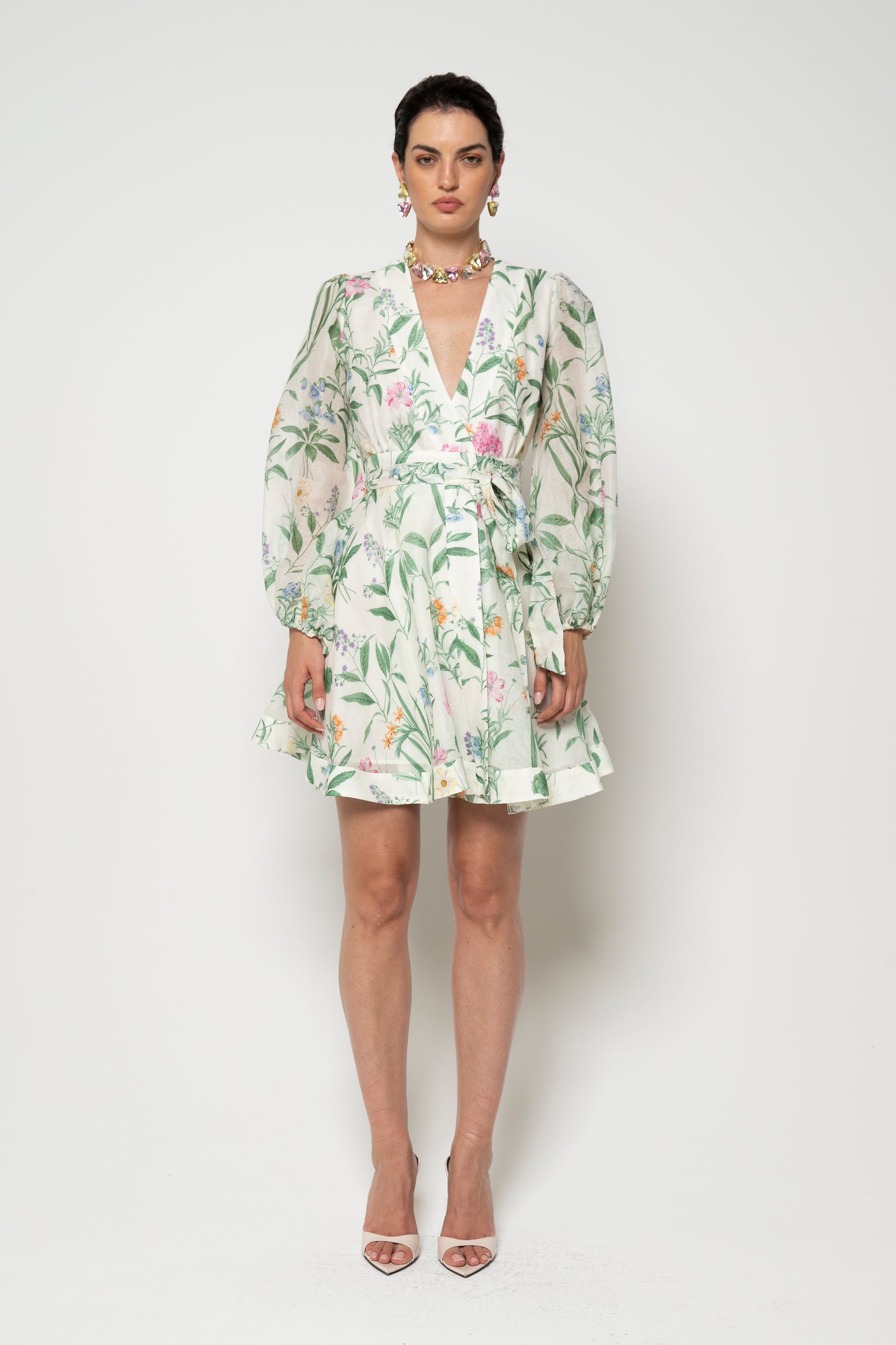 Abito corto floreale Lavi Couture, modello incrociato a portafoglio con gonna ampia a ruota. La lunghezza sopra il ginocchi, la cintura a fusciacca e la manica leggera e ampia lo rendono un abito effortless chic, adatto da cocktail, serate al mare ma anche da cerimonia.