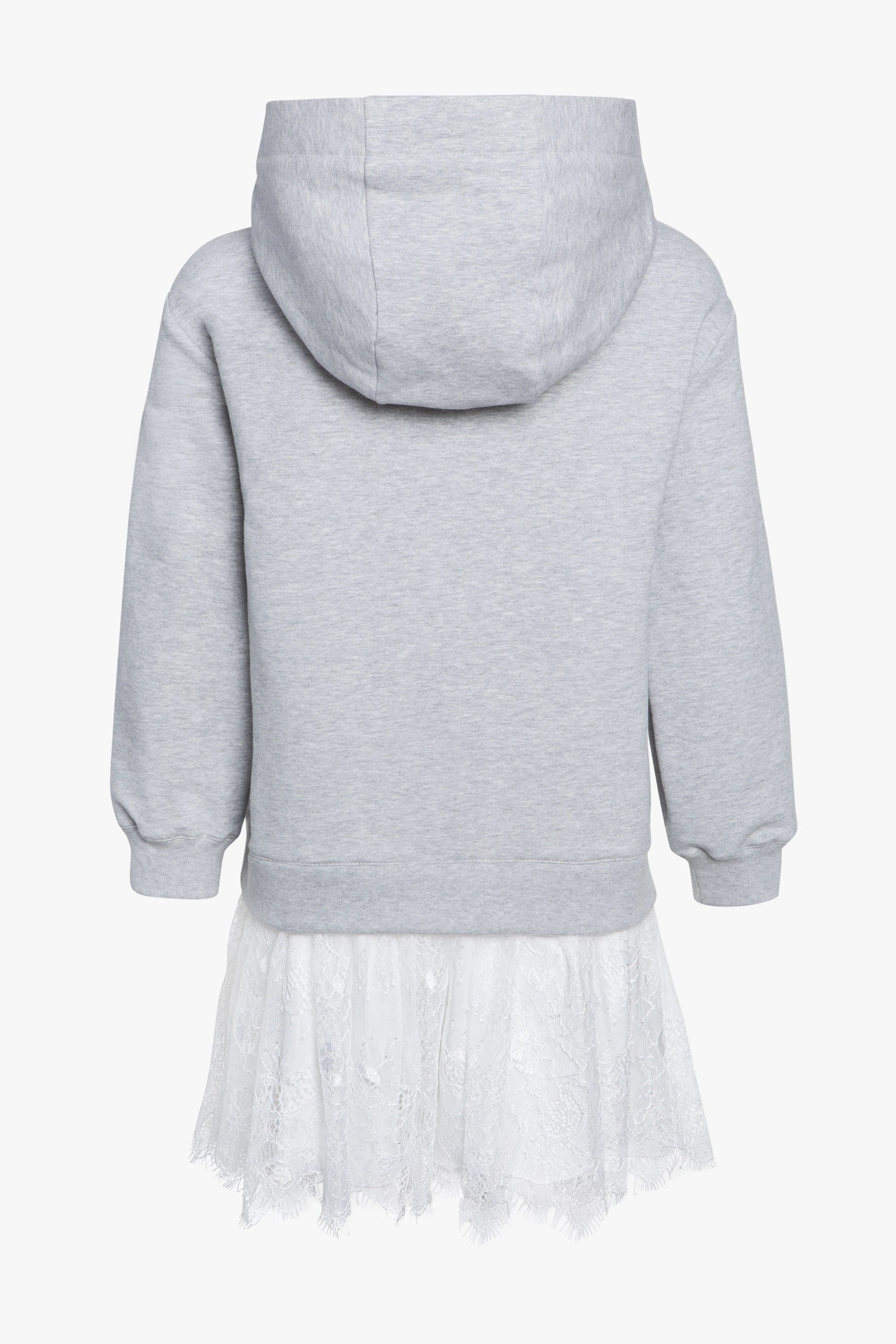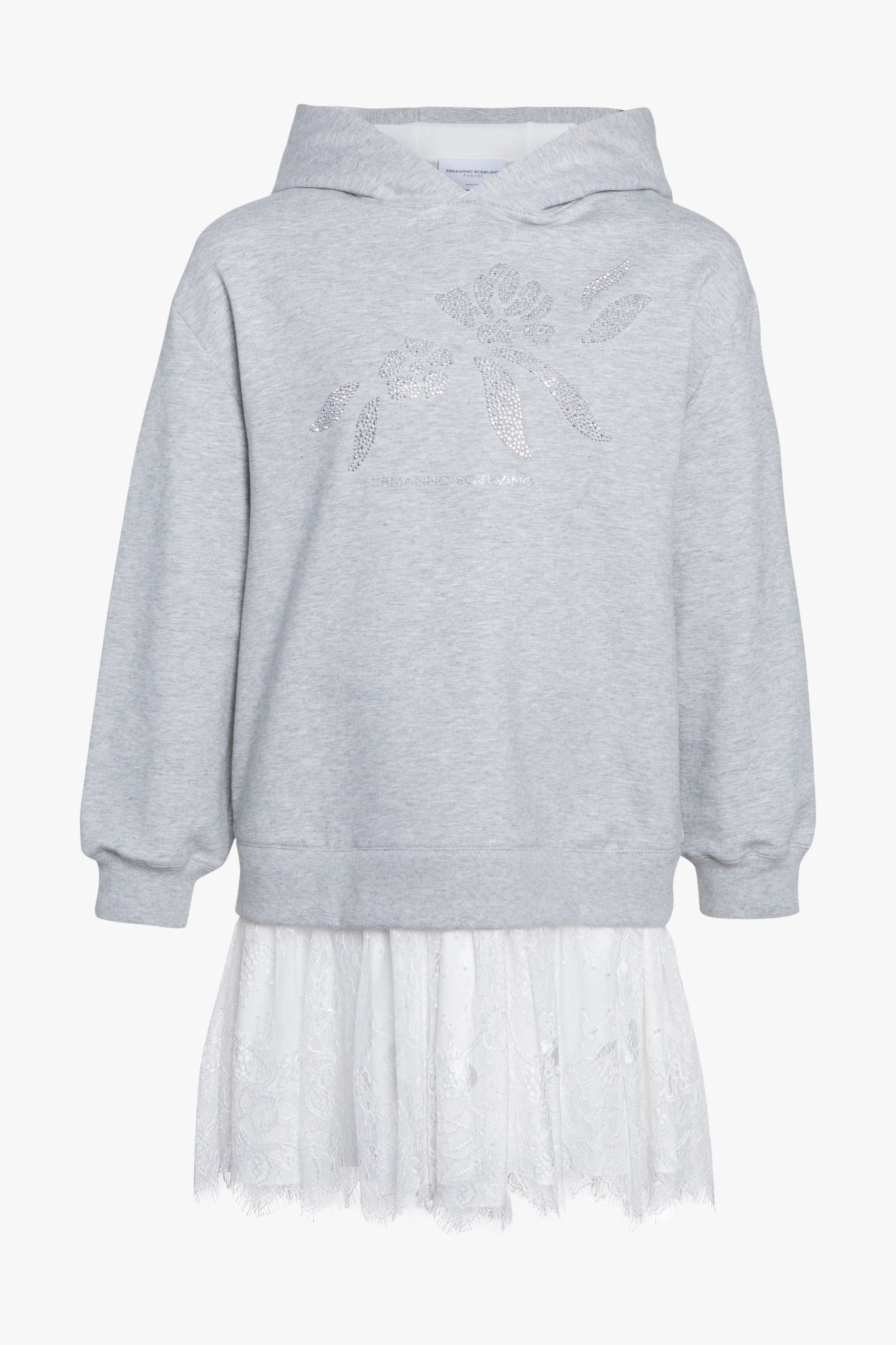 Abito in cotone e pizzo. Il modello richiama il classico design delle felpe sportive, di cui riprende i polsini, la balza sul fondo ed il cappuccio, reinterpretato con tocchi femminili e romatici: la gonna è realizzata interamente in pizzo a contrasto, ed il davanti presenta il ricamo floreale con il logo