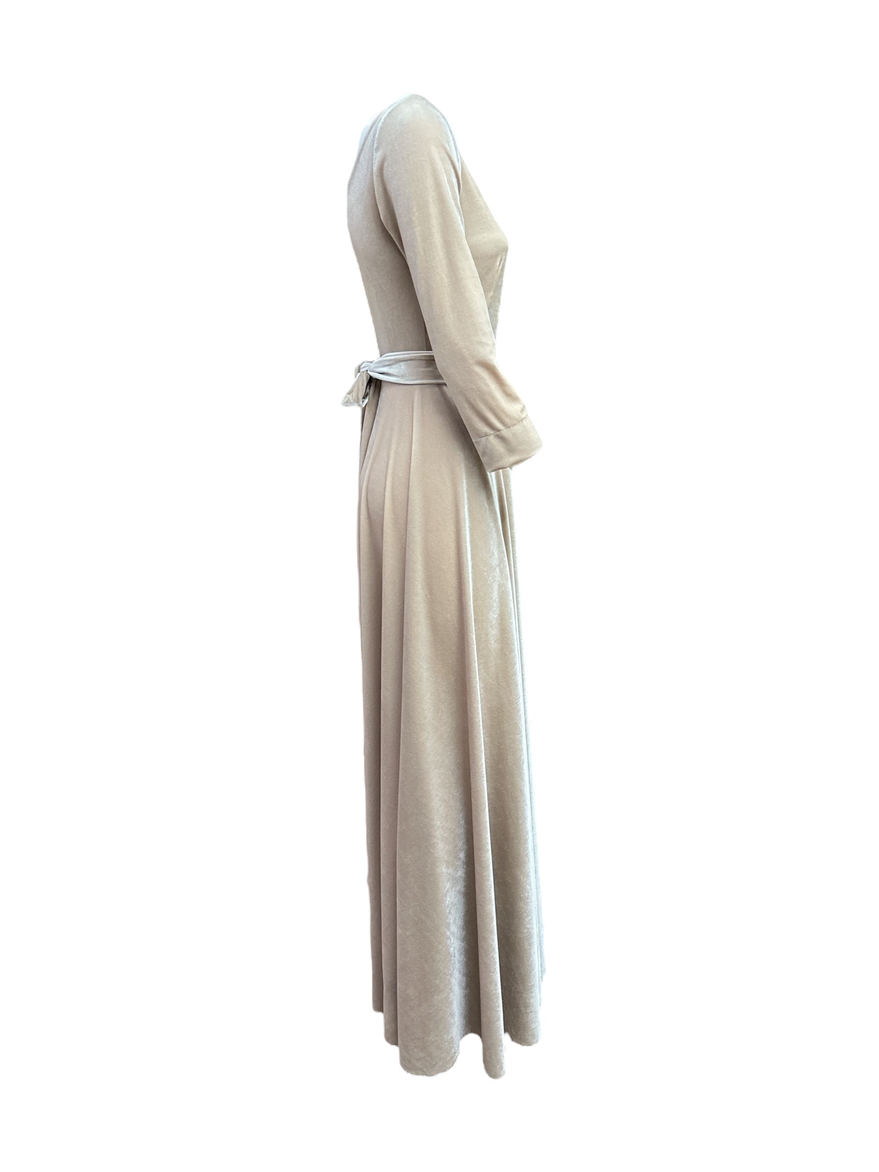 ABITO IN VELLUTO LUNGO SEMIRUOTA RIBBON COLORE CHAMPAGNE CON ZIP POSTERIORE E CINTURA IN VITA .