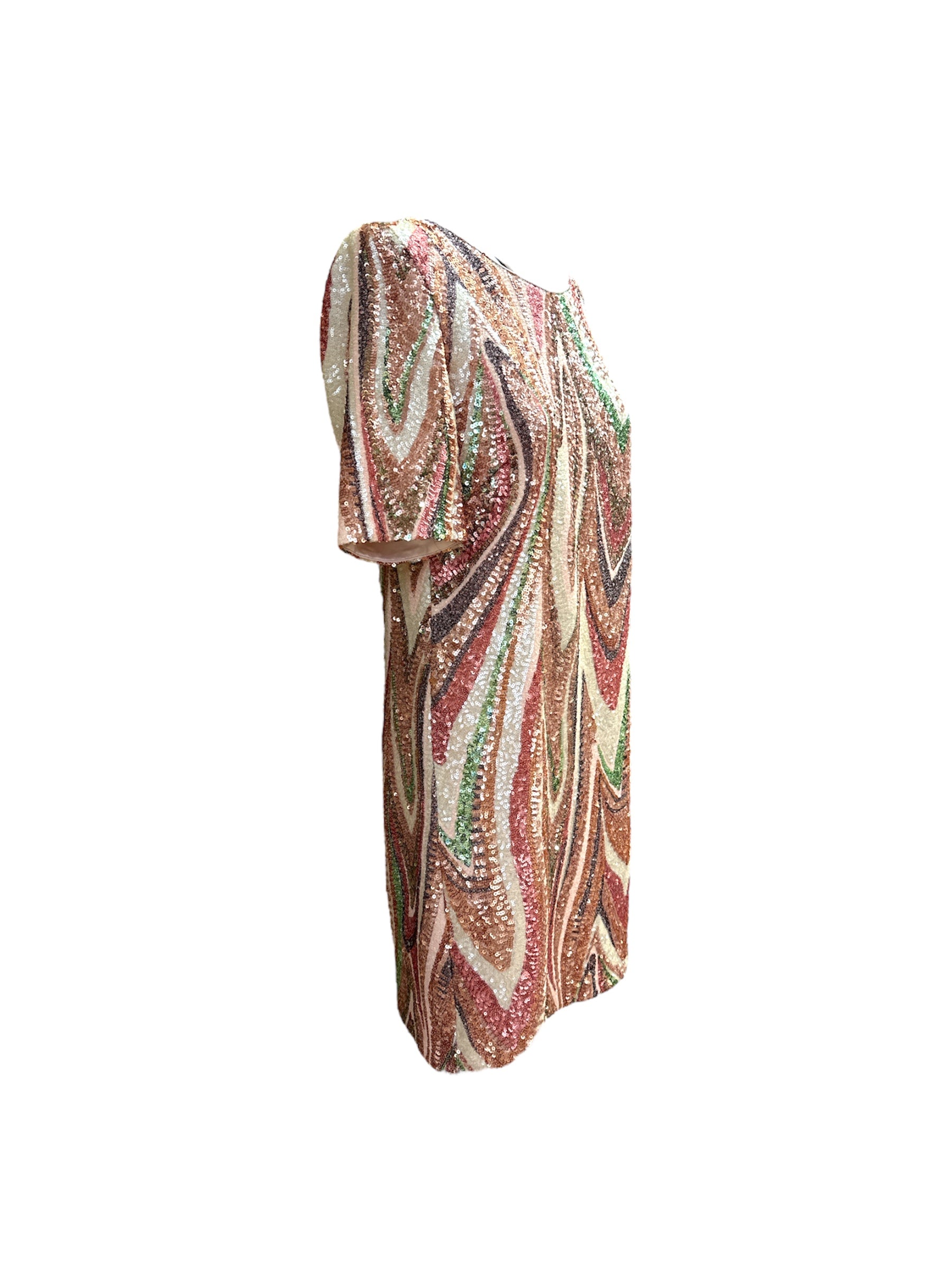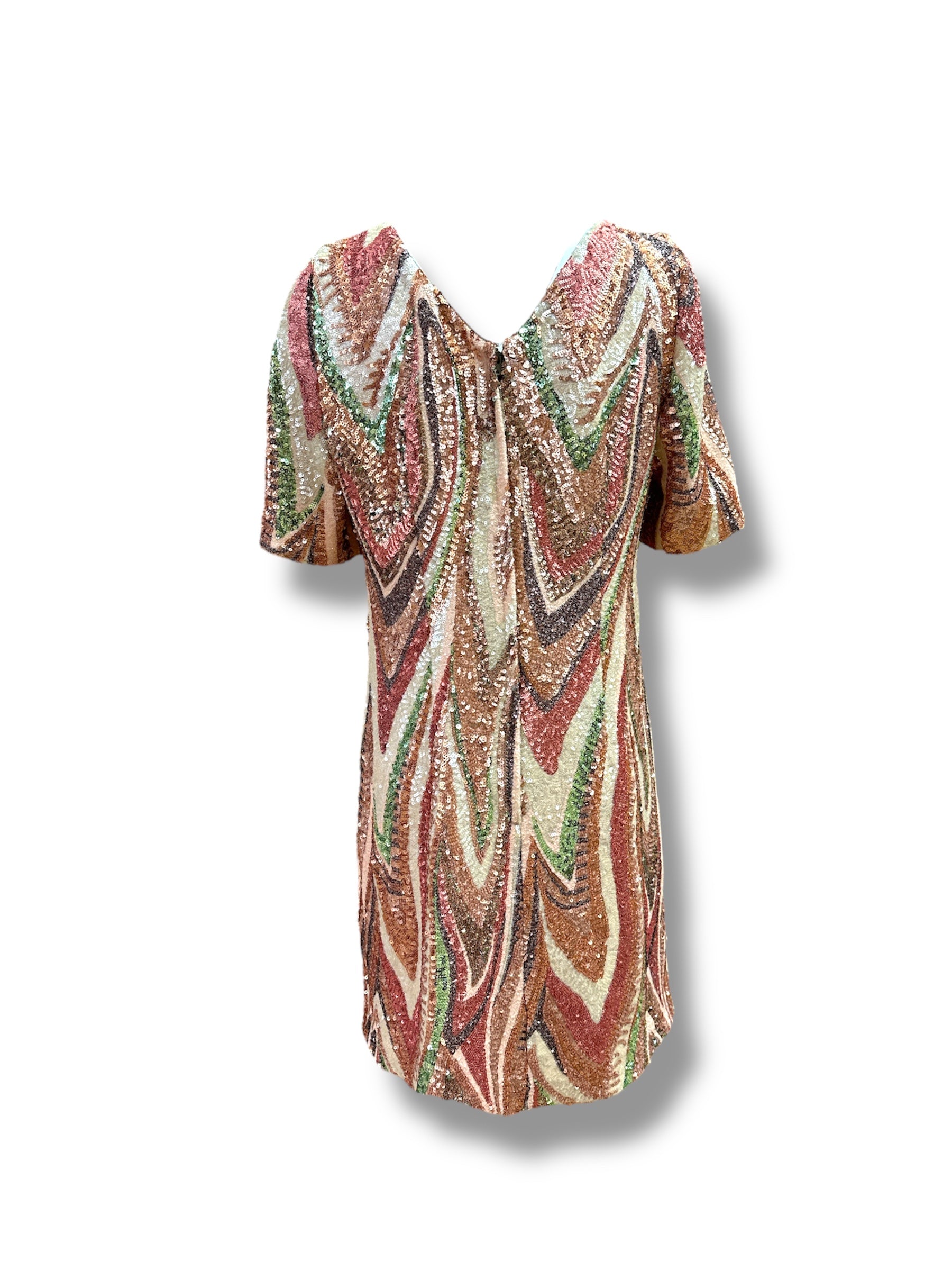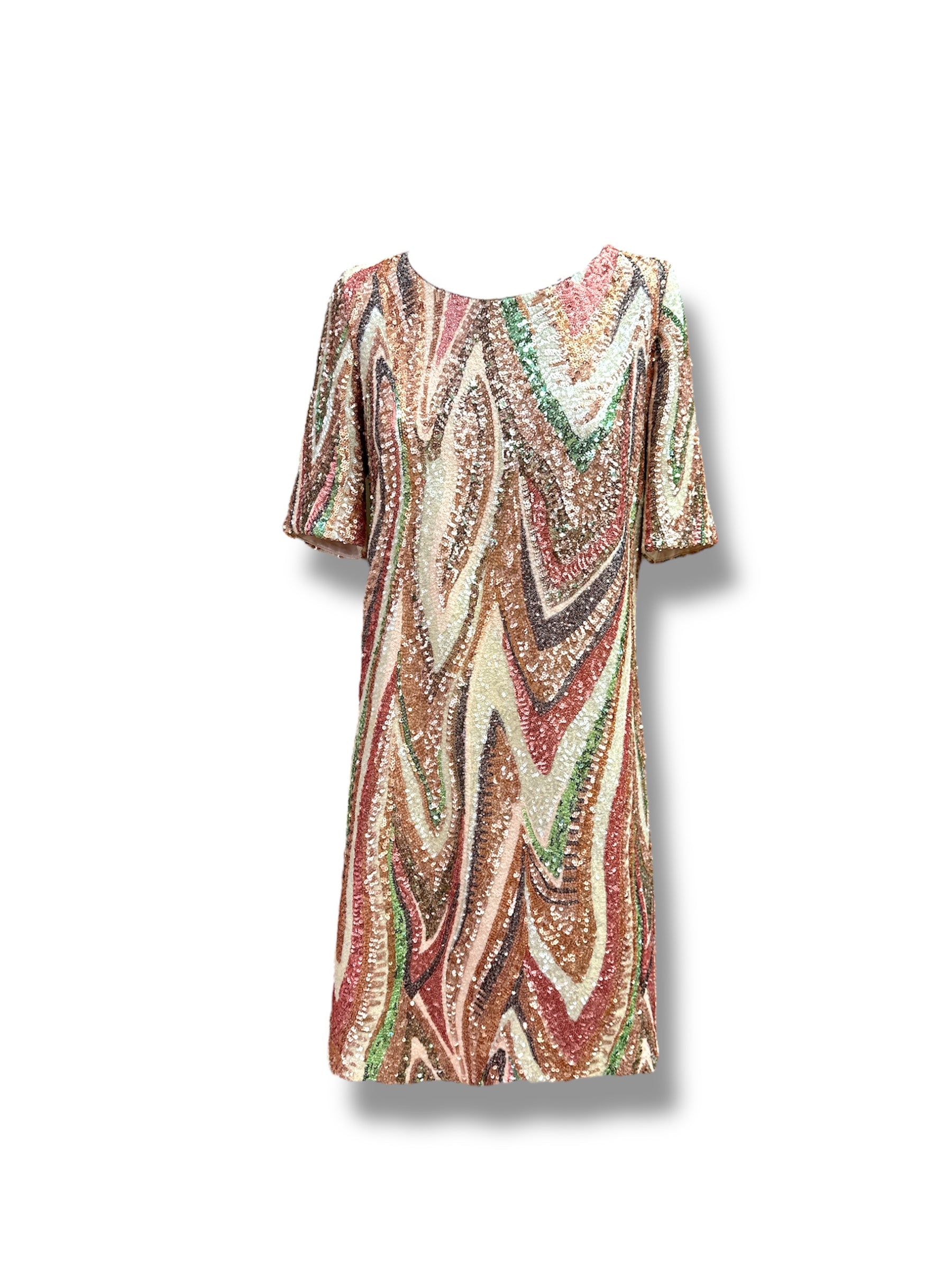 Questo abito a mezze maniche paillettes multicolor conferiscono un effetto luminoso e dinamico. Ideale per eventi serali o occasioni speciali, la sua veste elegante valorizza la silhouette con un tocco di originalità, garantendo un look sofisticato e raffinato. La combinazione di colori garantisce versatilità nell’abbinamento con accessori e calzature, rendendo questo capo un pezzo distintivo nel guardaroba.
