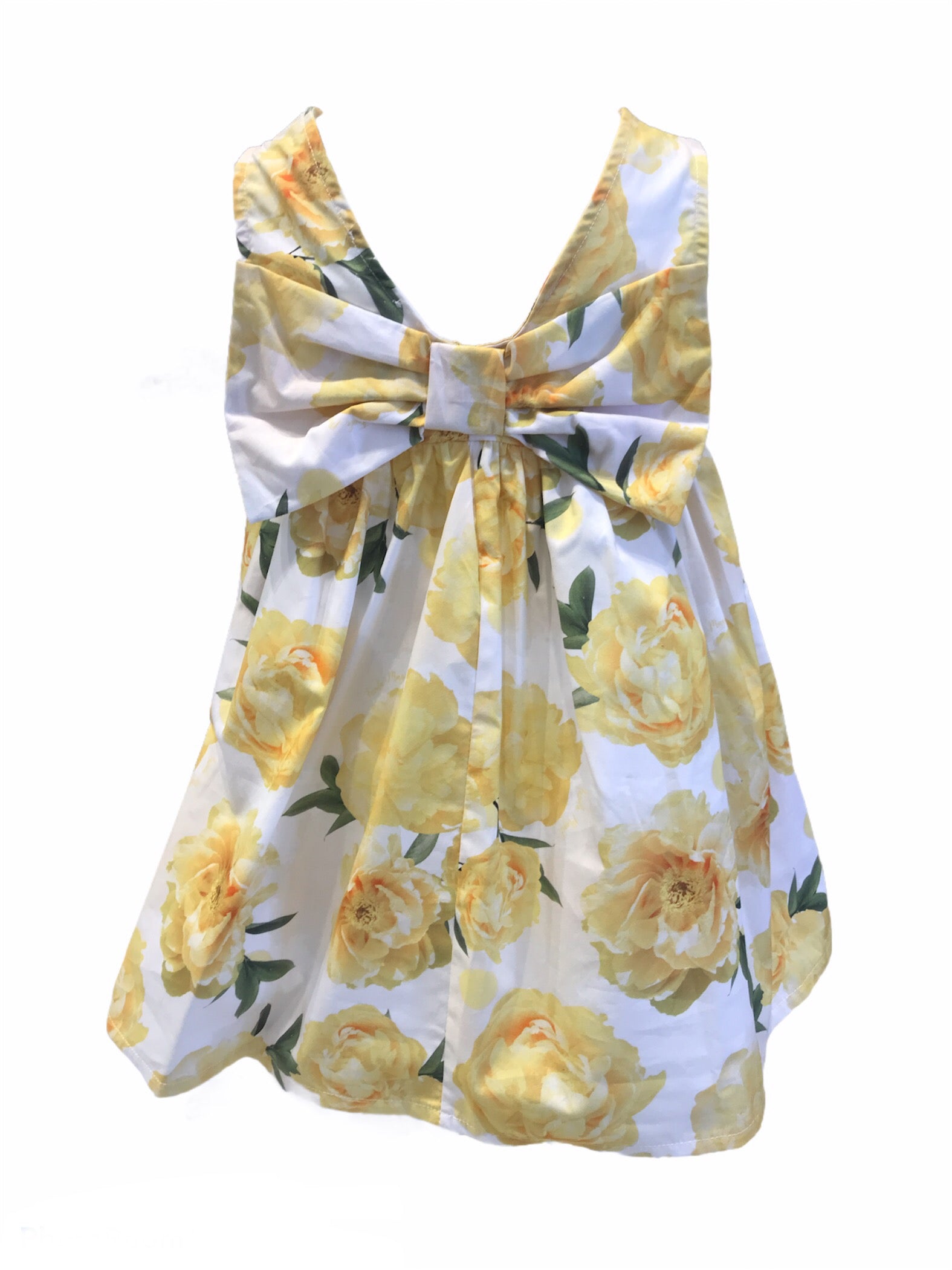 Abito MAGIL in cotone con fantasia fiorita gialla su sfondo bianco, fiocco dietro