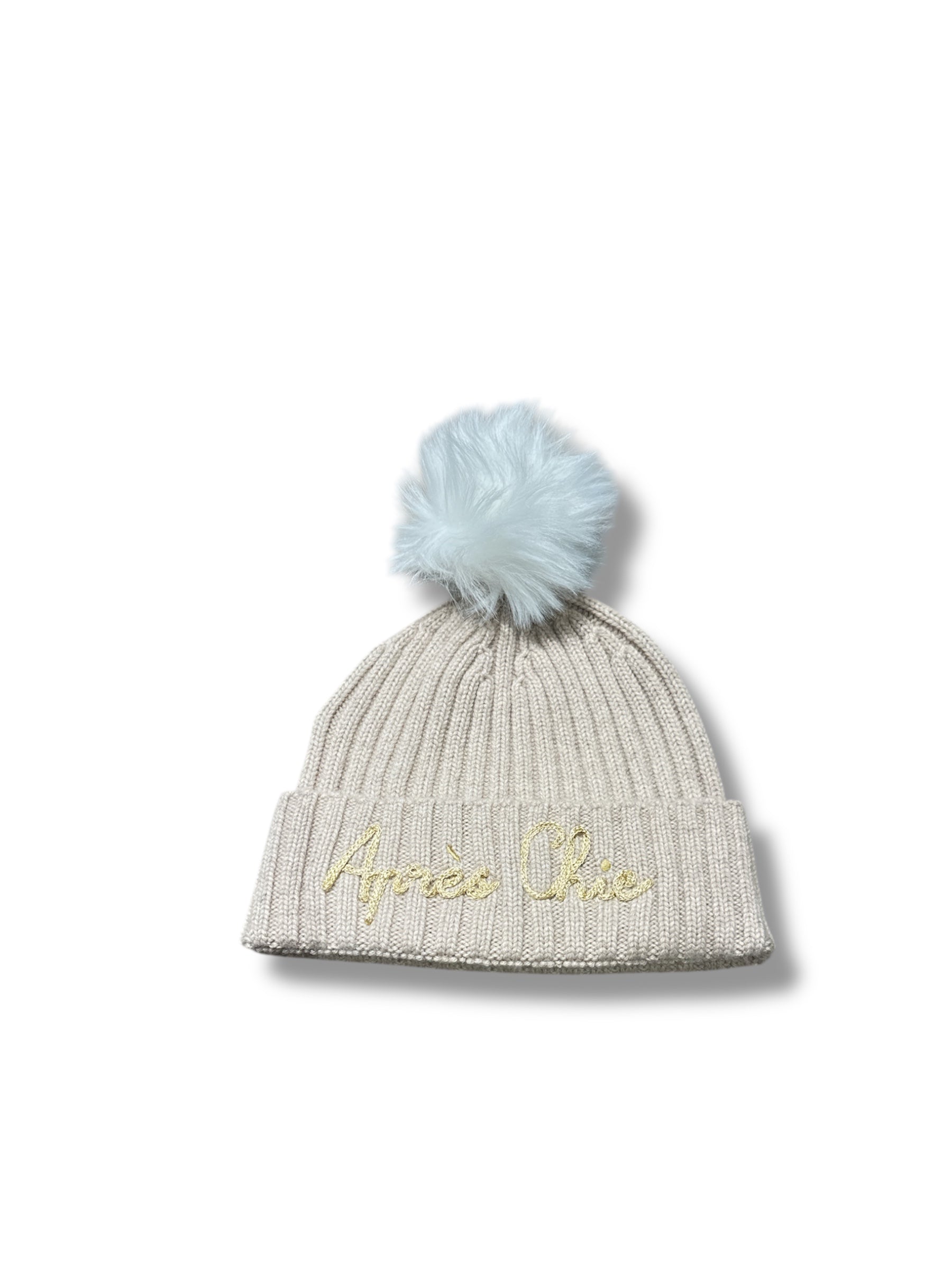 Berretto donna Saint Barth in lana con lavorazione a coste beige con scritta Après Chic oro