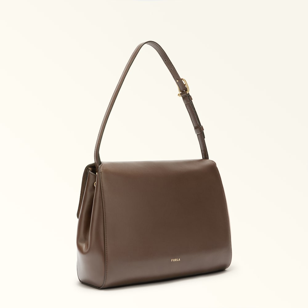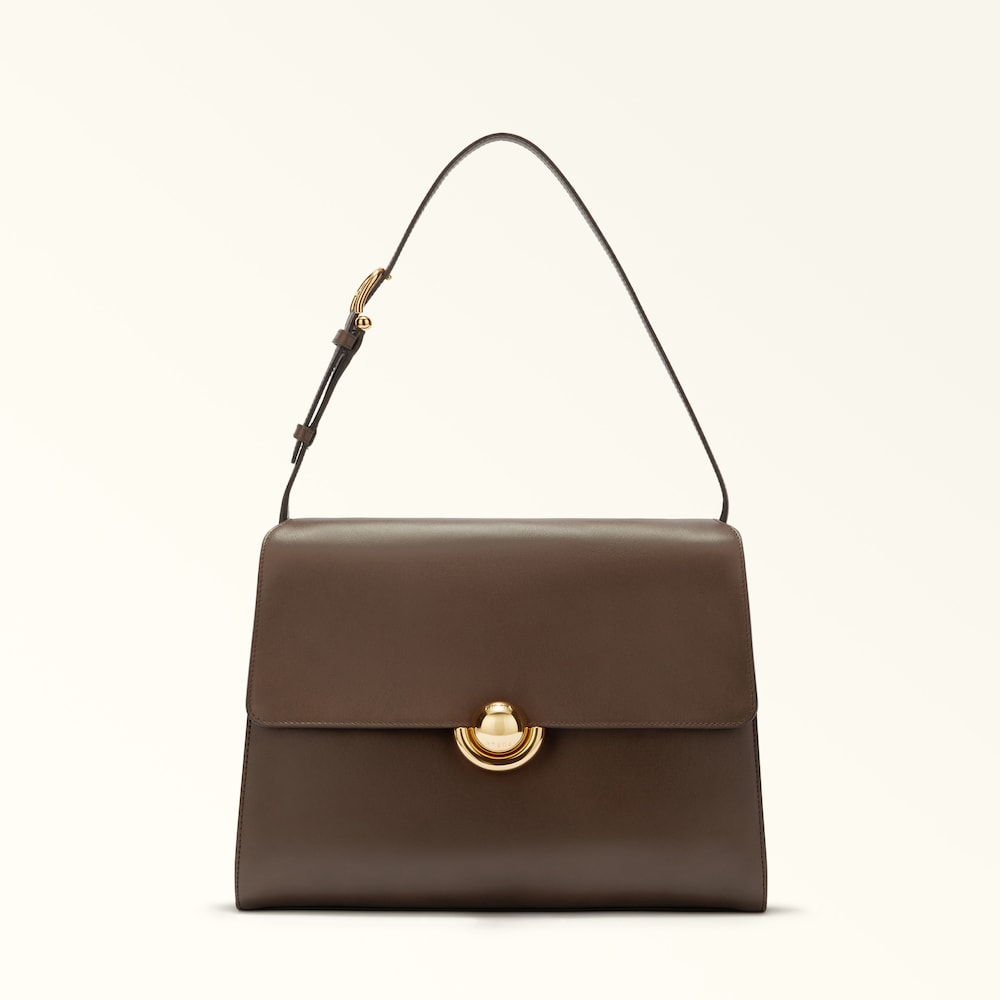 Questa borsa color espresso, realizzata in Italia, presenta un sofisticato design a doppio lembo con dettagli oro. Questo accessorio combina un'estetica raffinata con una costruzione durevole, offrendo eleganza e praticità per gli utenti più esigenti.
