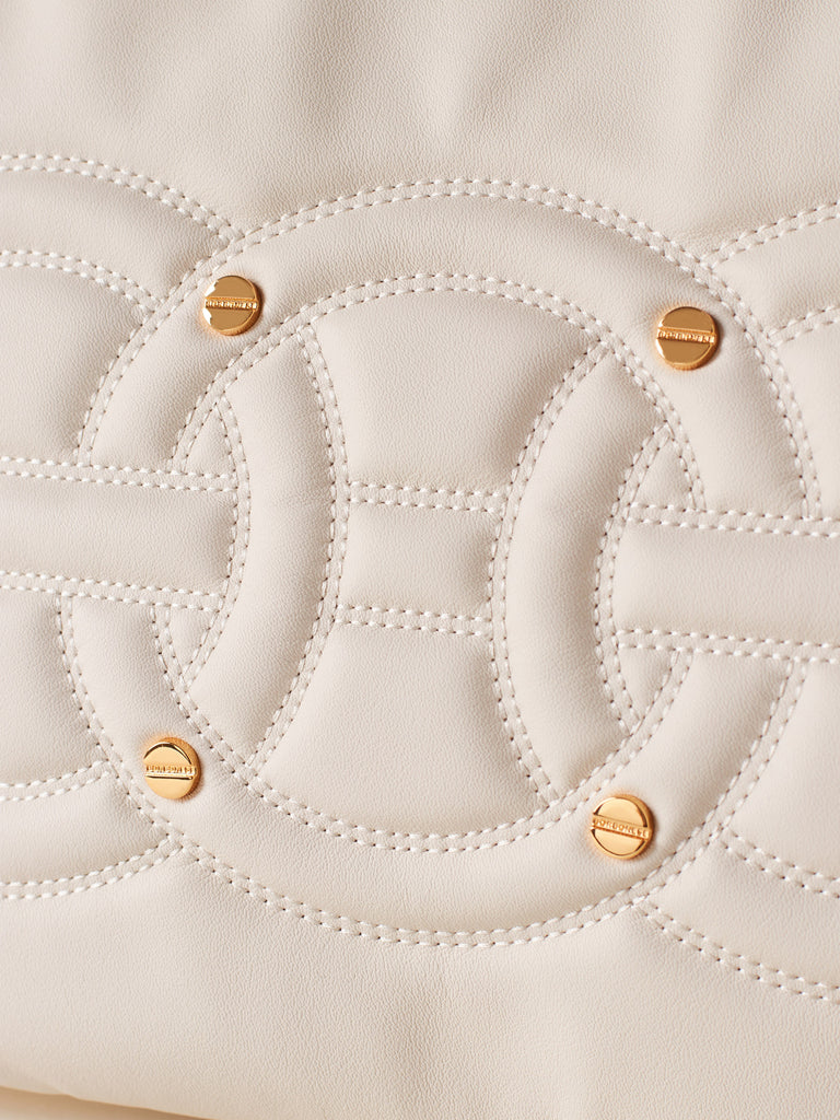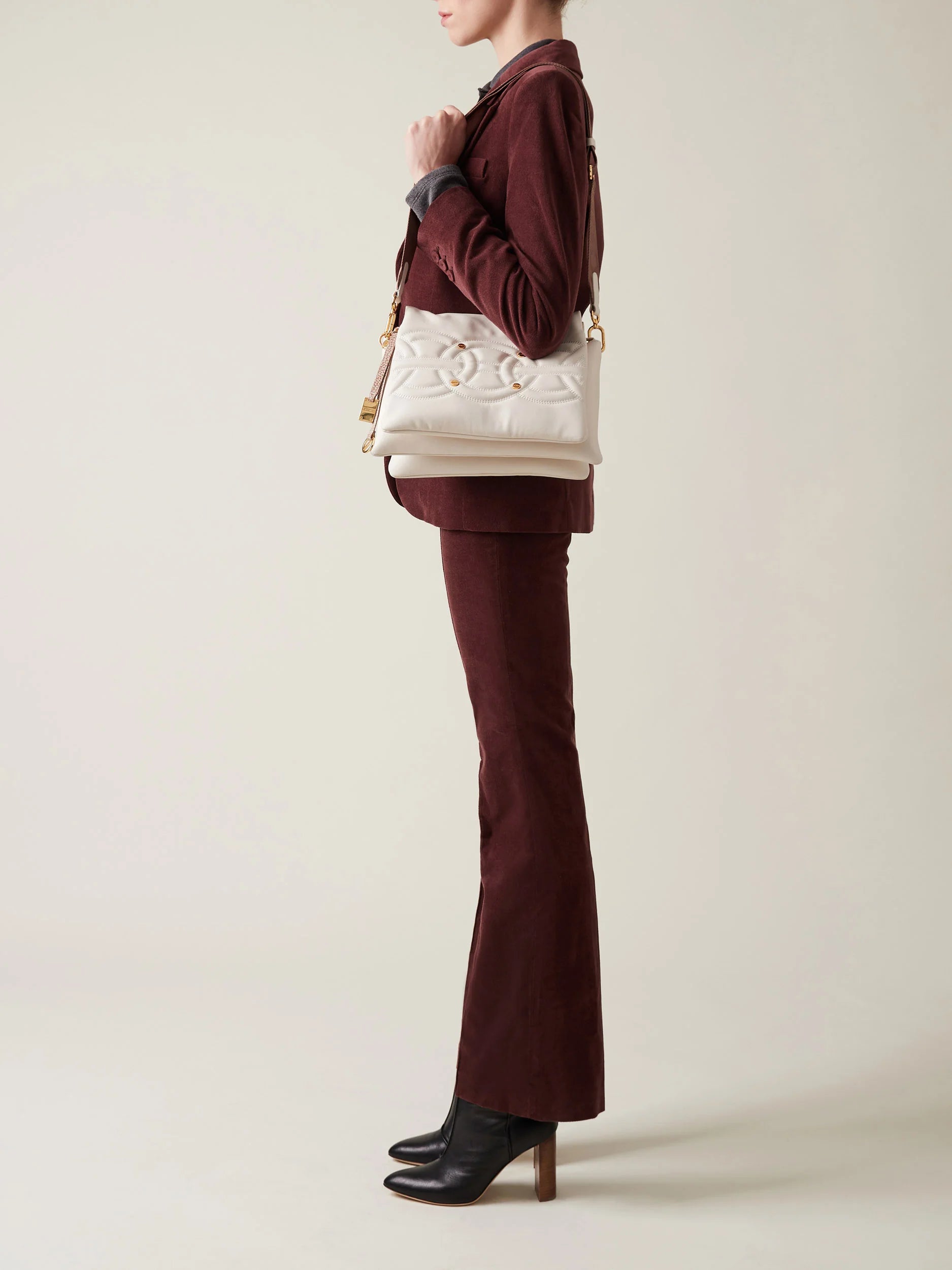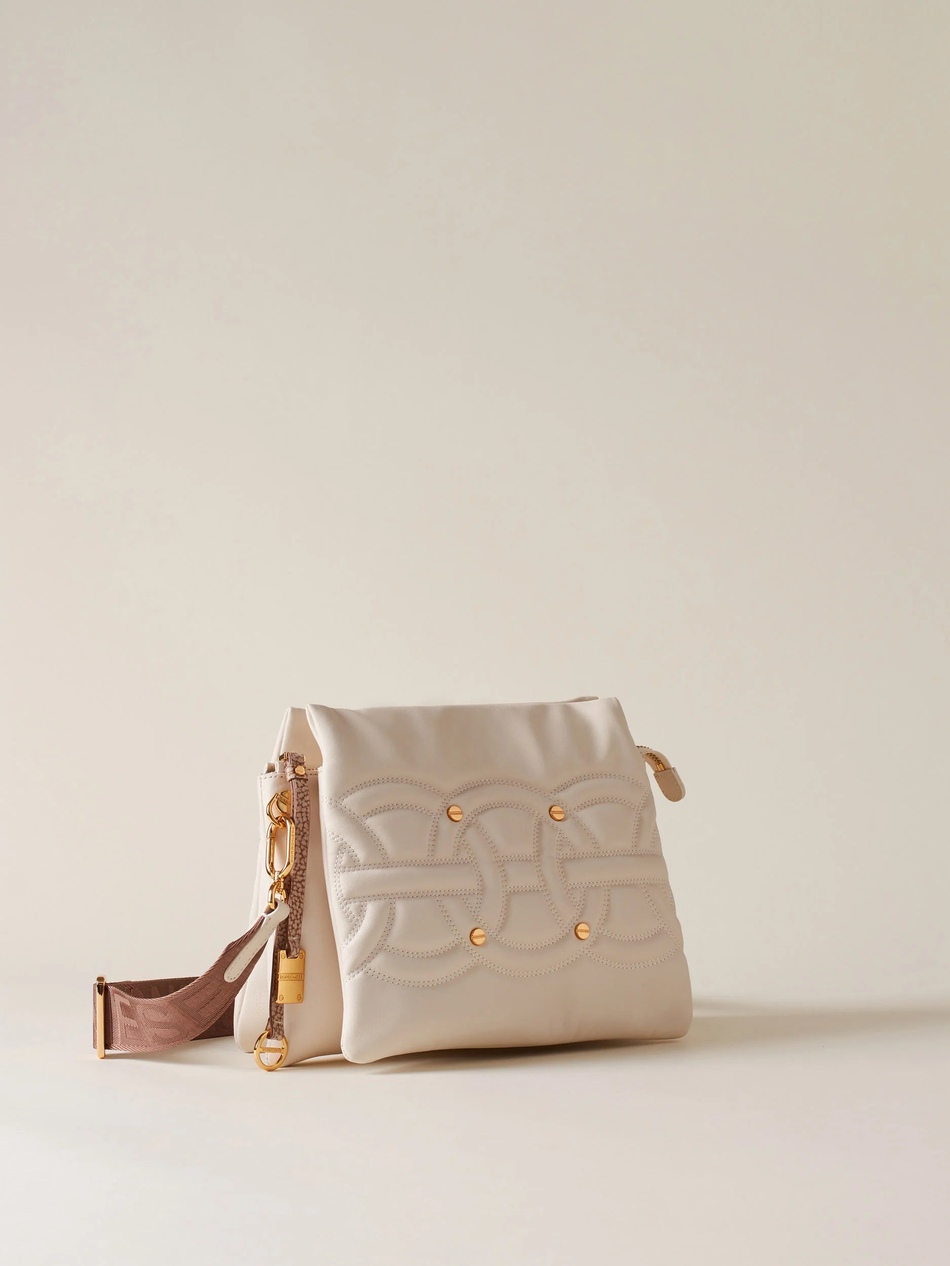 - Scomparto centrale chiuso con zip metallo e tirazip in Camoscio Op con elementi Decorativi a vite e placchetta logati