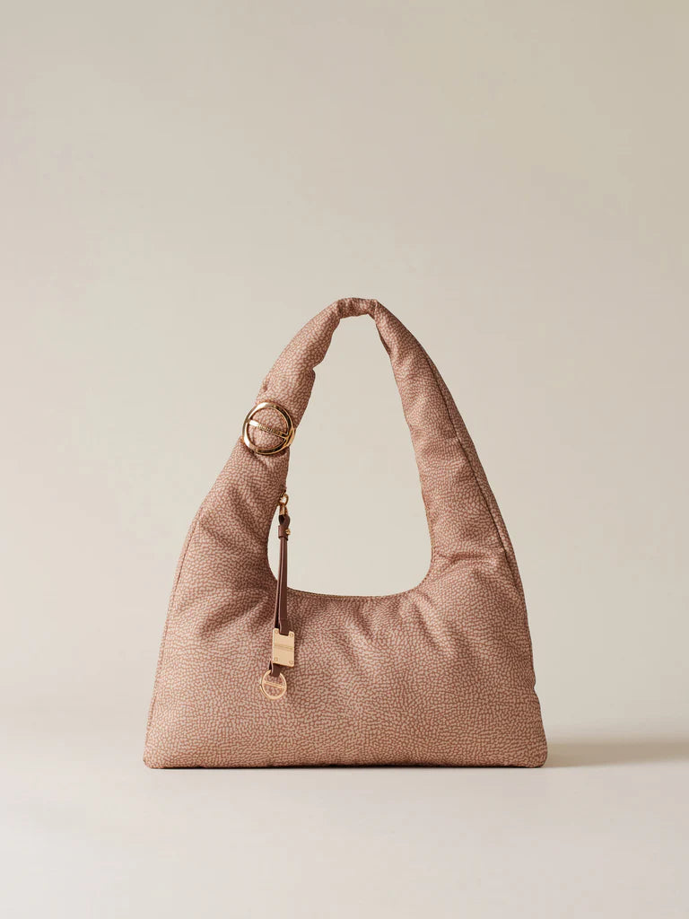 - Chiusura esterna con zip metallo e tirazip in pelle con elementi decorativi a vite e placchetta logati