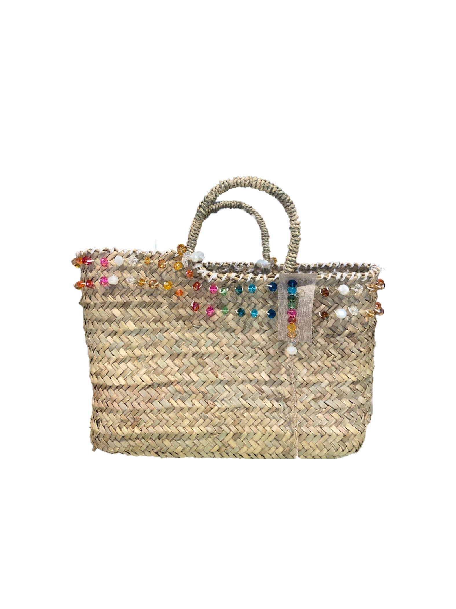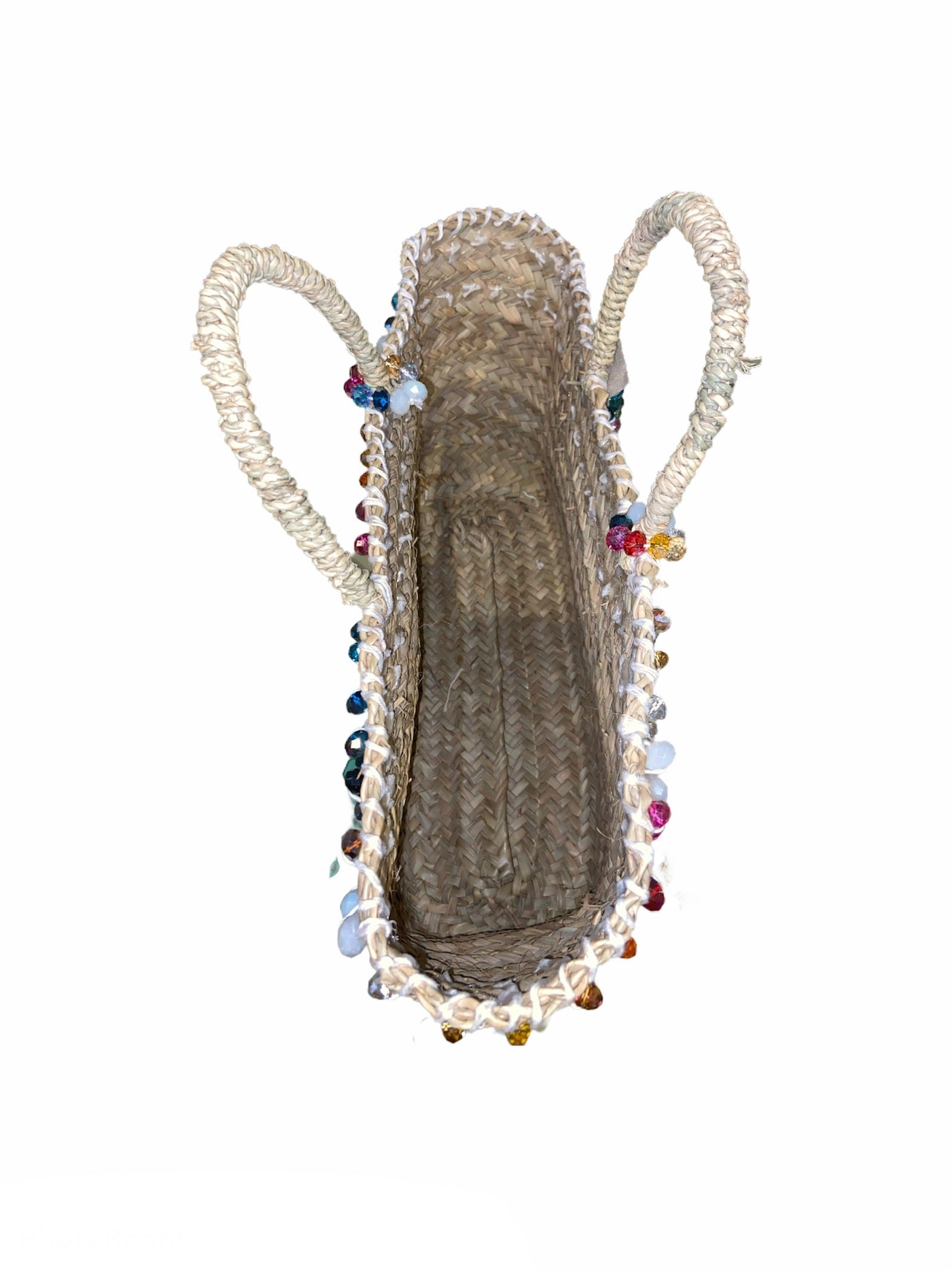 BORSA DA SPIAGGIA INTRECCIATA CON RICAMO DI CRISTALLI MULTICOLORI E IMPUNTURA REALIZZATA A MANO