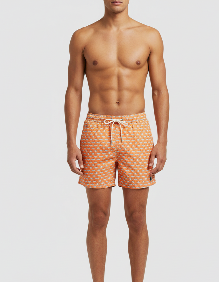 I pantaloncini da bagno di media lunghezza Man Lighting 70 sono progettati con un tessuto leggero che si asciuga rapidamente, guadagnandosi il nome Lighting. 70 è perché le fantasie scelte per questo modello evocano l'eleganza di quegli anni, anche in spiaggia. La cintura elasticizzata garantisce una vestibilità comoda, mentre gli occhielli logati sono posizionati strategicamente per drenare l'acqua ed evitare che i pantaloncini si gonfino. La coulisse in corda bianca con punta in filo rosso e l'assenza di componenti metalliche le donano un tocco retrò. Dotati di tasche laterali con cuciture alla francese e di una tasca posteriore applicata con chiusura con bottone, questi pantaloncini da bagno sono pratici ed eleganti. Inoltre, c'è una piccola tasca interna per monete per una maggiore comodità. La stampa all-over aggiunge un tocco di stile a questa versatile opzione di costume da bagno. Realizzati in poliestere riciclato al 100%, questi pantaloncini riflettono il nostro impegno per la sostenibilità.