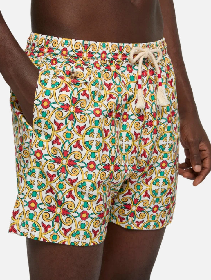 I pantaloncini da bagno di media lunghezza Man Lighting 70 sono progettati con un tessuto leggero che si asciuga rapidamente, guadagnandosi il nome Lighting. 70 è perché le fantasie scelte per questo modello evocano l'eleganza di quegli anni, anche in spiaggia, come maioliche e stampe gipsy. La cintura elasticizzata garantisce una vestibilità comoda, mentre gli occhielli logati sono posizionati strategicamente per drenare l'acqua ed evitare che i pantaloncini si gonfino. La coulisse in corda bianca con punta in filo rosso e l'assenza di componenti metalliche le donano un tocco retrò. Dotati di tasche laterali con cuciture alla francese e di una tasca posteriore applicata con chiusura con bottone, questi pantaloncini da bagno sono pratici ed eleganti. Inoltre, c'è una piccola tasca interna per monete per una maggiore comodità. La stampa all-over aggiunge un tocco di stile a questa versatile opzione di costume da bagno. Realizzati in poliestere riciclato al 100%, questi pantaloncini riflettono il nostro impegno per la sostenibilità.