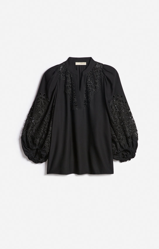 Romantica e sofisticata, la camicetta Bell affascina con i suoi dettagli in pizzo traforato e i volumi femminili, creando un gioco di trasparenza sottile ed elegante.
