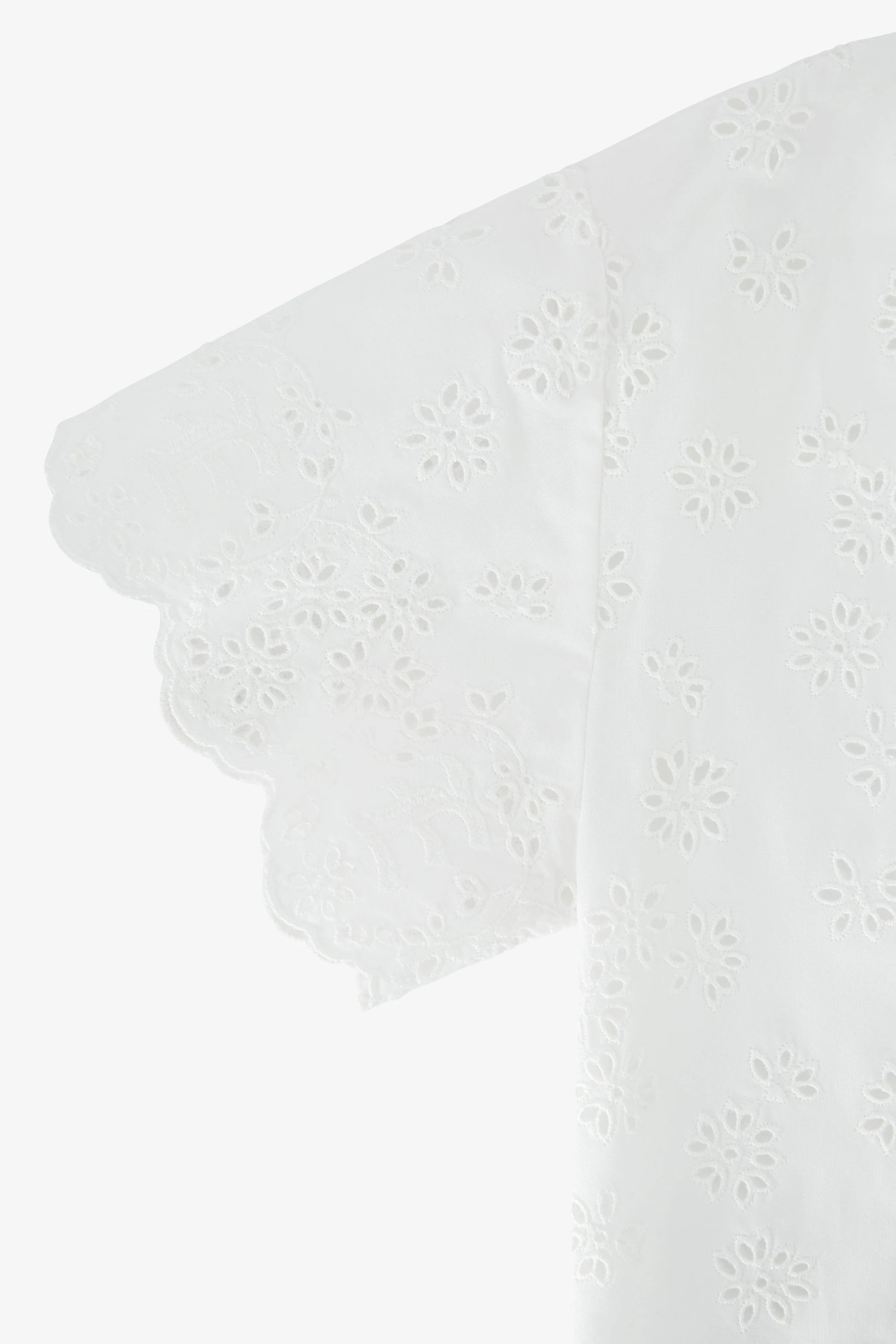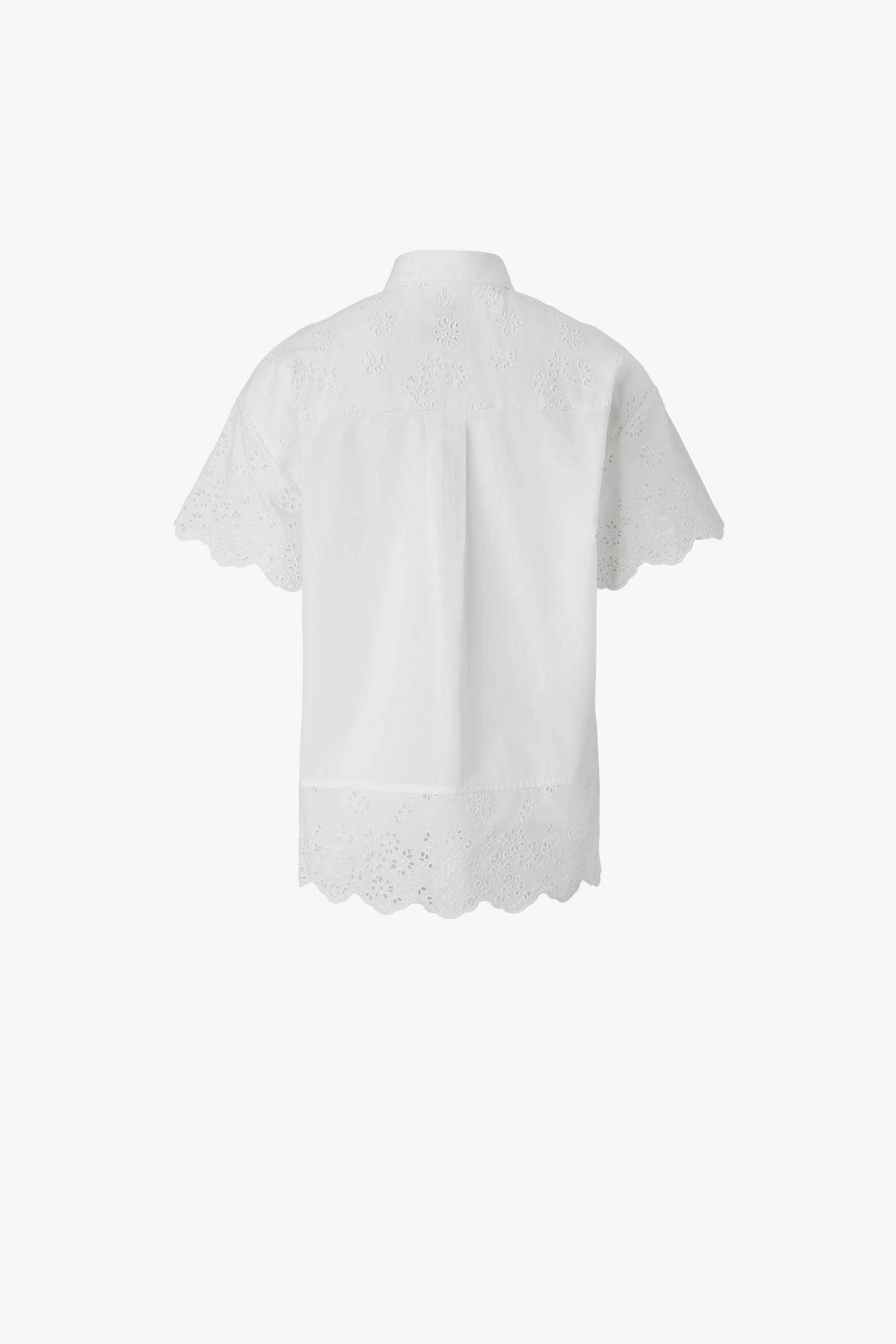 Camicetta a mezze maniche in pizzo sangallo. La camicia a maniche corte presenta abbottonatura centrale a quattro bottoni sulla pettorina e colletto italiano. Il fondo è decorato da una balza in tono, sempre in sangallo. Le maniche e la balza hanno orlo frastagliato, arricchito da un dettaglio esclusivo: il logo monogram gotico del brand ricamato fra i fiorellini sangallo. Il motivo sangallo si estende anche sul retro della camicetta, su maniche, carrè e balza, mentre la parte centrale in cotone liscio è arricchita da un cannoncino.