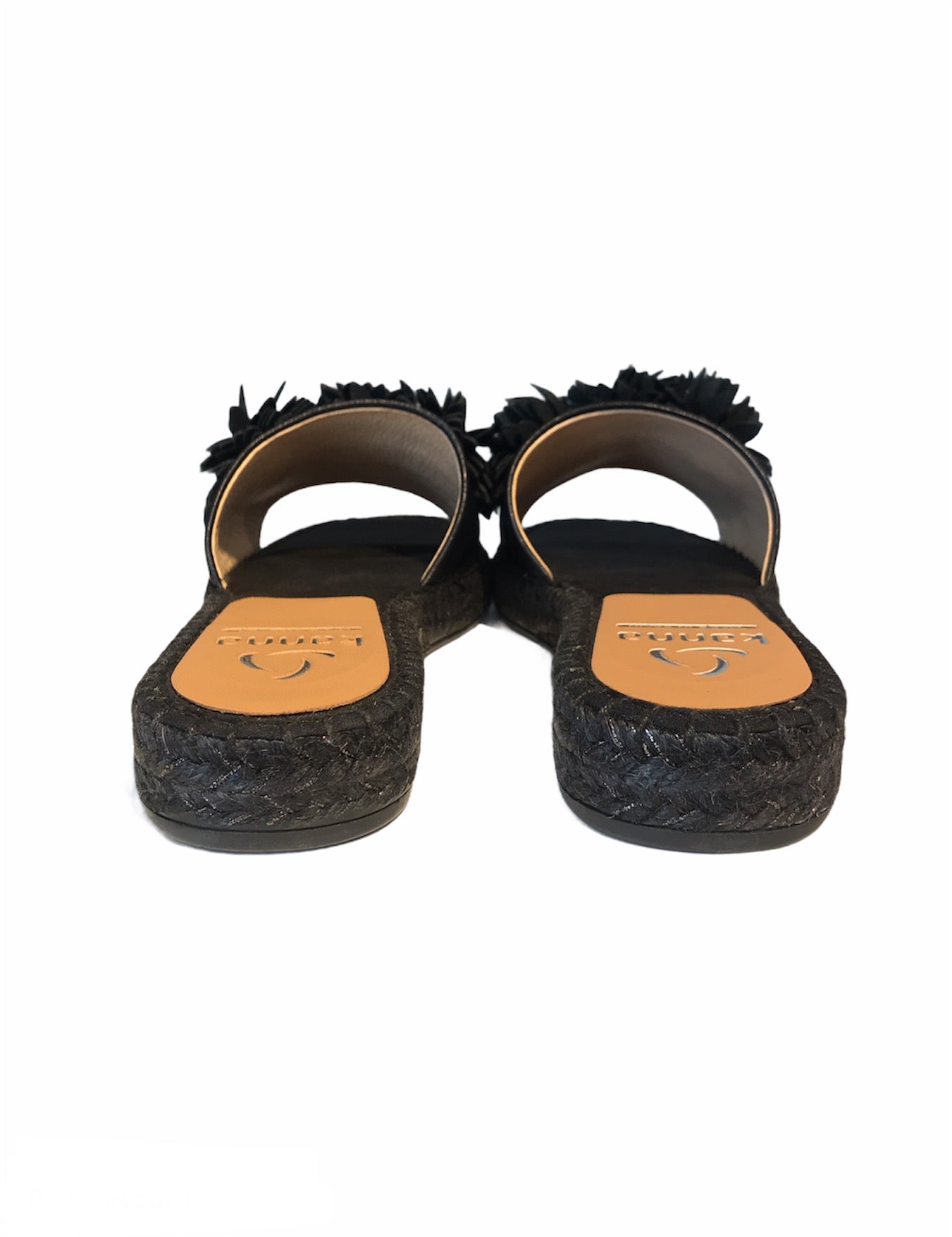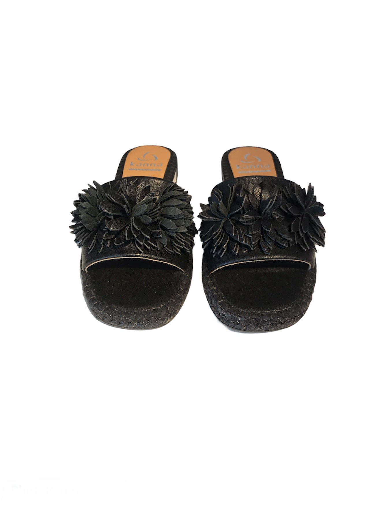 Ciabatta KANNA in pelle nero con accessorio fiorito nero, zeppetta in corda alta cm 2