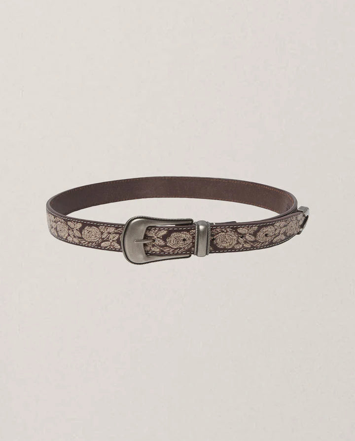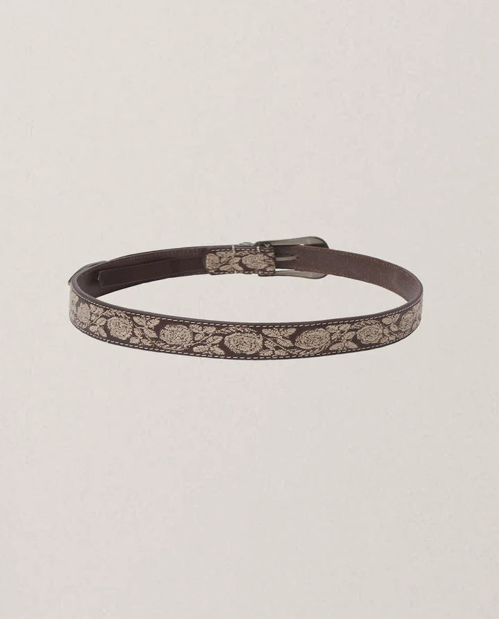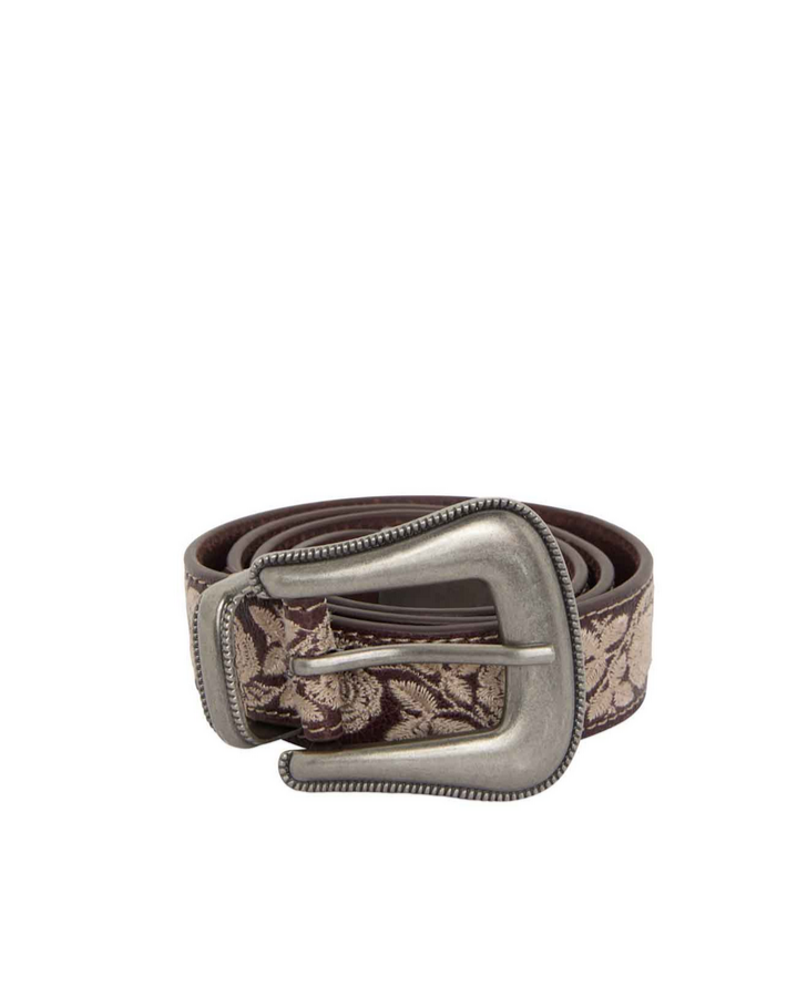 Cintura ricamata marrone Maison Hotel di ispirazione country folk in vera pelle nera con fibbia argento.