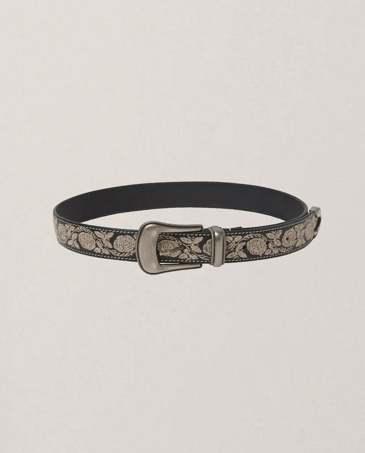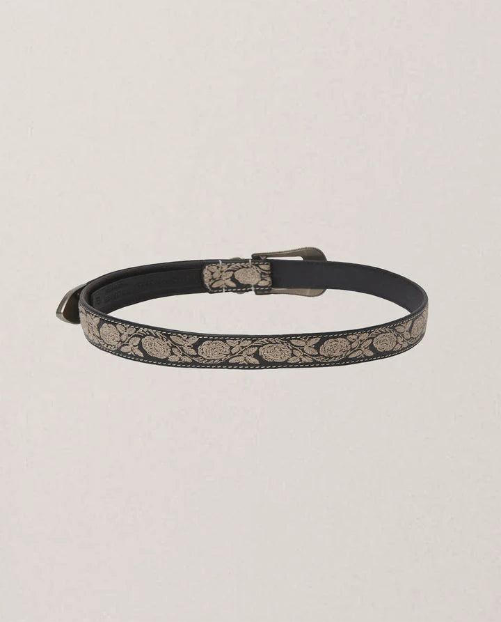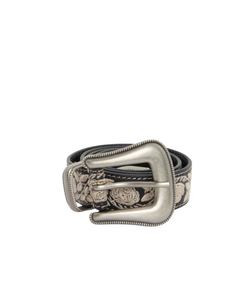 Cintura ricamata nera Maison Hotel di ispirazione country folk in vera pelle nera con fibbia argento.