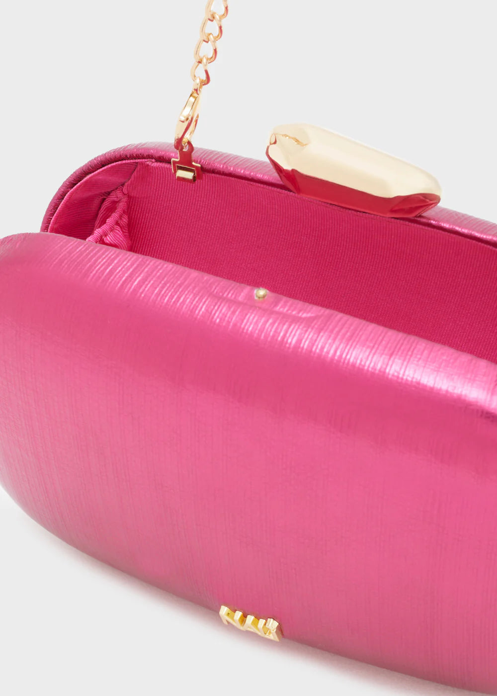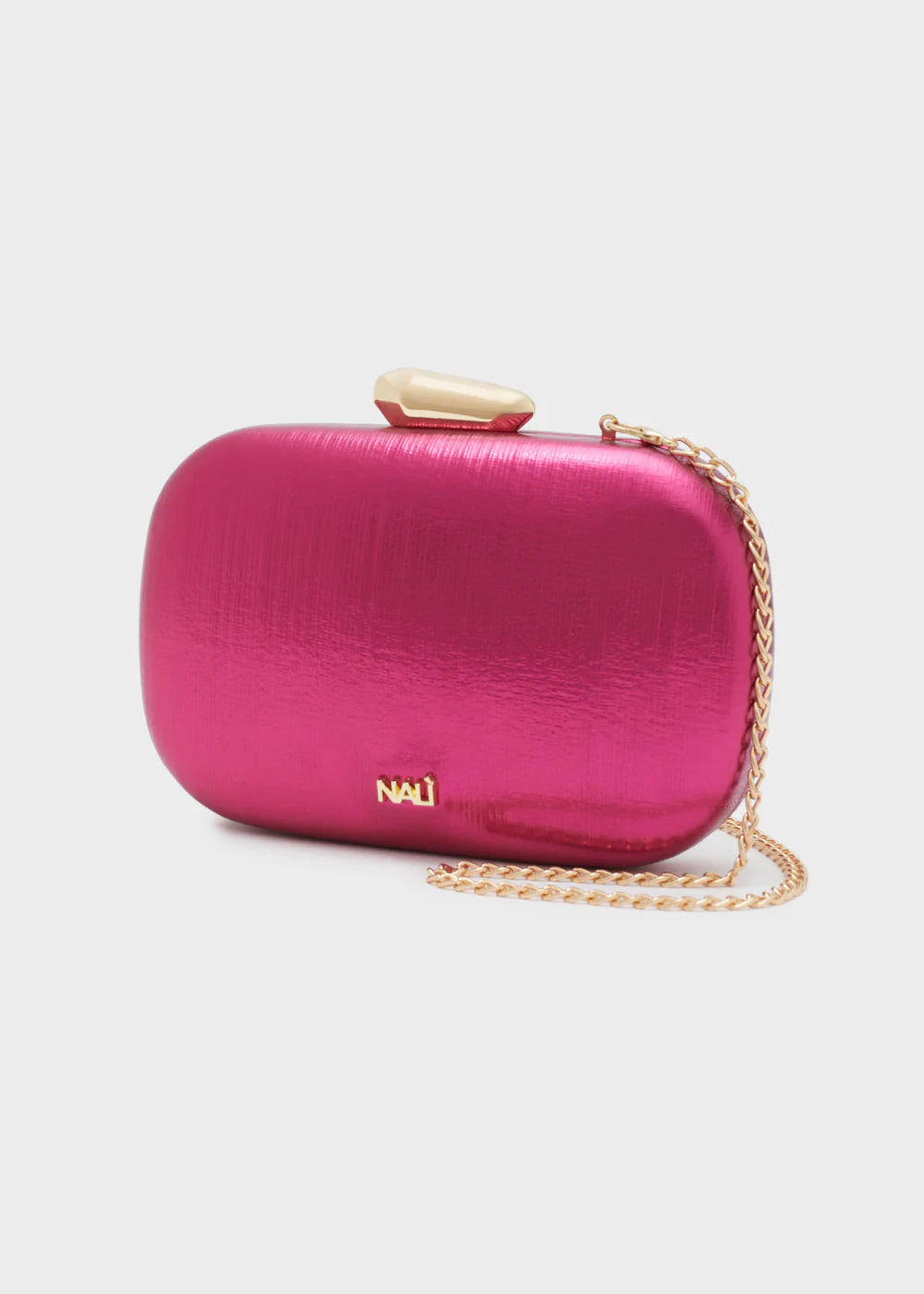 La clutch Giada di Nalì in tessuto metallizzato e con chiusura a scatto dalla forma rigida e ovale. Da indossare a mano o con la catena a tracolla. Donerà un tocco di colore, eleganza e originalità ai vostri look.