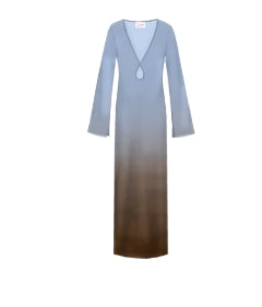 Abito lungo in georgette sfumata degrade' dai toni dell'azzurro al marrone, manica ampia, spacchi laterali, scollo v.
