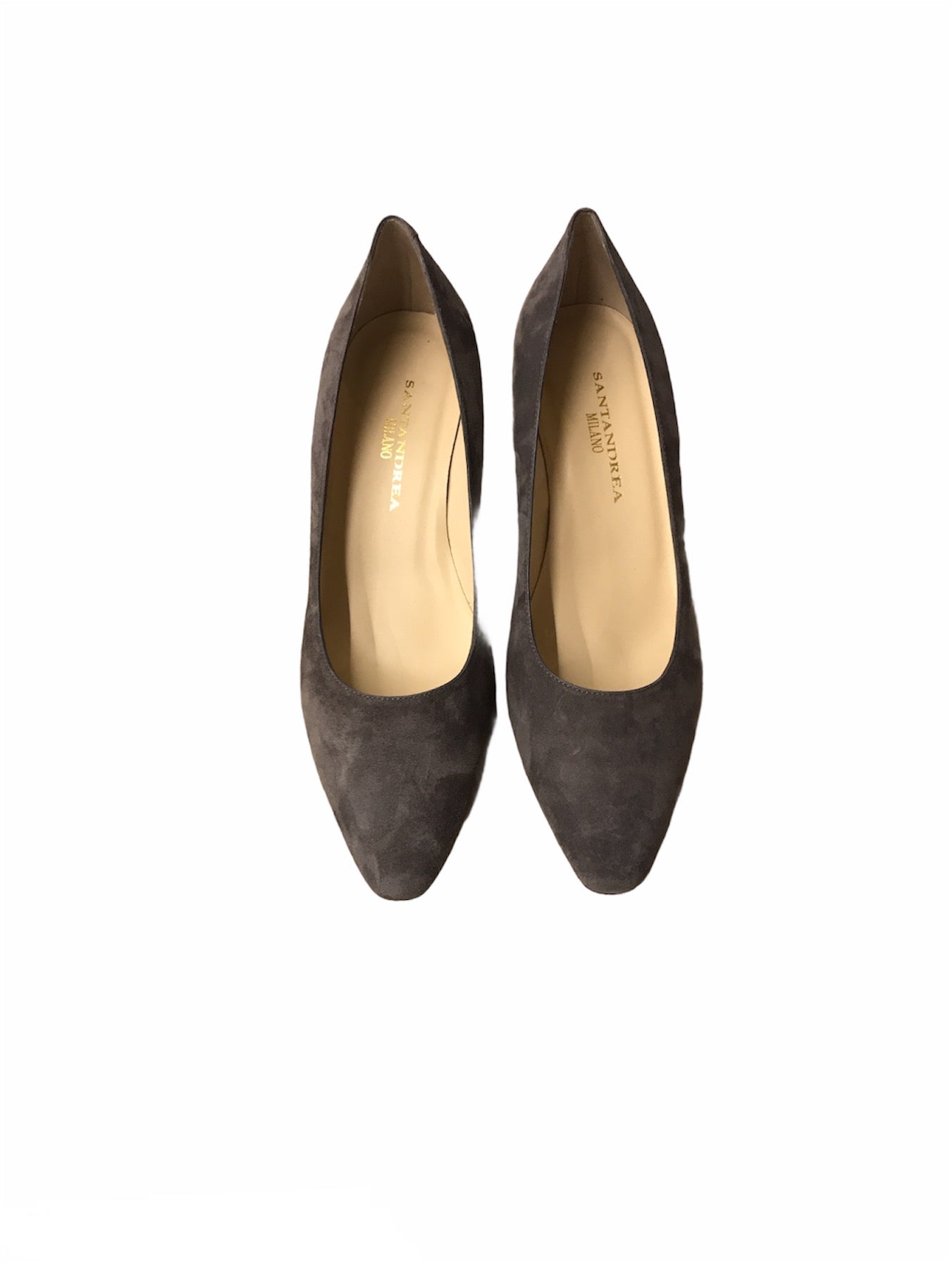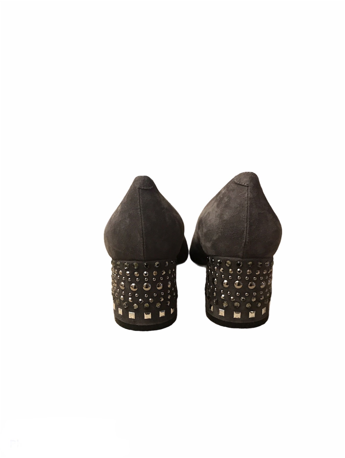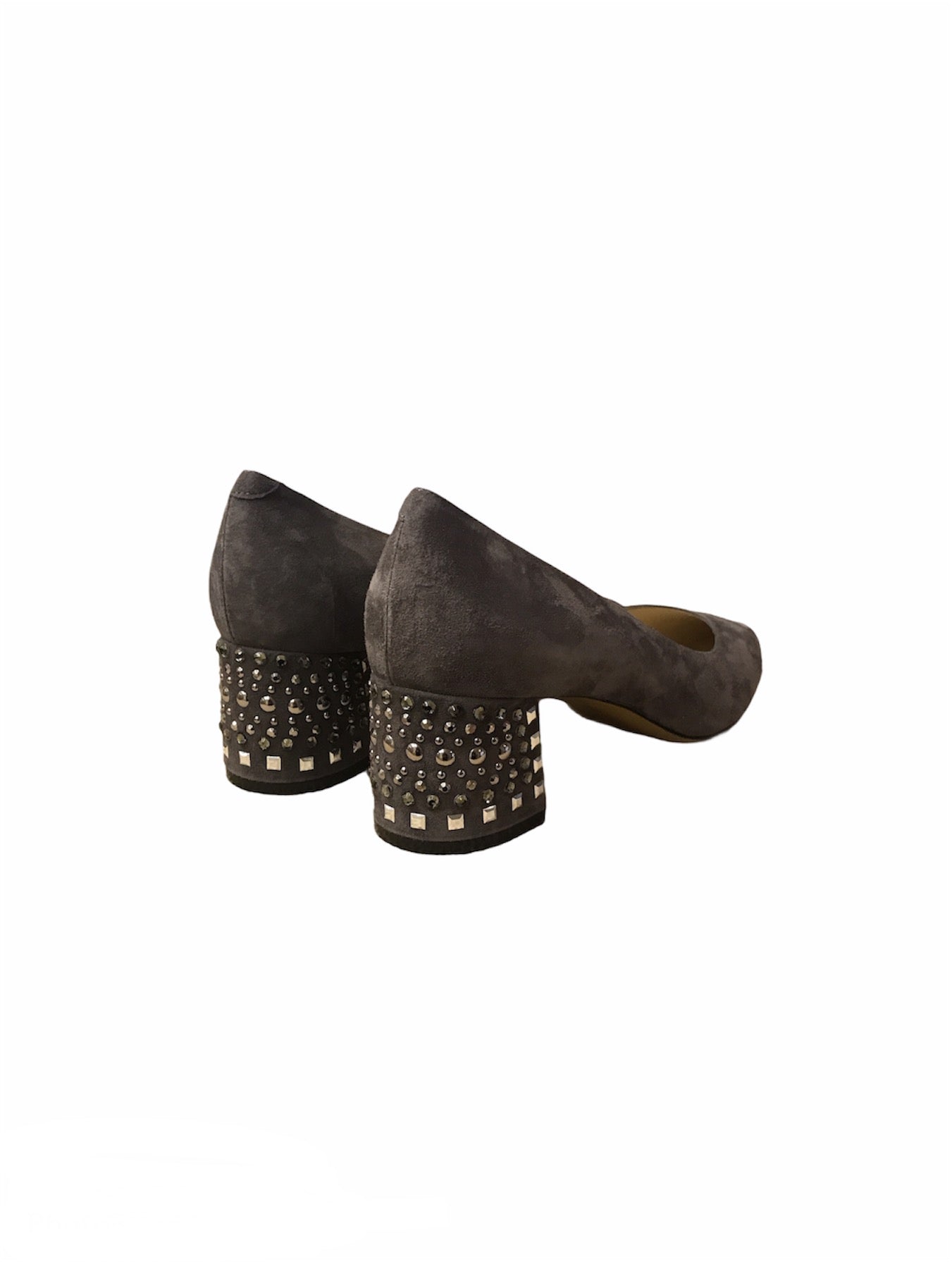 Scarpa SANTANDREA in camoscio grigio , tacco cm 50 impreziosito da pietre tono su tono e borchie argento.Fodere in pelle nel colore naturale e suola di cuoio.