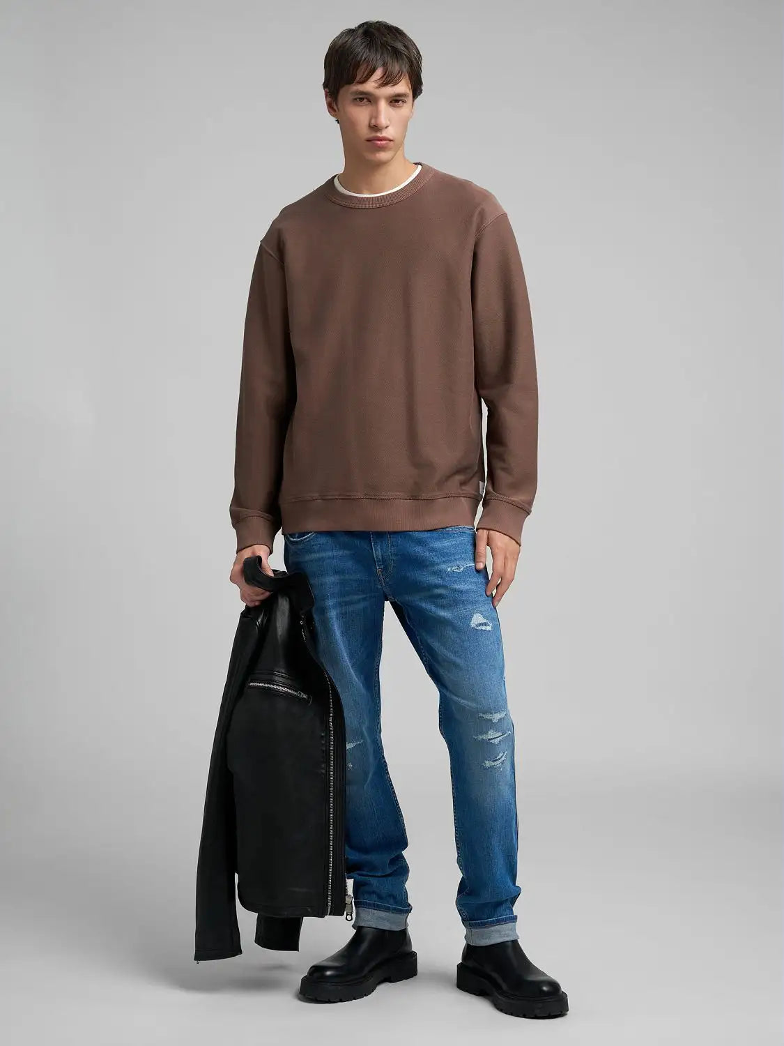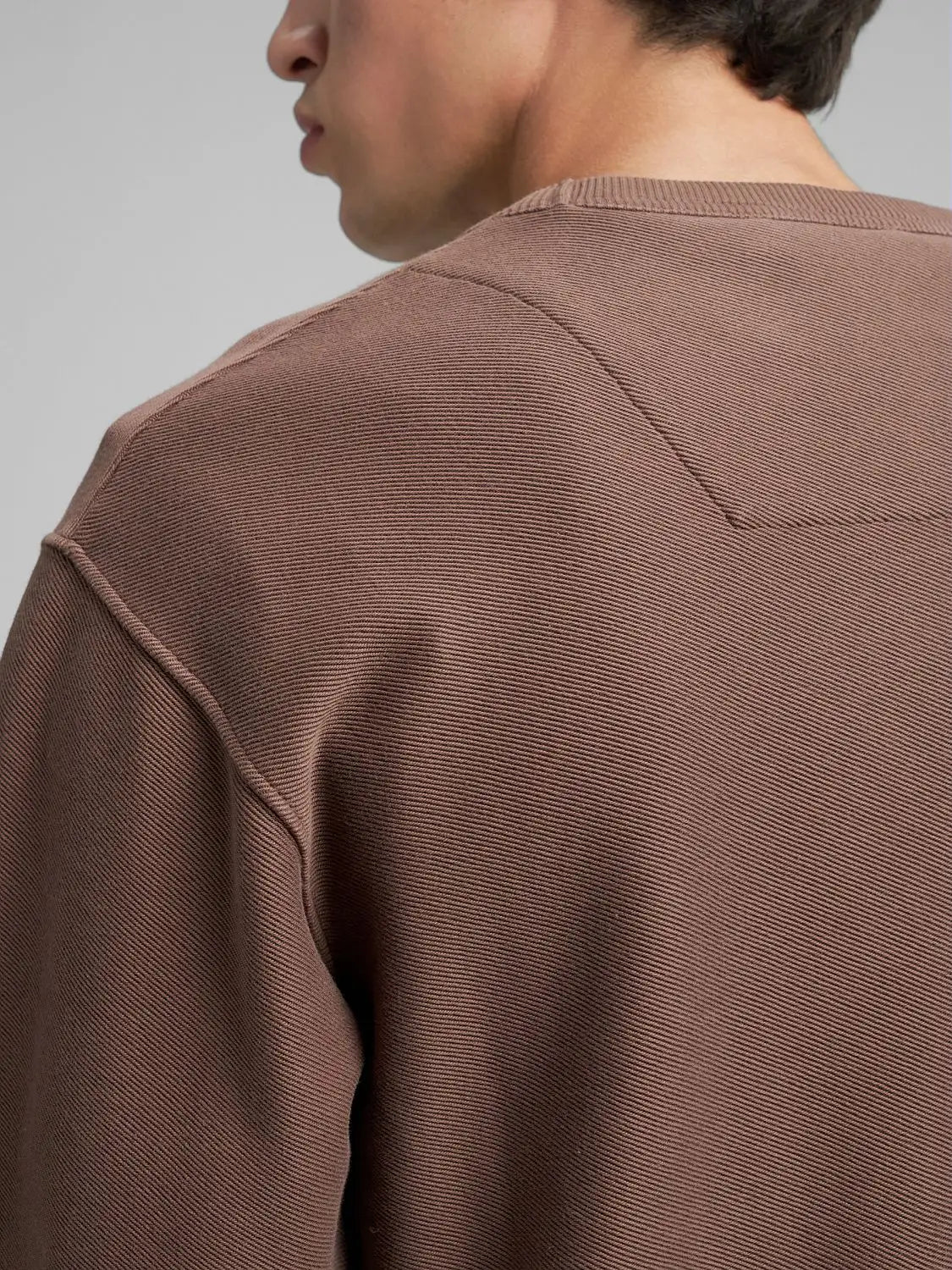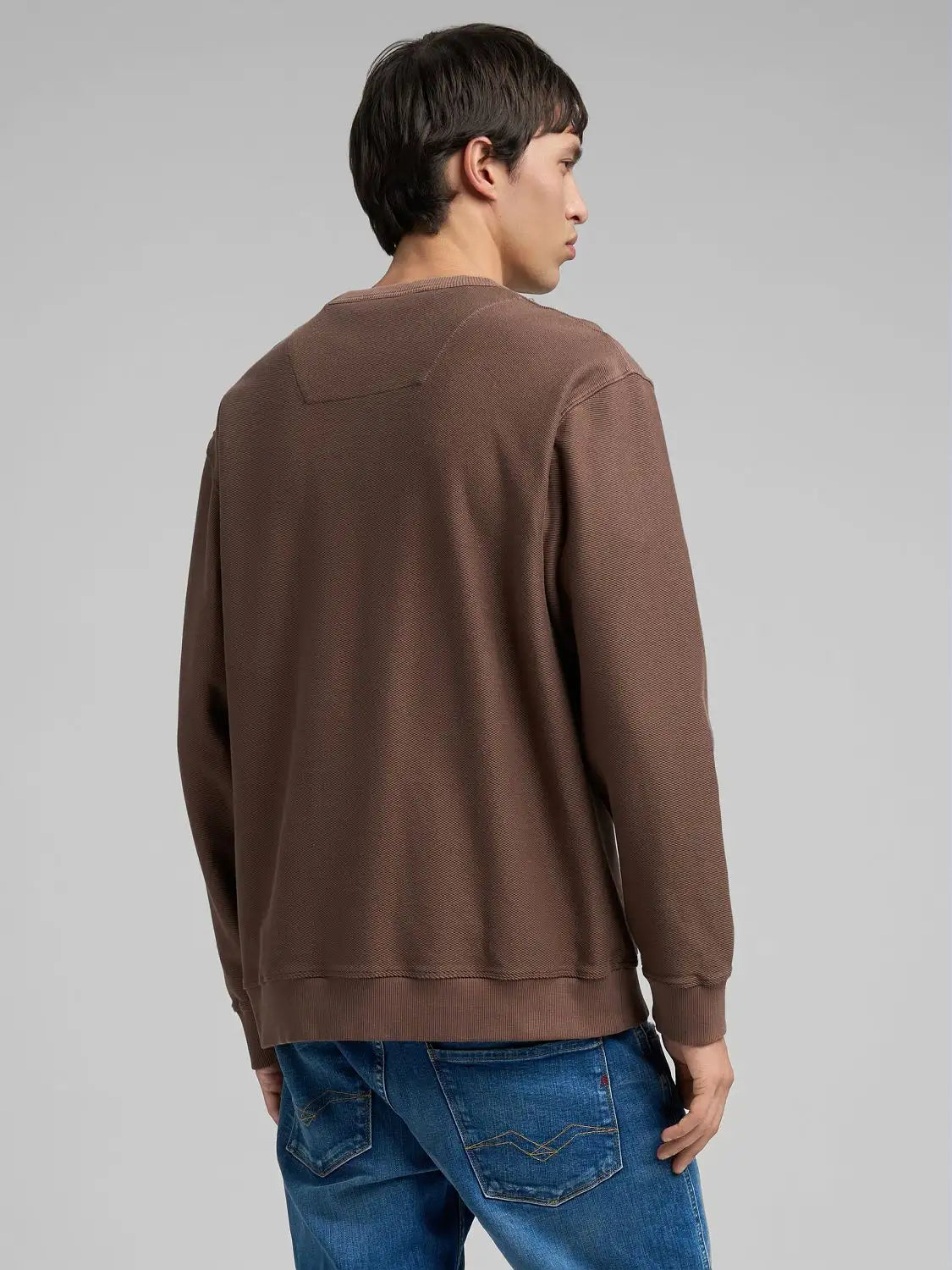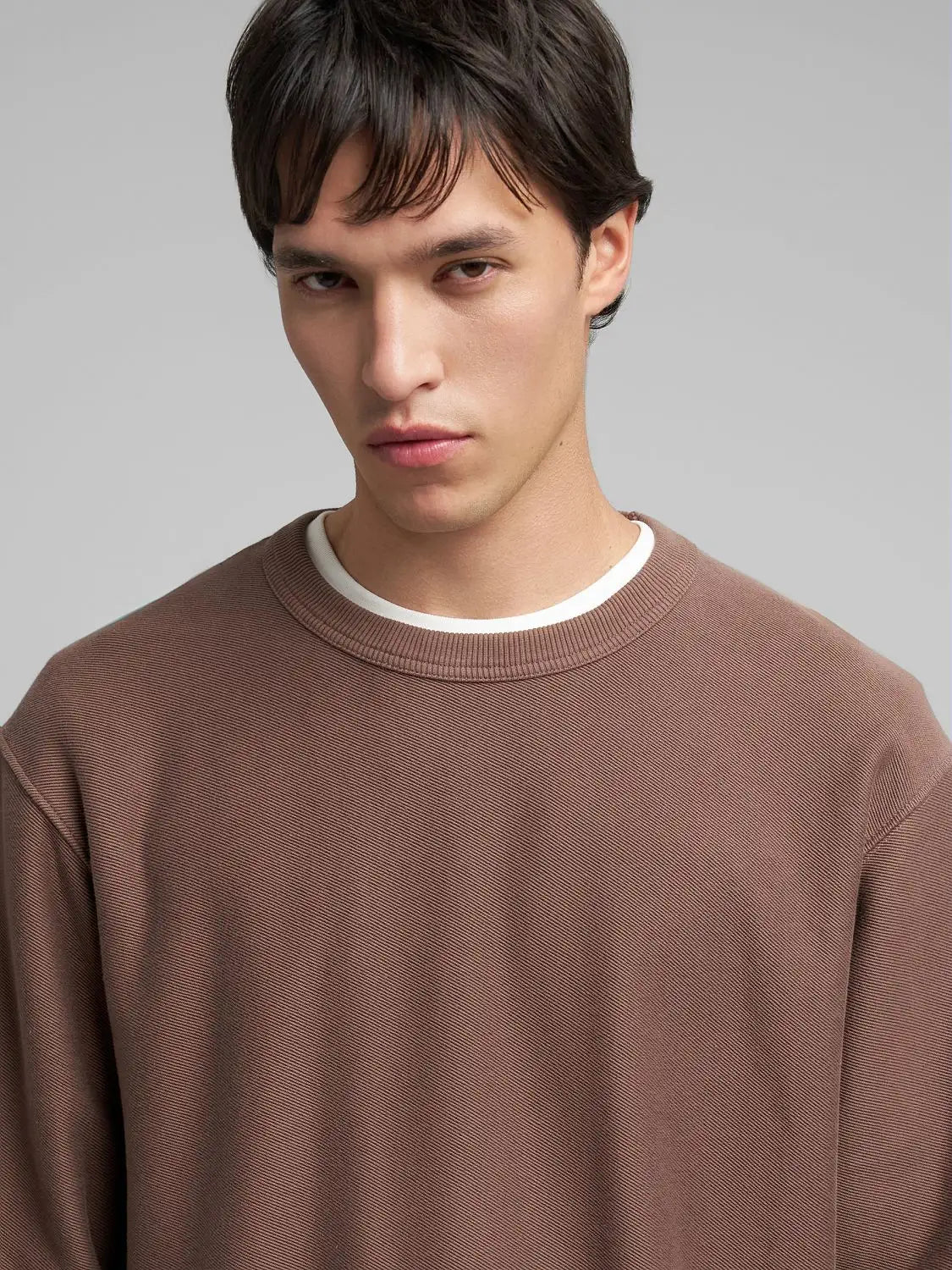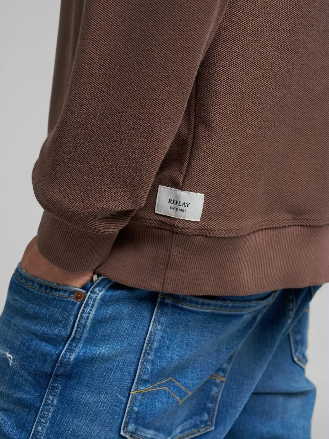 Felpa girocollo realizzata in fleece di puro cotone con lavorazione interlock diagonale. Il modello a maniche lunghe e a spalla scesa con vestibilità regolare presenta una lavorazione a costine su girocollo, polsini e fondo capo. Il capo si distingue inoltre per la cucitura a vista sul retro.