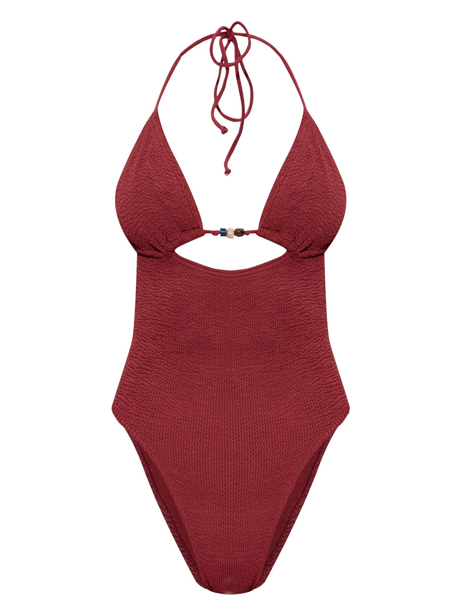 Meet the Beaded Fowler One Piece, a contemporary take on the classic one piece. This style features a beaded cut out keyhole, and a tie-back halter neck with an open back. Handmade in Australia from The Authentic Crinkle™.