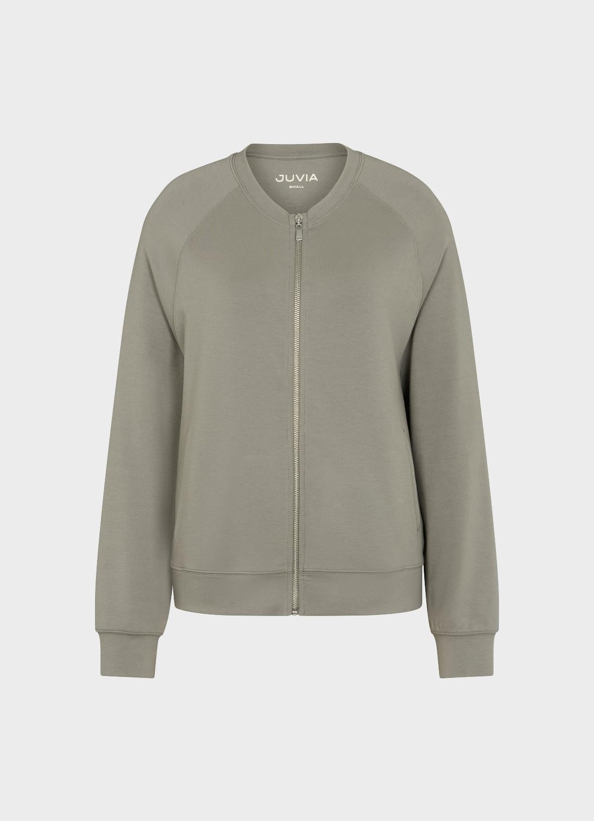 Felpa JUVIA modello Gemma è una giacca bomber con chiusura zip in colore grigio tortora in jersey