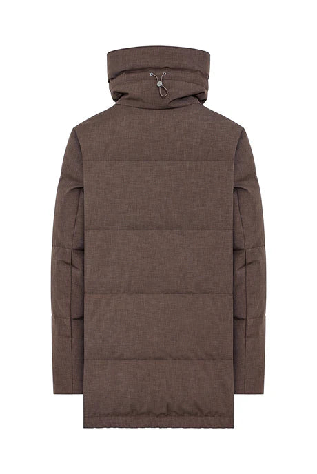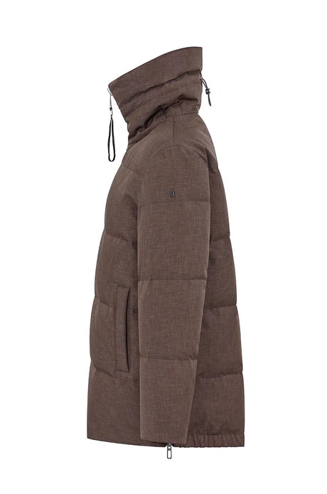 Piumino caratterizzato da ampio collo a cratere regolabile con coulisse con dettaglio di costina in tessuto tecnico superlight al suo interno. Chiusura frontale con zip doppio cursore con dettaglio di tira zip, tasche laterali a filetto con automatici e fianchi apribili al fondo con zip. Polsino interno in maglia tecnica e elastico nascosto al fondo dietro.
