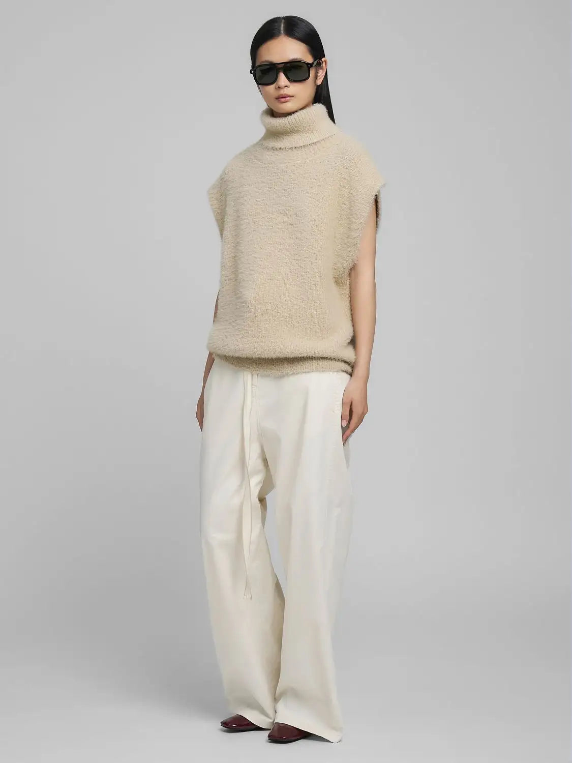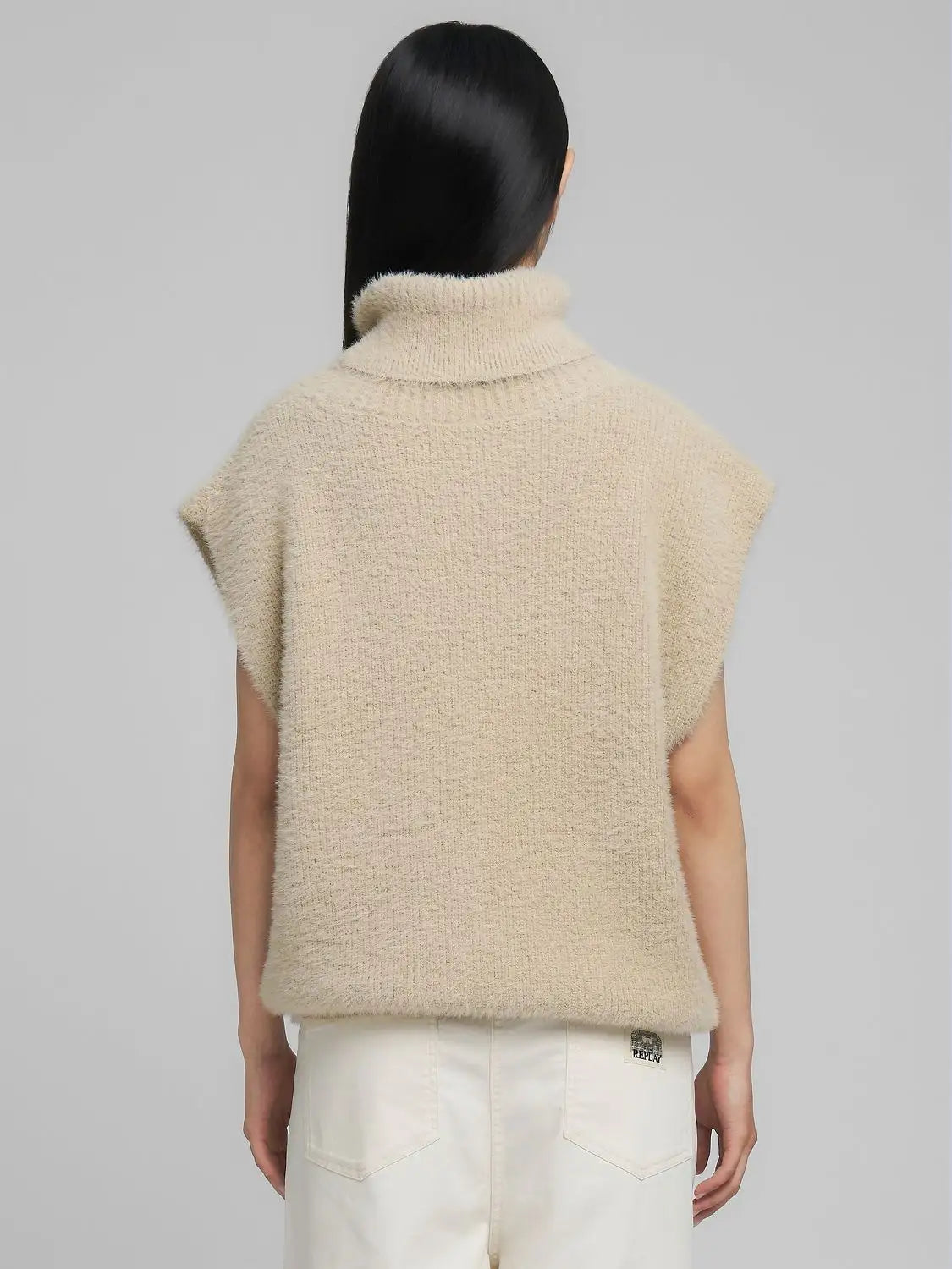 Pullover a collo alto realizzato in filato tecnico effetto hairy, per una sensazione di comfort e morbidezza sulla pelle. Il modello smanicato si distingue per il giromanica molto ampio e per il fondo capo rimborsato con bordo a costine.