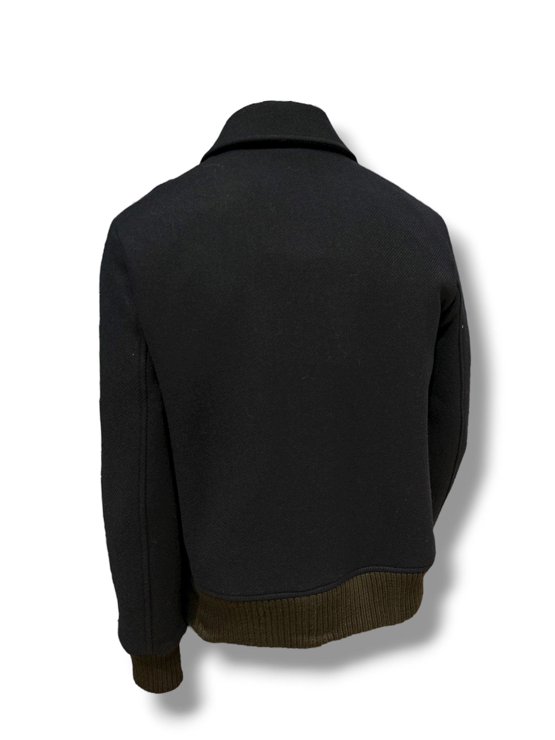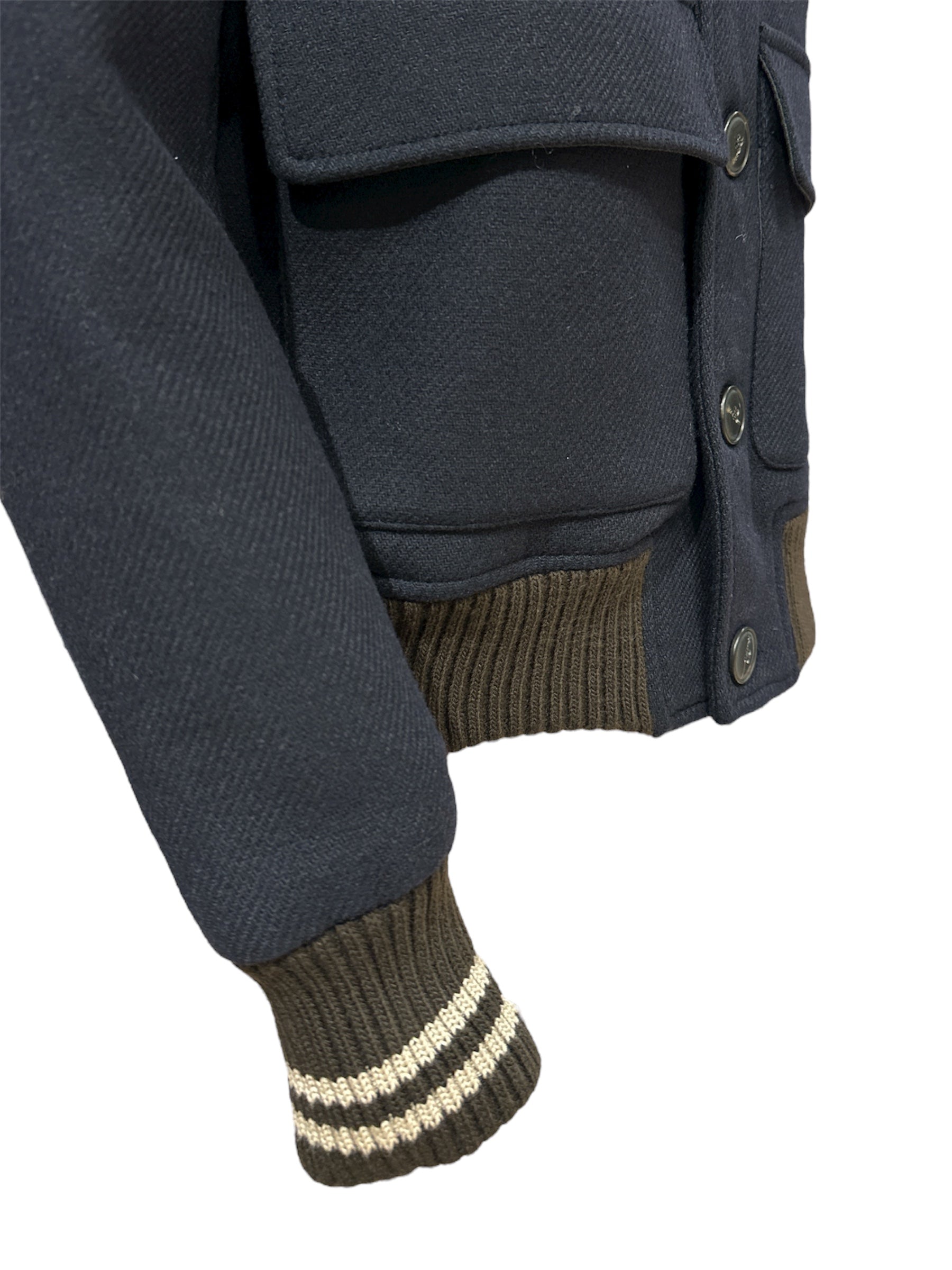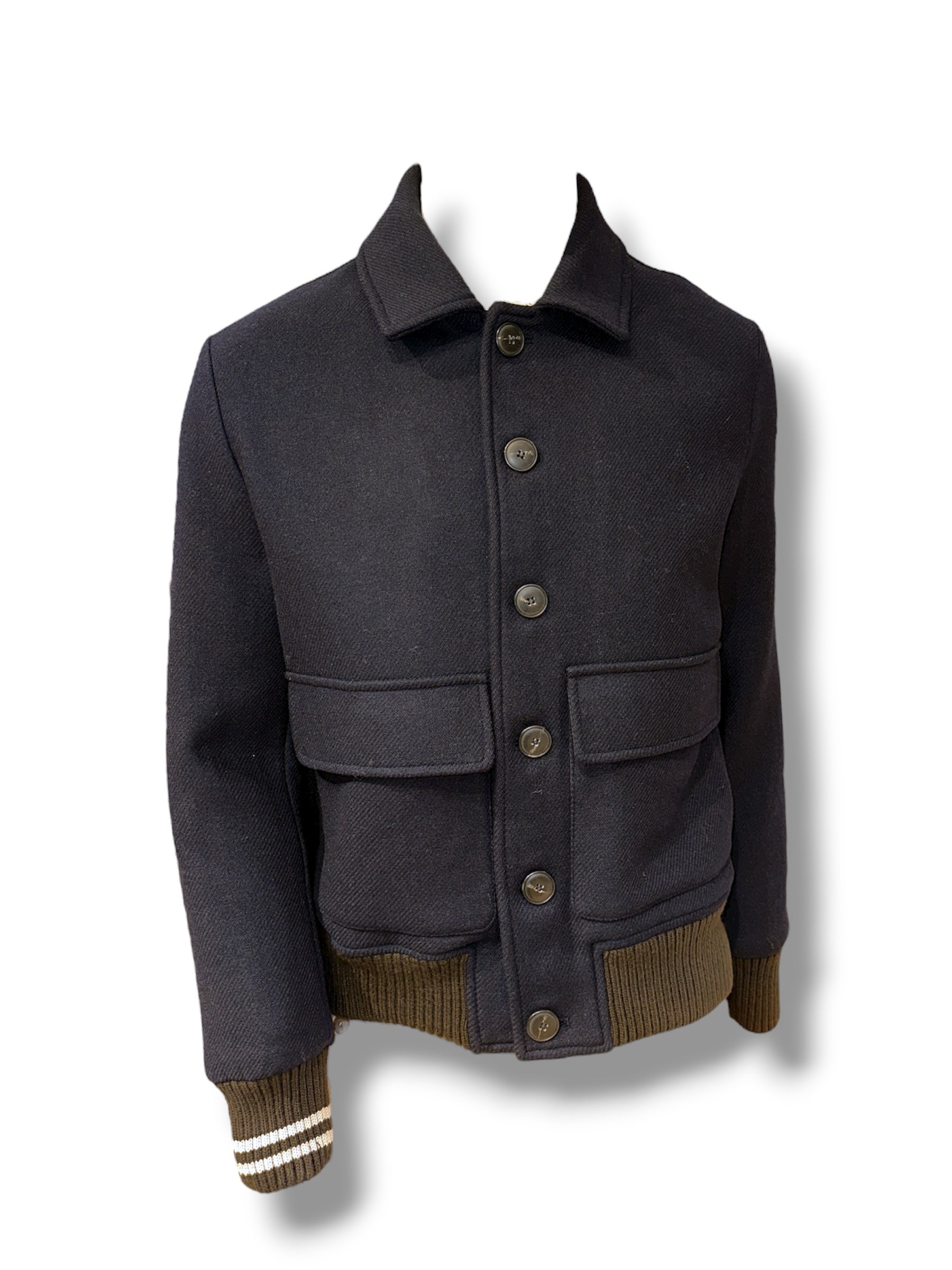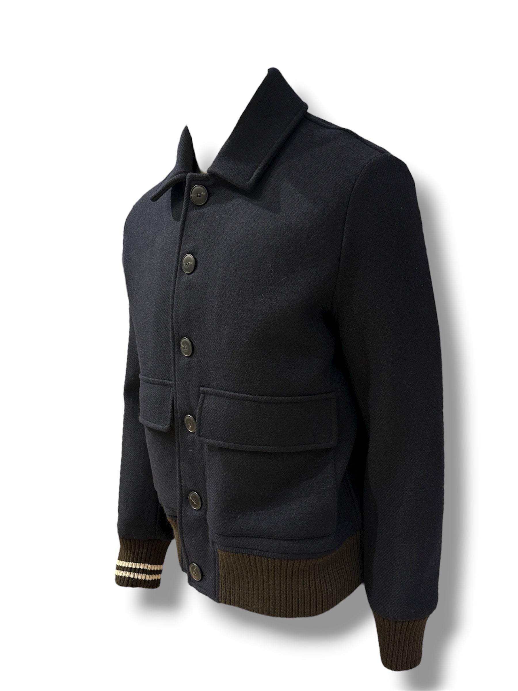 Panno misto lana blu navy con dettagli marroni in maglia, bottoni in corno testa moro