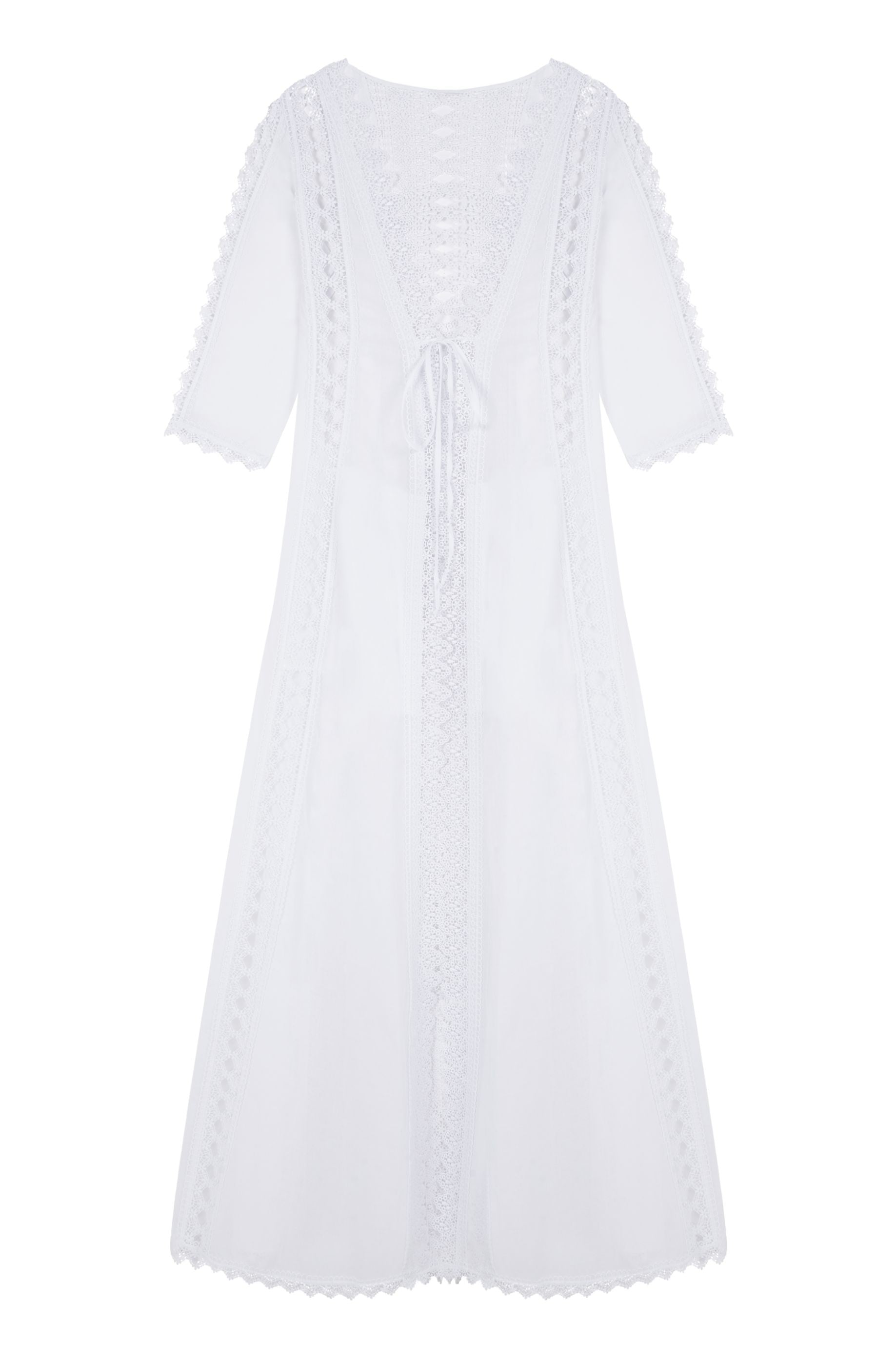 Rock Ali with a backless bathingsuit or bikini to emphasise the guipure back panels; Summer is a time for accentuating the golden glow of your skin, and Ali allows you to do so. With pointed guipure sleeve edging and maxi length, Ali is the ideal accompaniment to your Summer day or evening look.