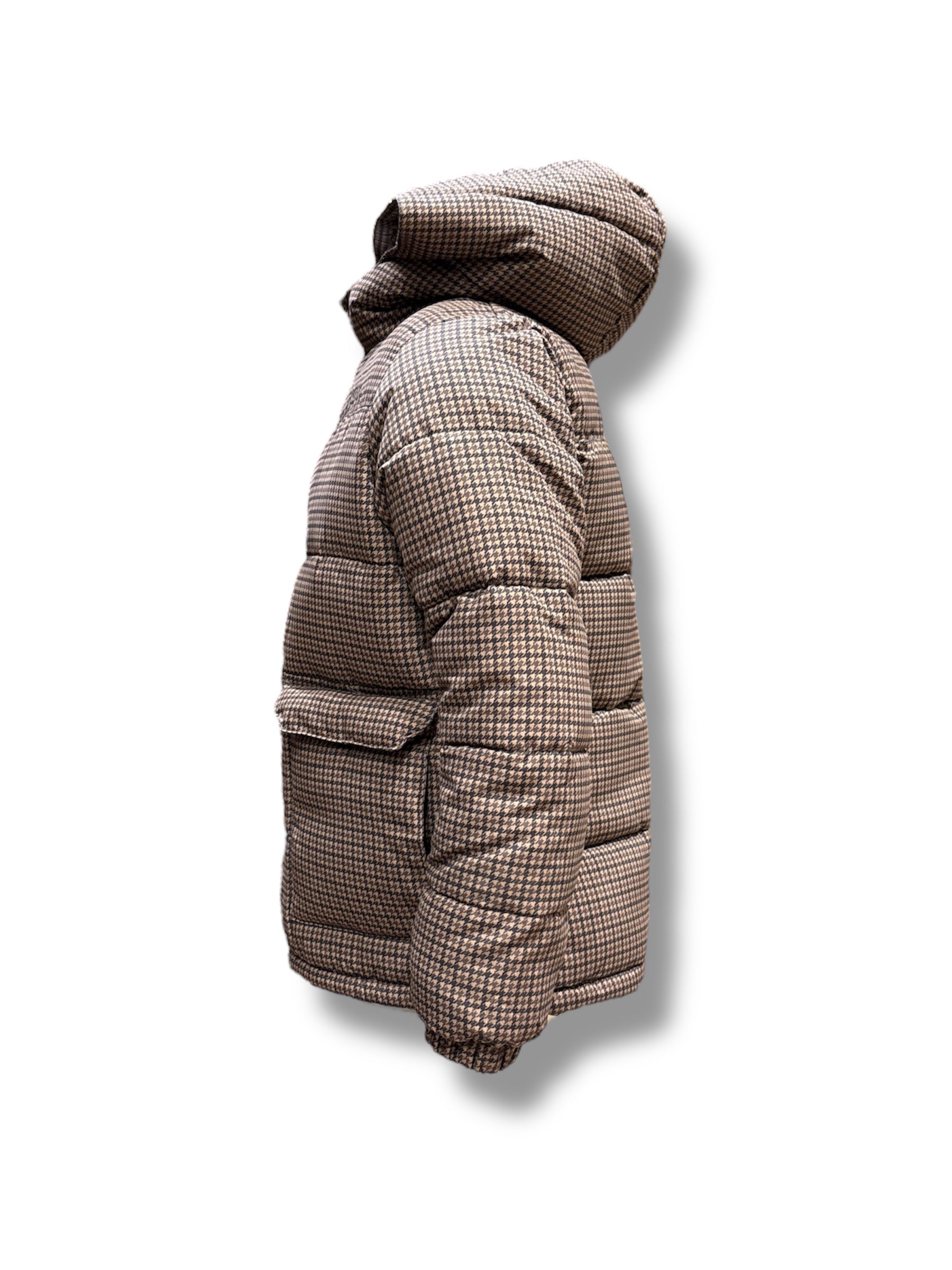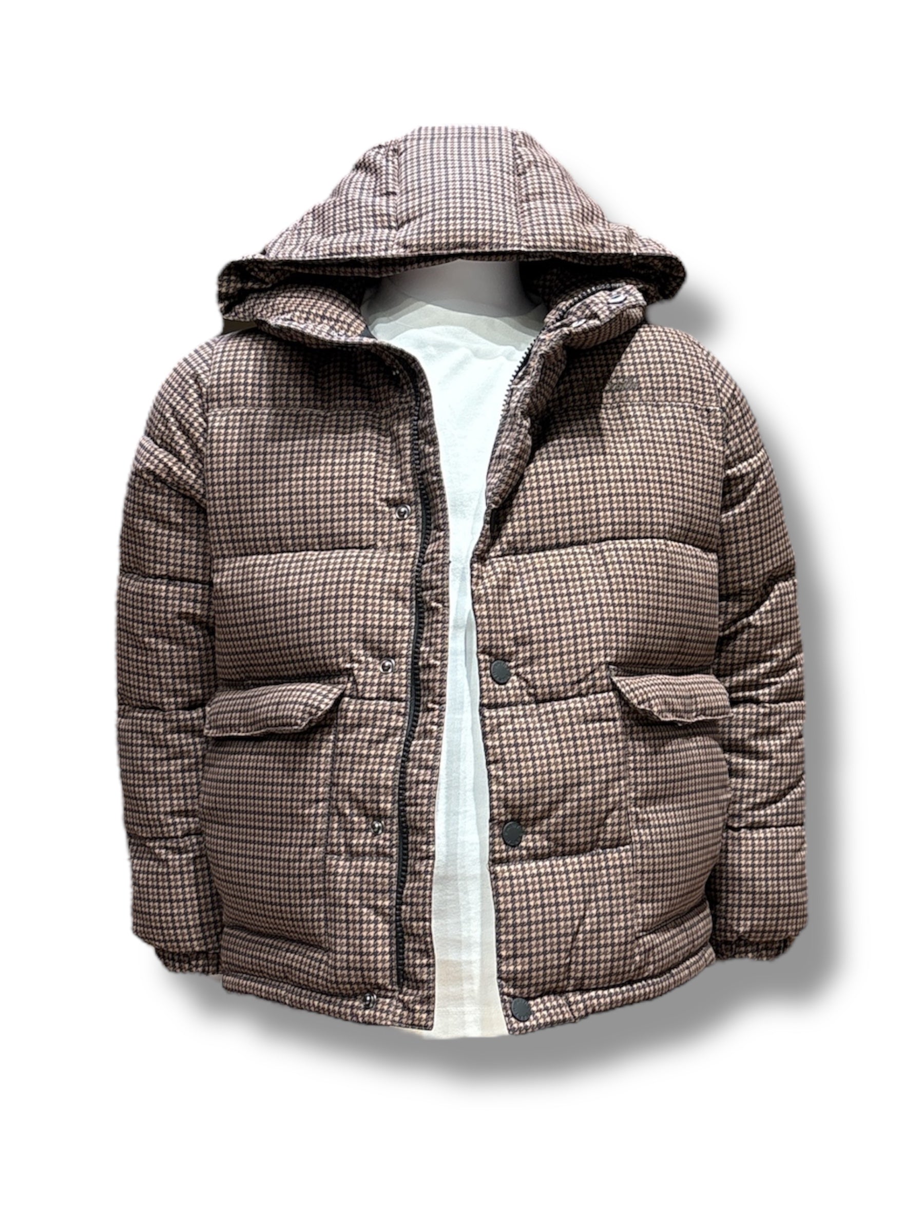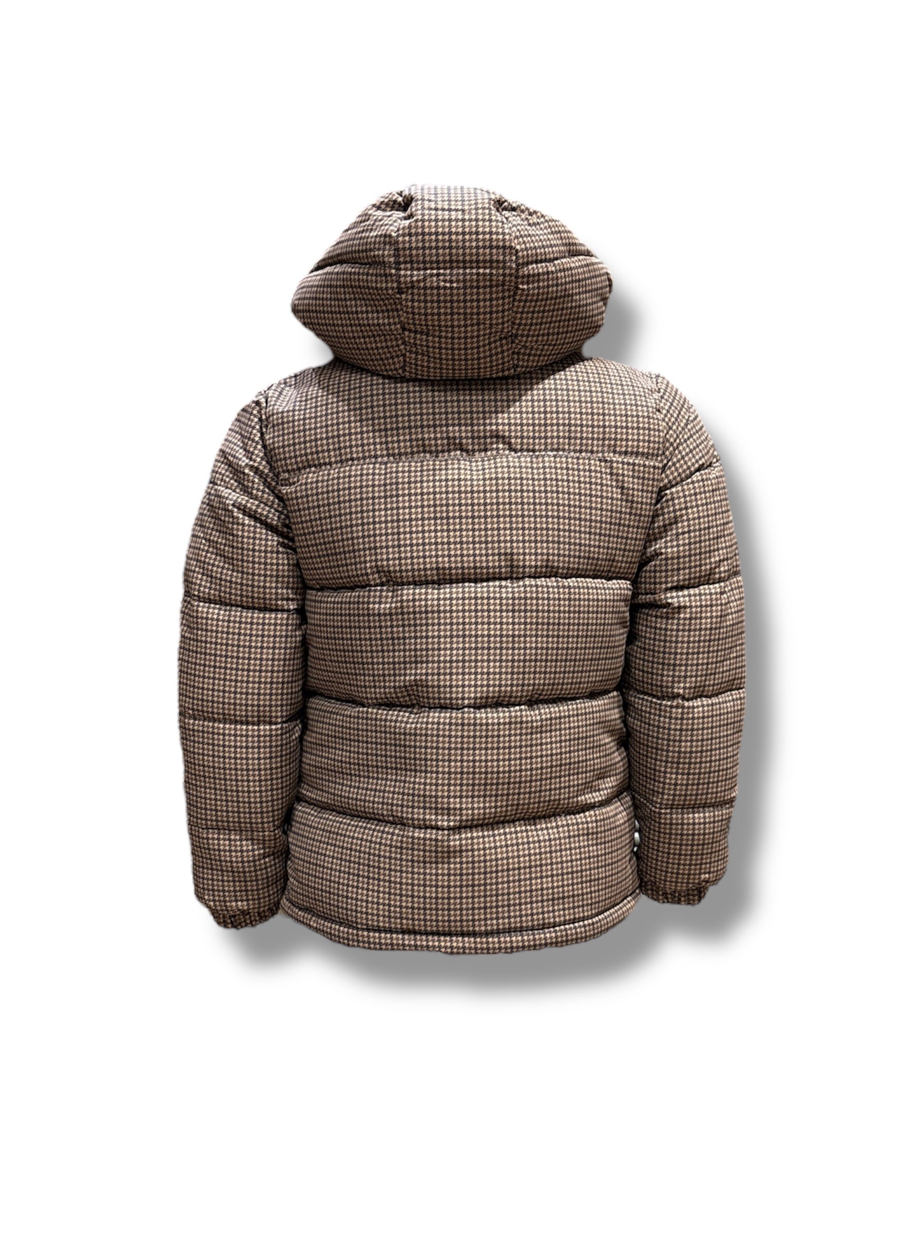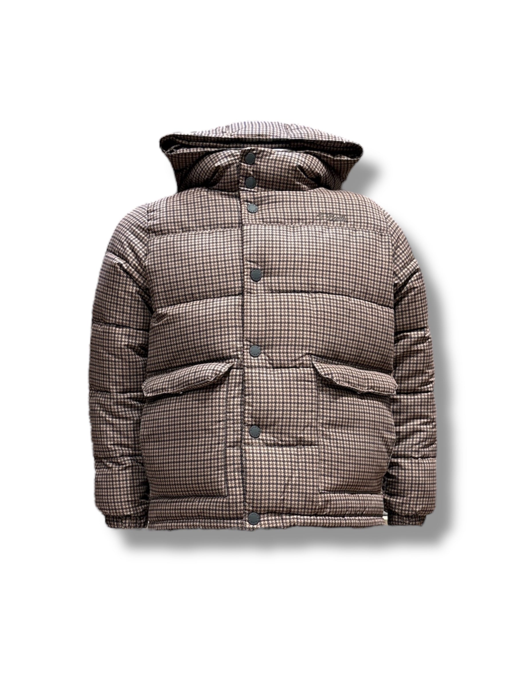 Giubbino invernale pesante Saint Barth imbottito per bambino, uguale al modello uomo per look mini me, colore micro fantasia quadretti marrone, nylon impermeabile.
