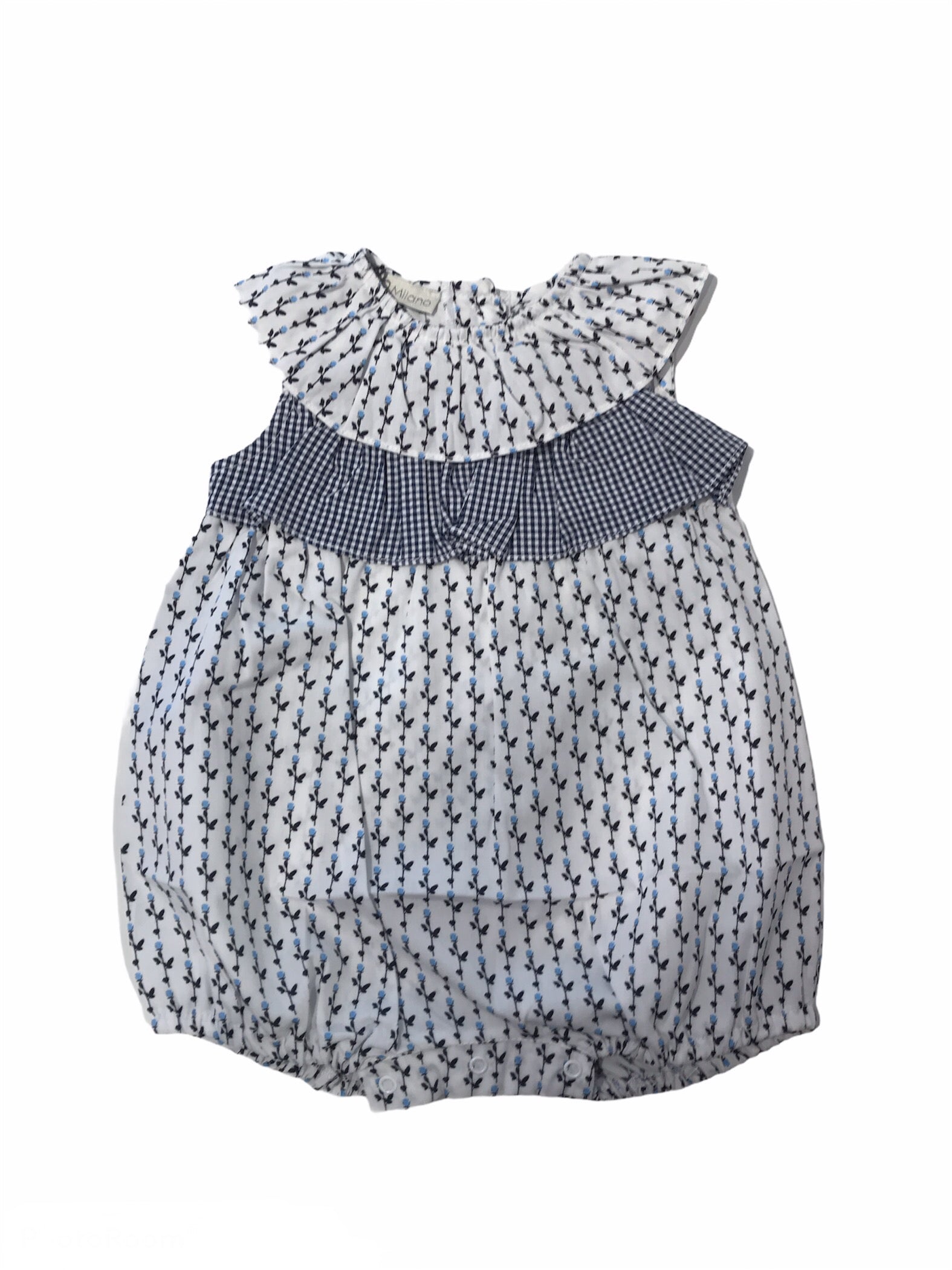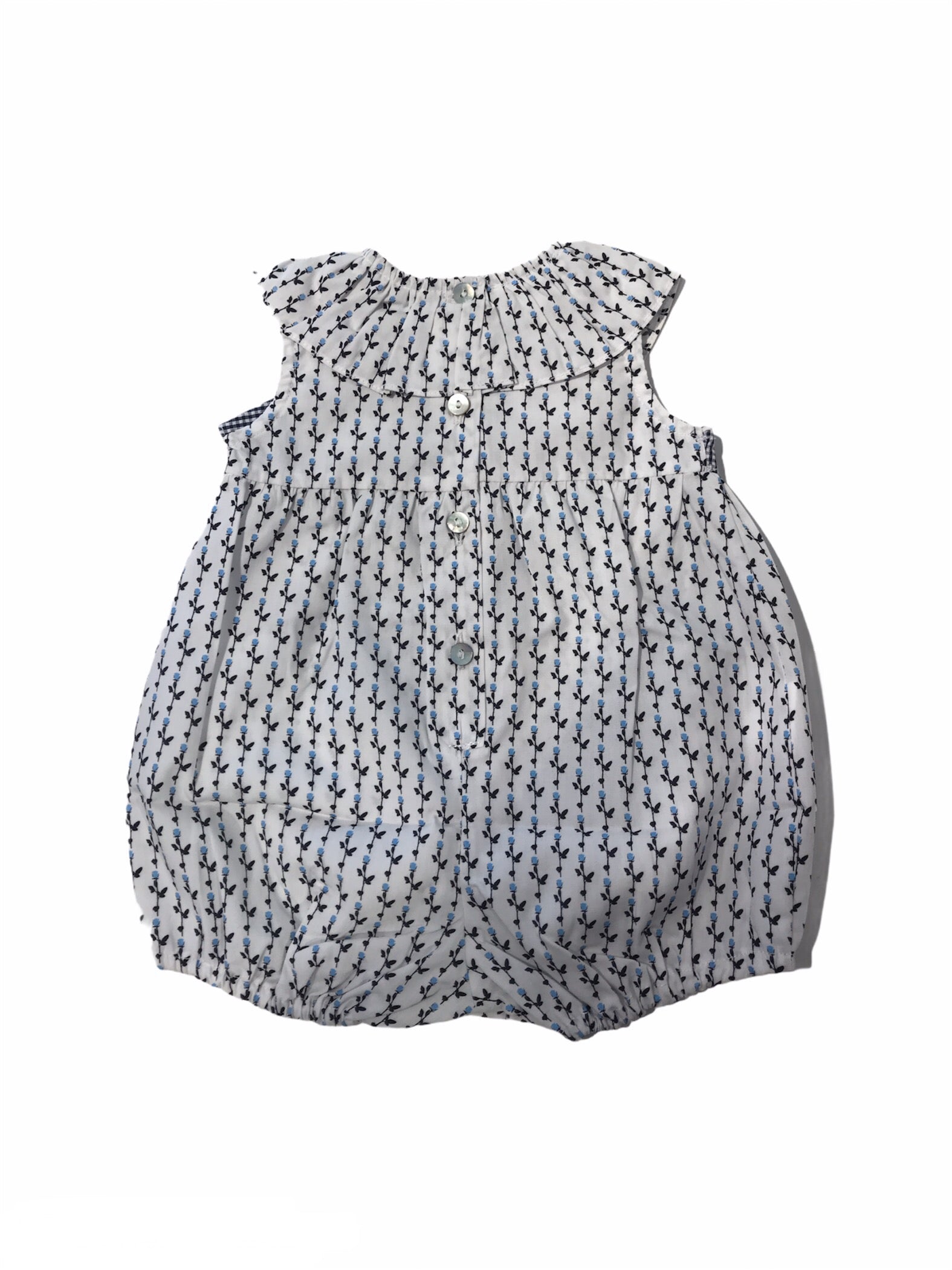 Pagliacetto J.O. Milano in cotone stampato fiorellino bianco/blu con balza a vìcobntrasto, apertura dietro con bottoncini madre perla, mutandina con apertura a clip.