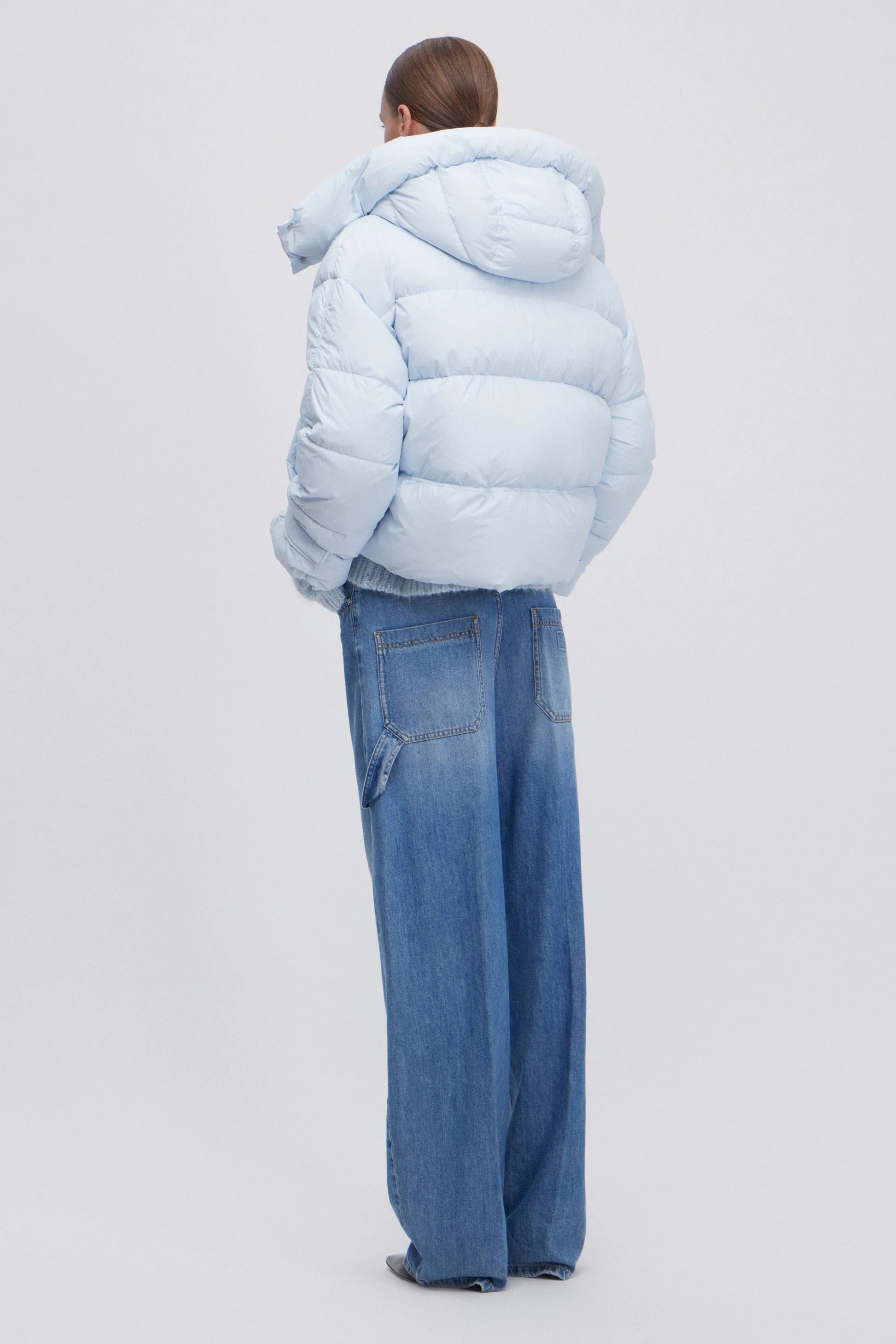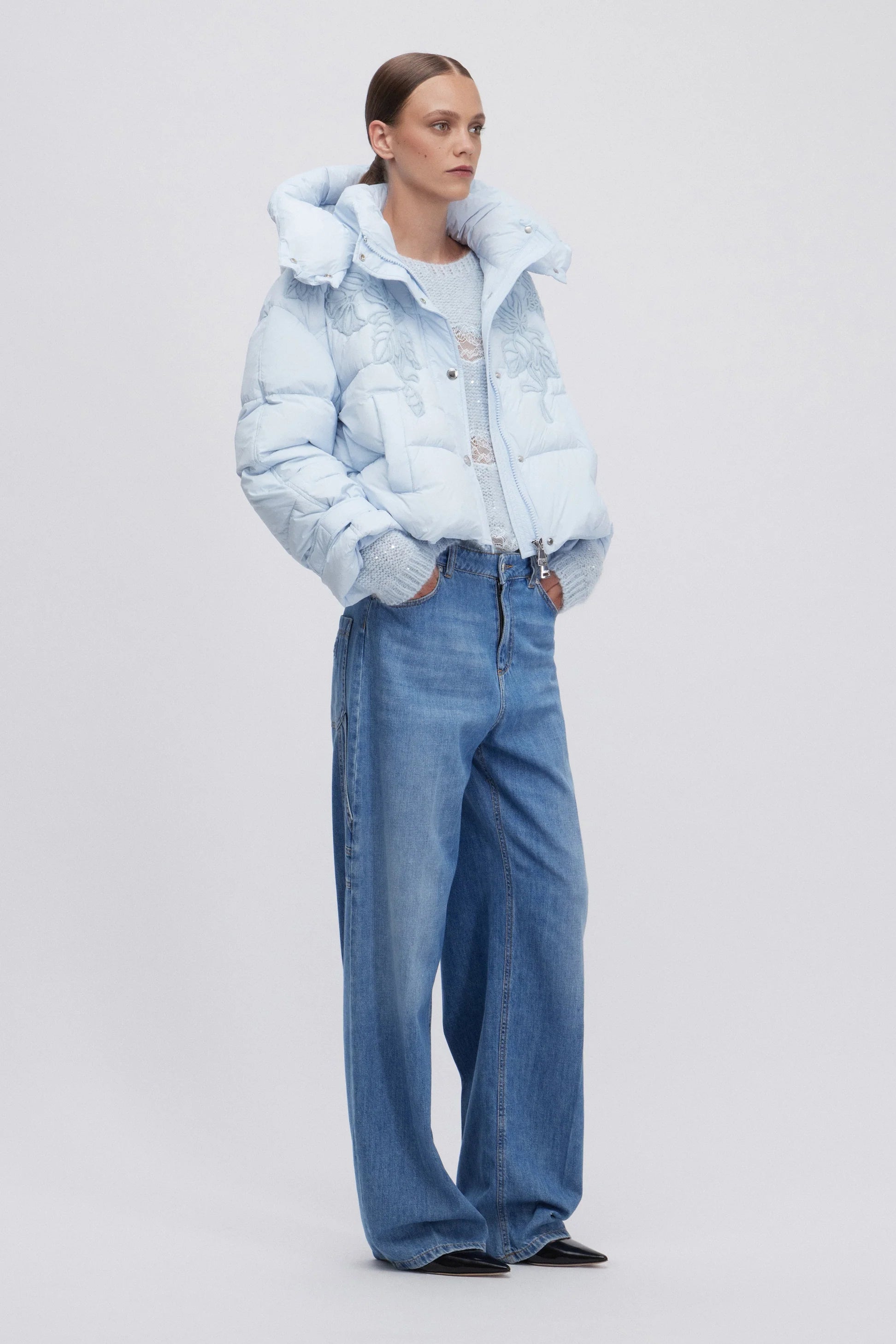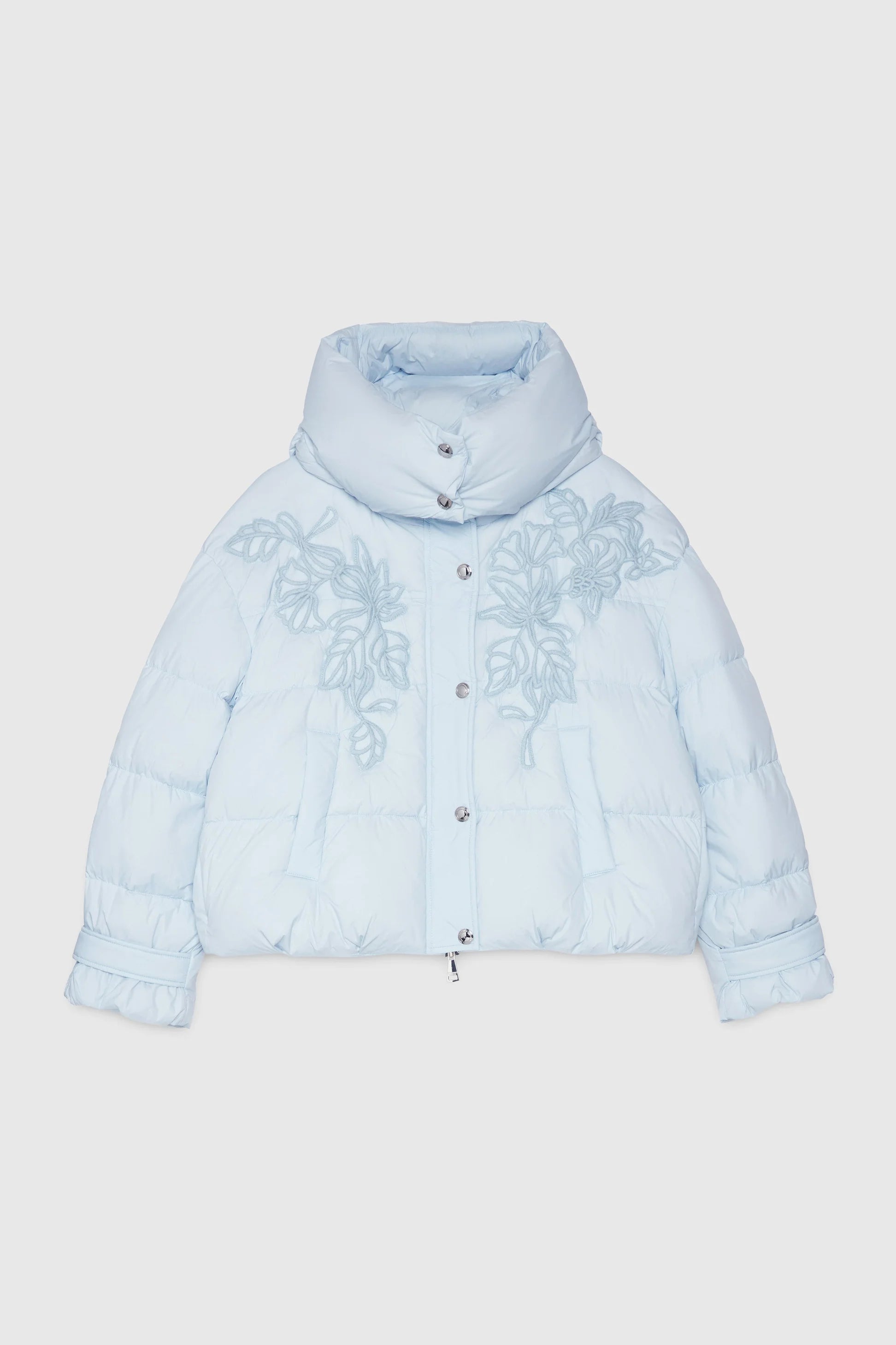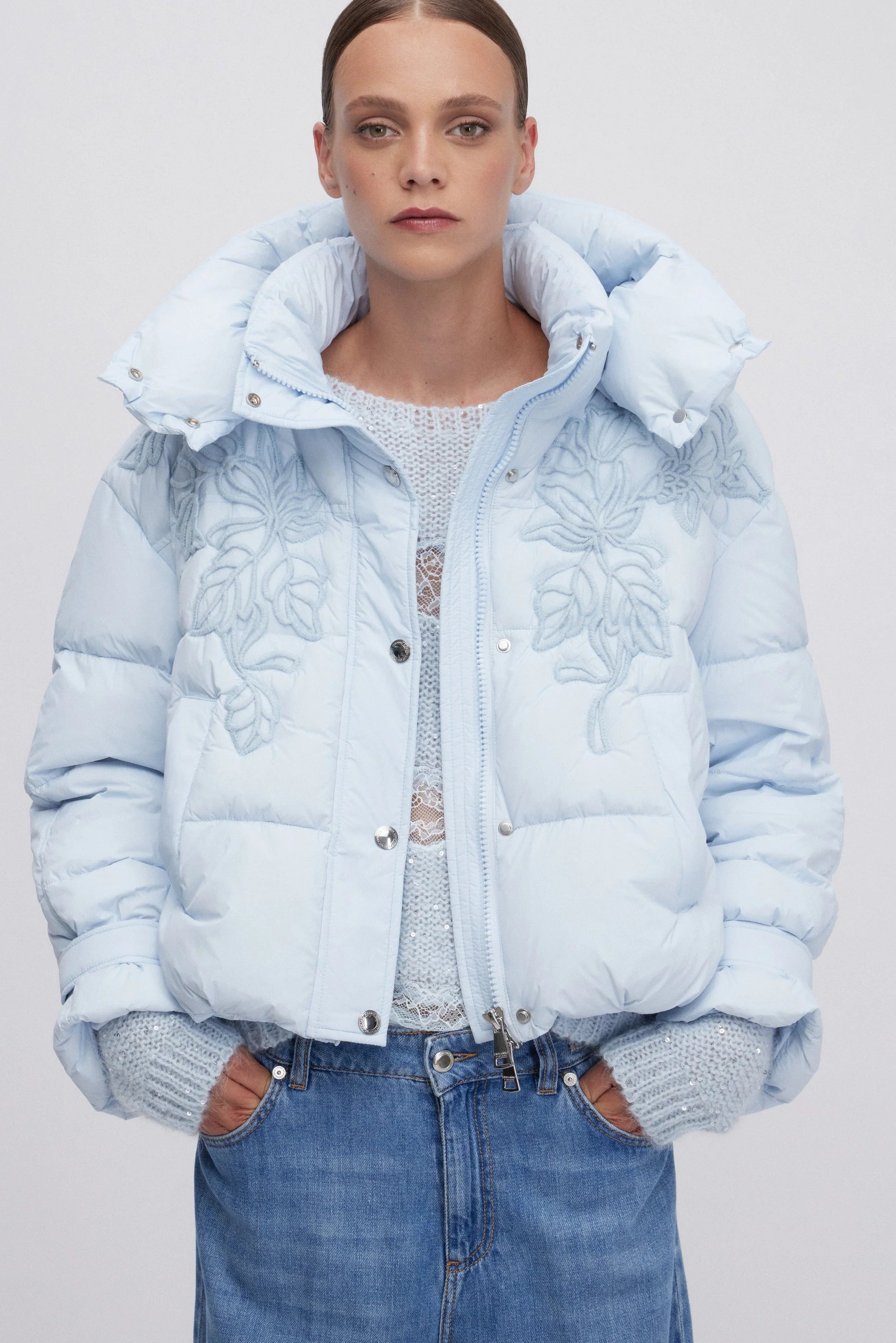 Piumino corto in nylon superlight opaco con imbottitura di vera piuma d’oca, caldo e superleggero. Prezioso ricamo in filo di lana tono su tono sul davanti. Cappuccio staccabile e apertura con zip e bottoni logati.