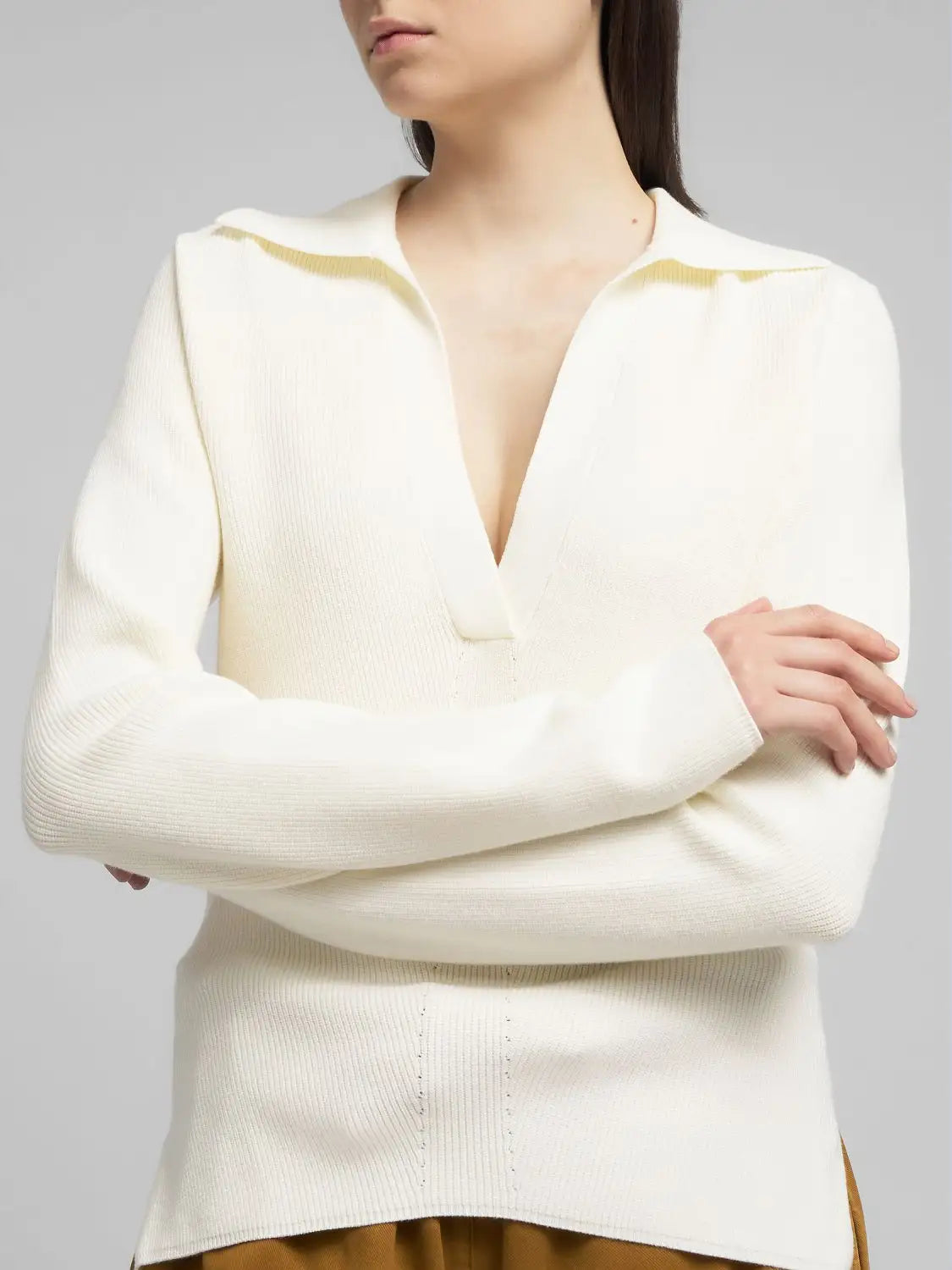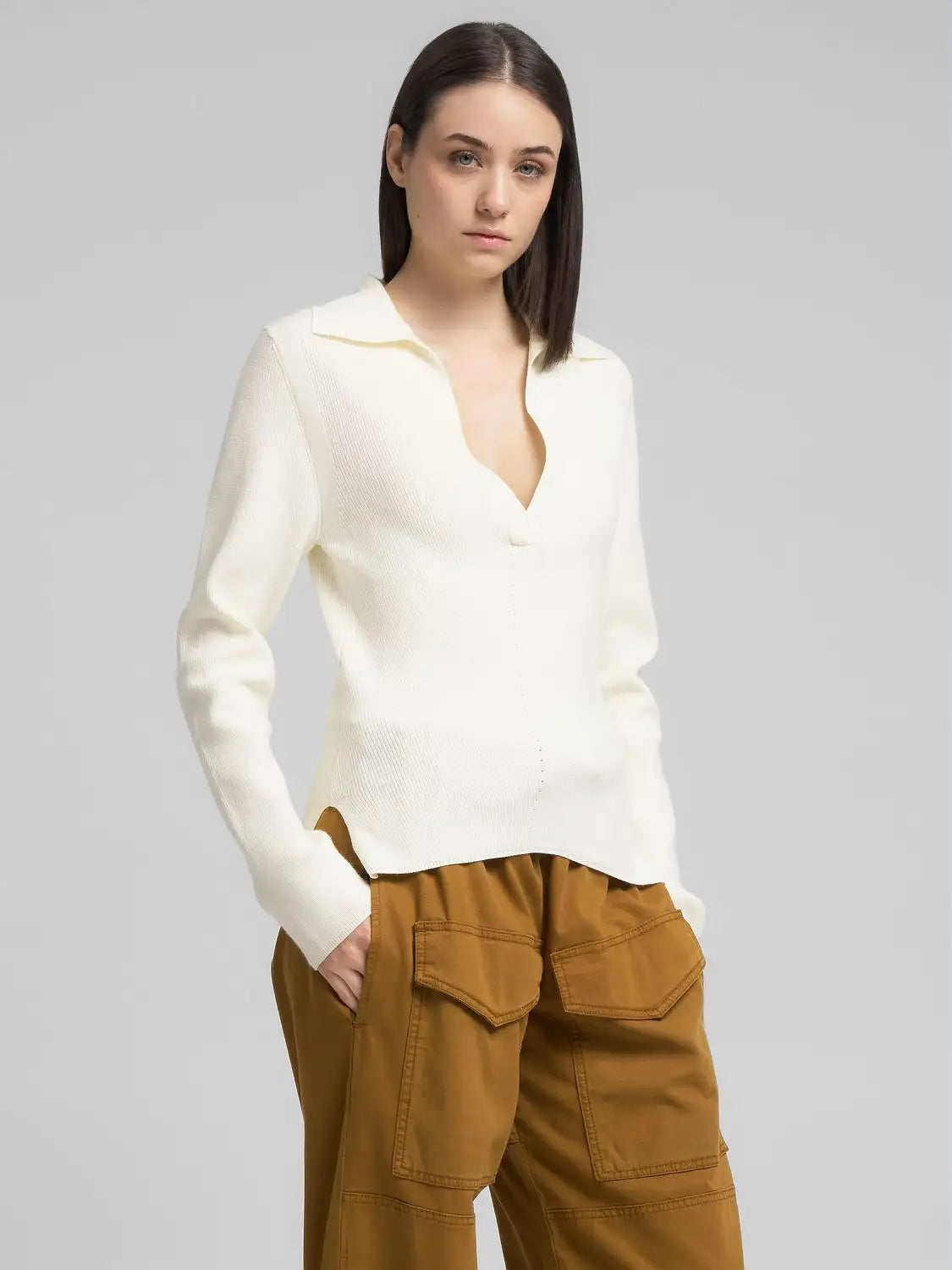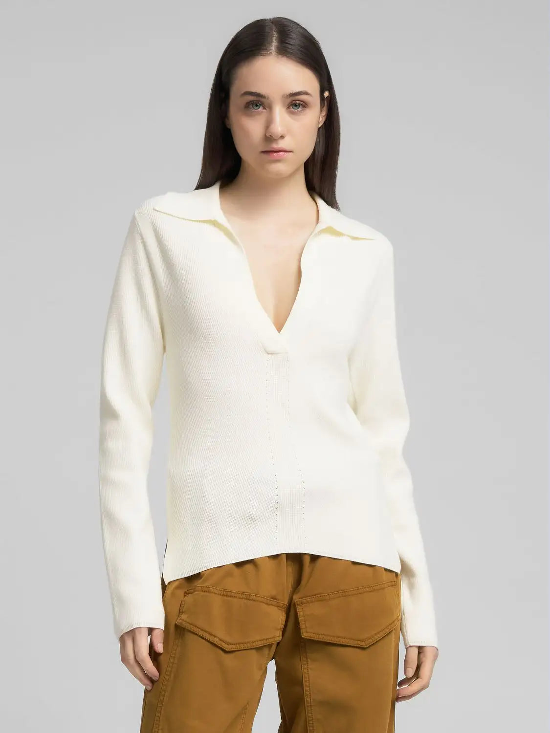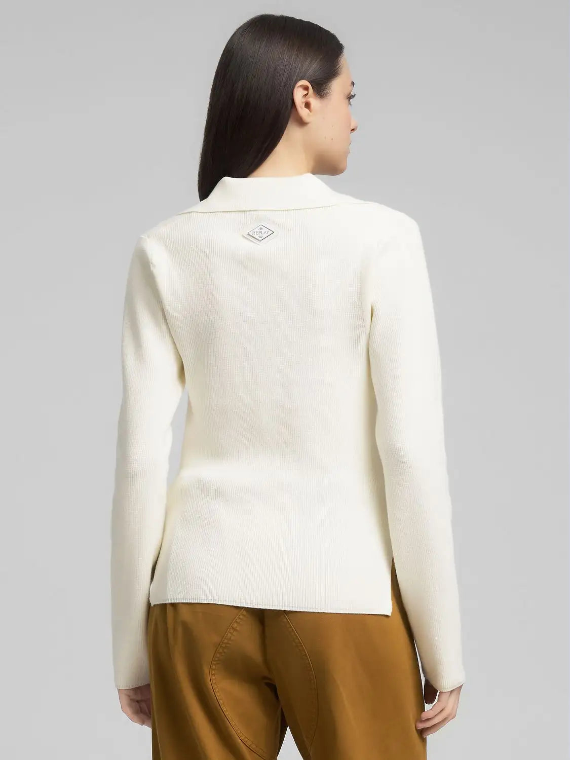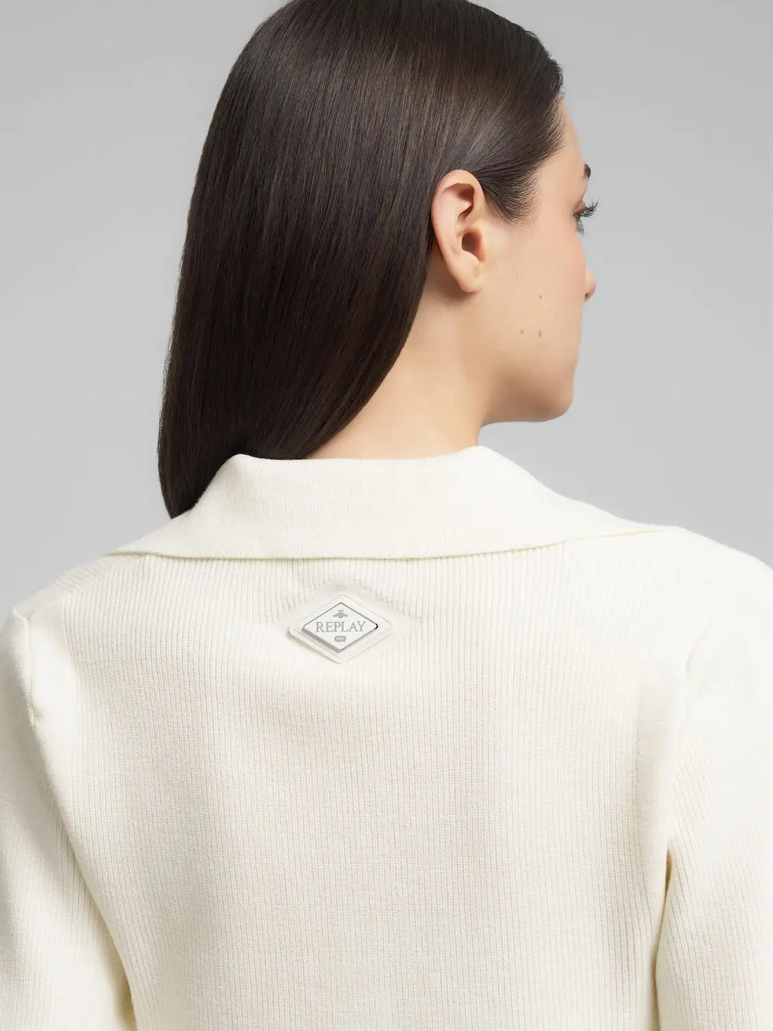 Maglia a maniche lunghe dalla vestibilità slim realizzata in filato di misto viscosa con lavorazione a costine. Il modello è impreziosito da spacchetti laterali e da un collo in stile polo che si apre in un profondo scollo a V. Completa il design il logo rombo sul retro, espressione del DNA Replay.