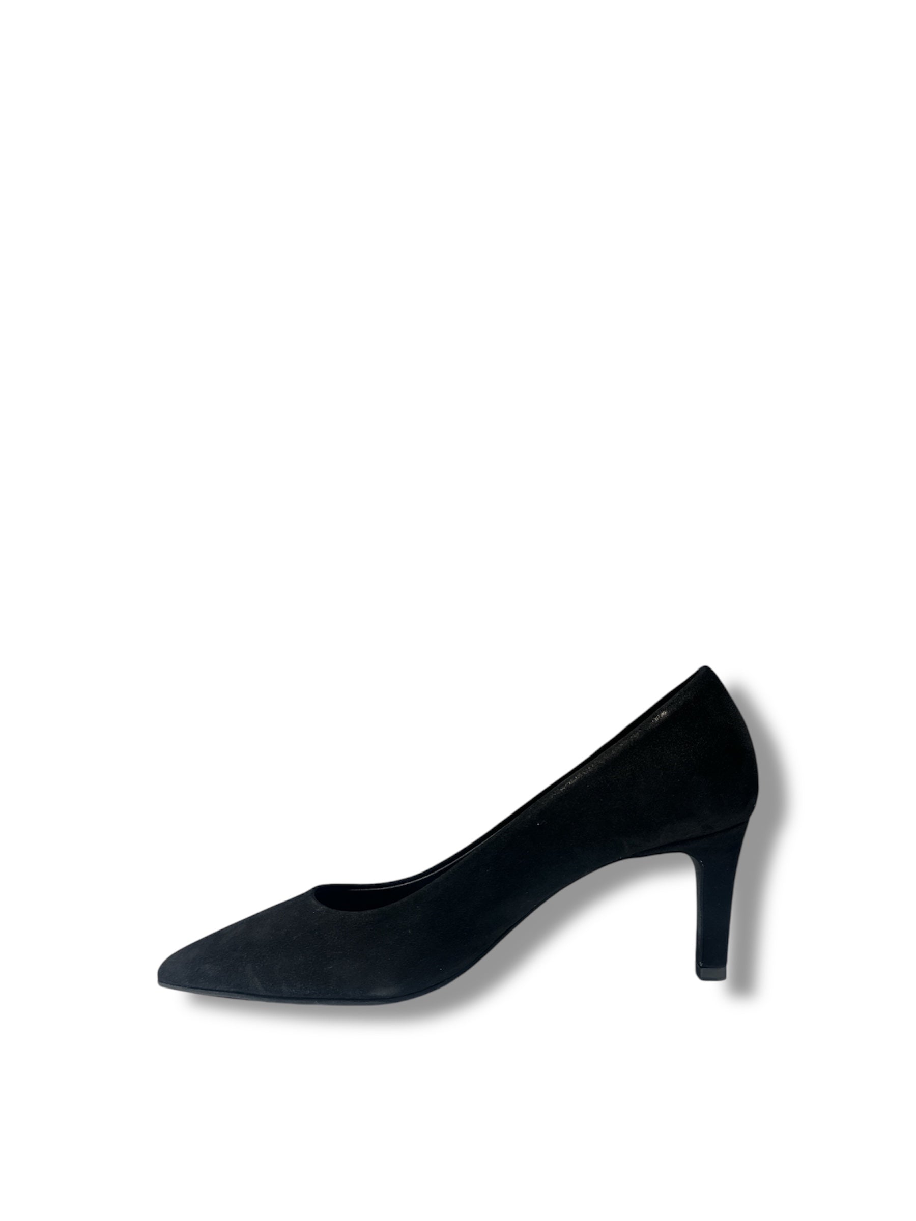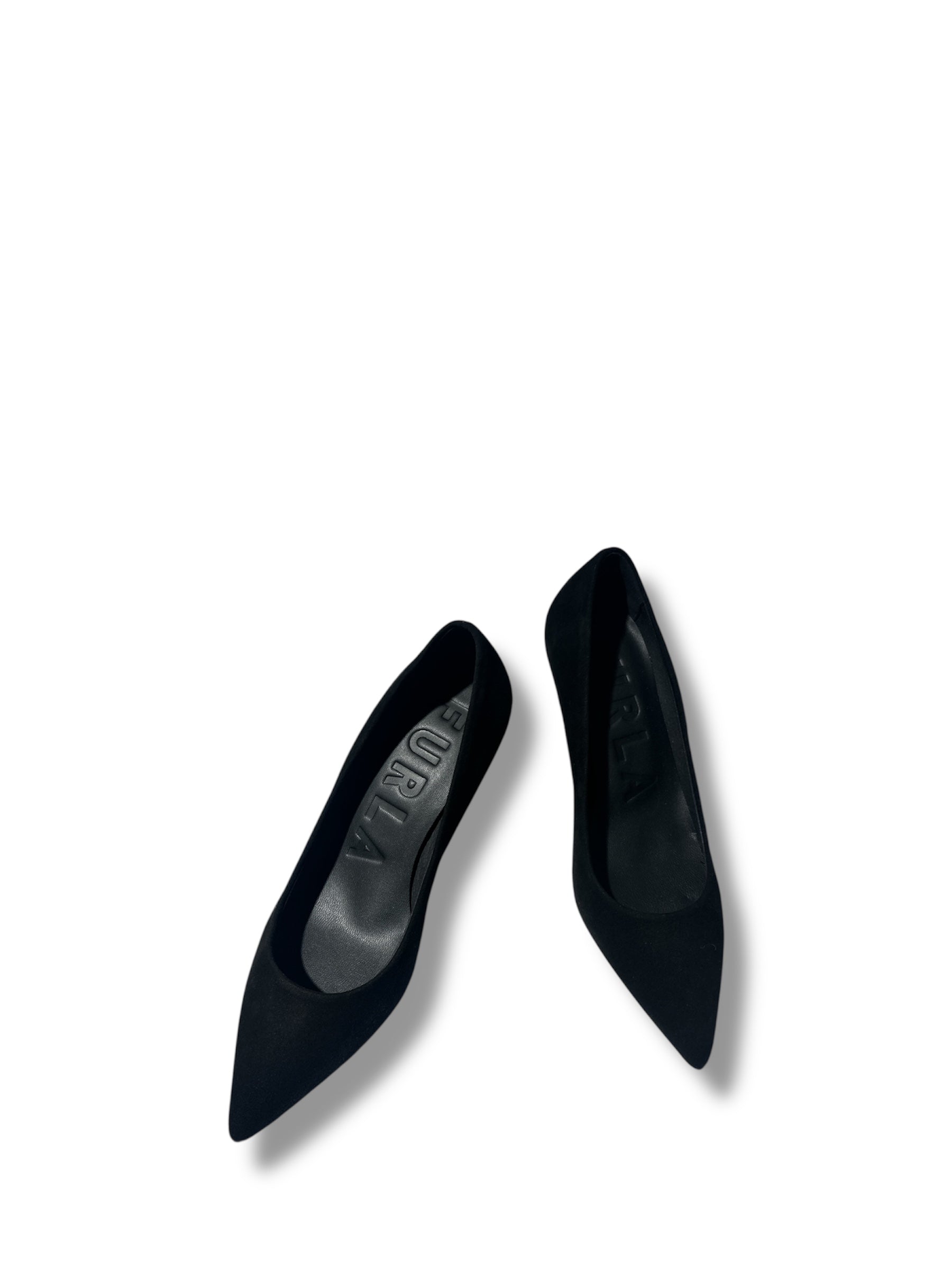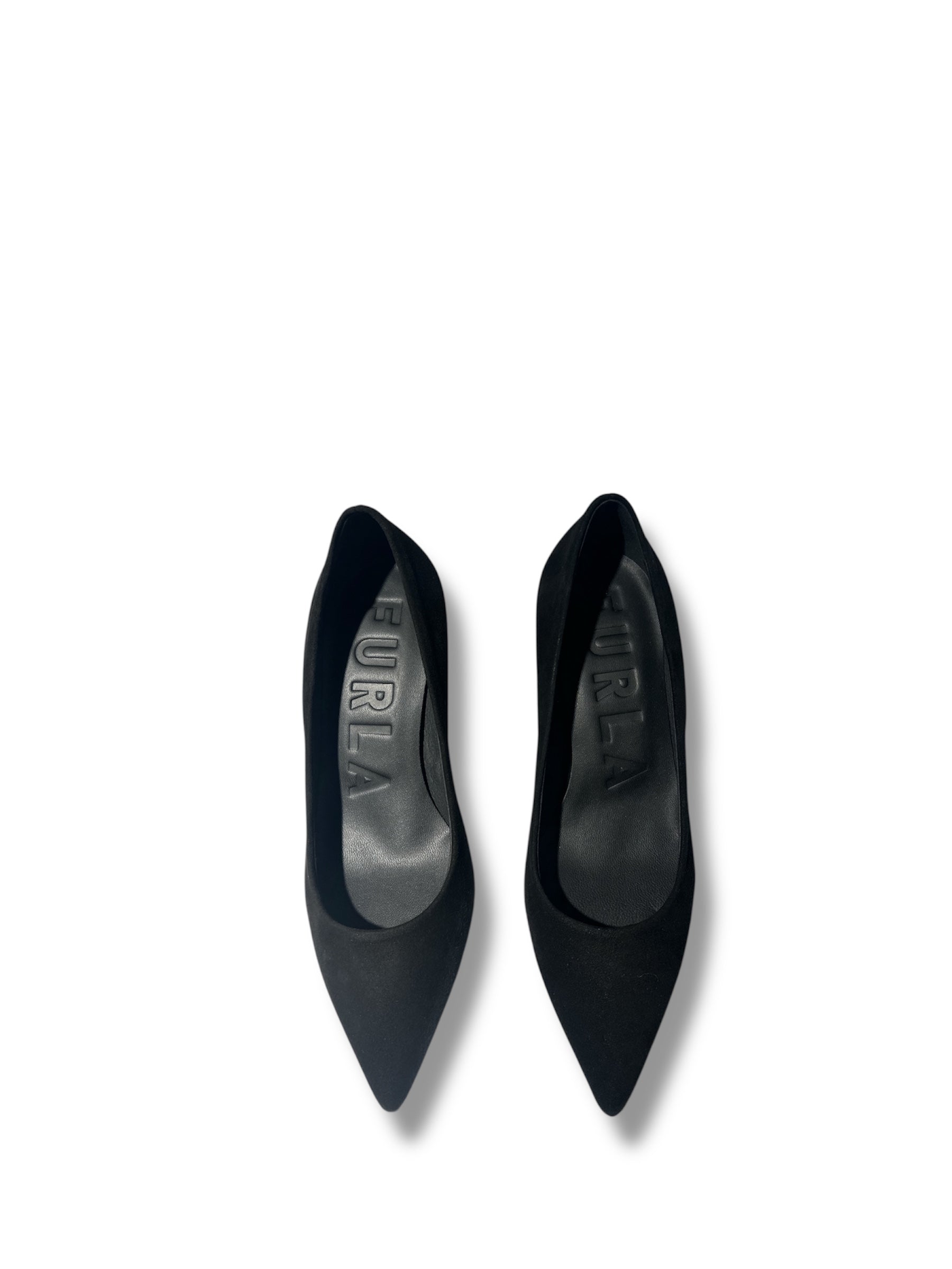 Scarpa in camoscio nero FURLA, linea affusolata con tacco sottile di 7cm, fondo in gomma, piccolo stemma dorato sul tacco.