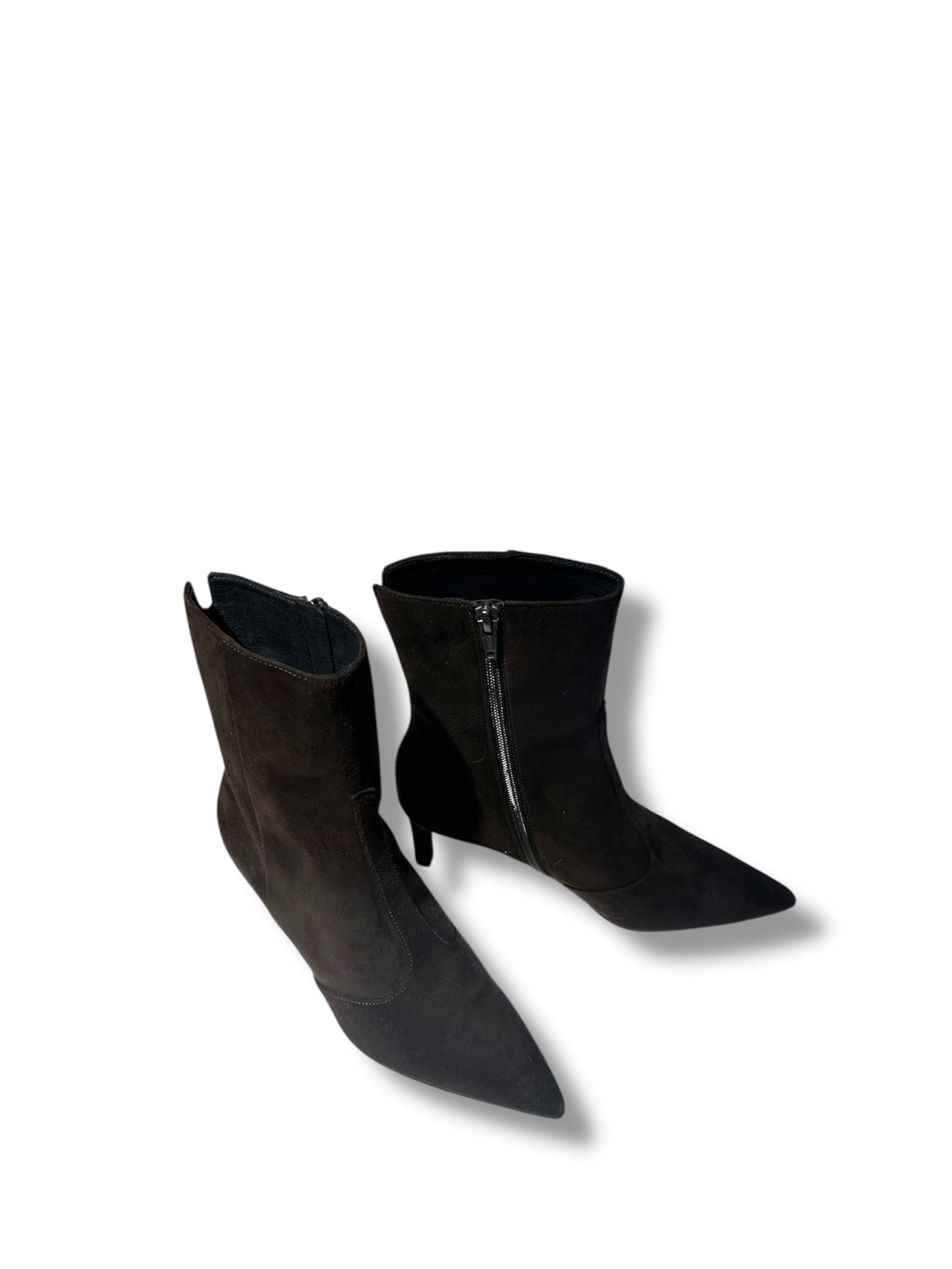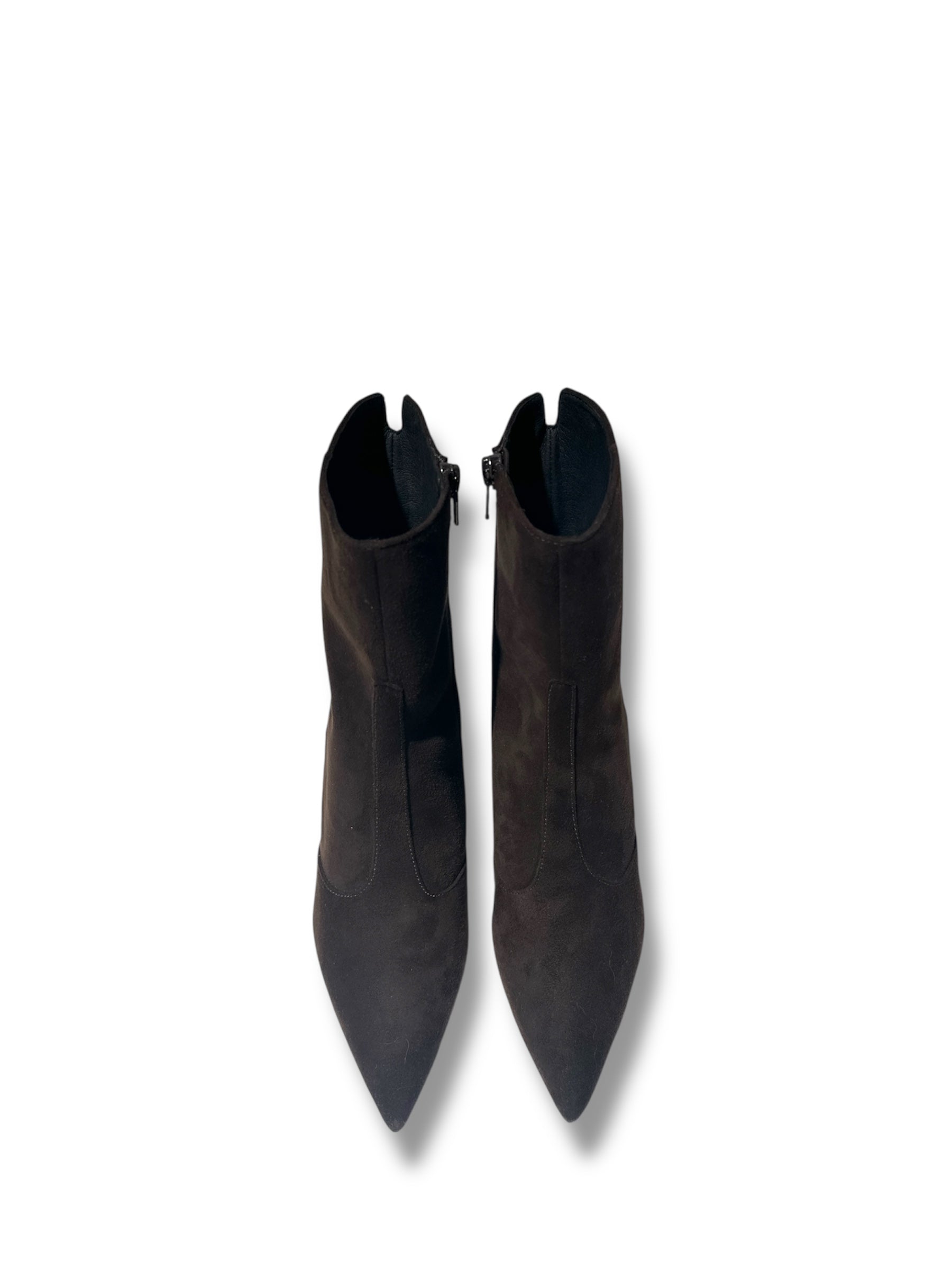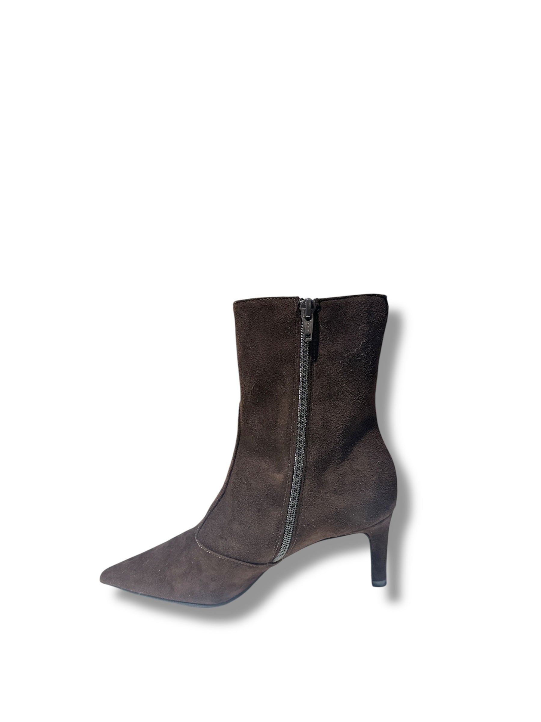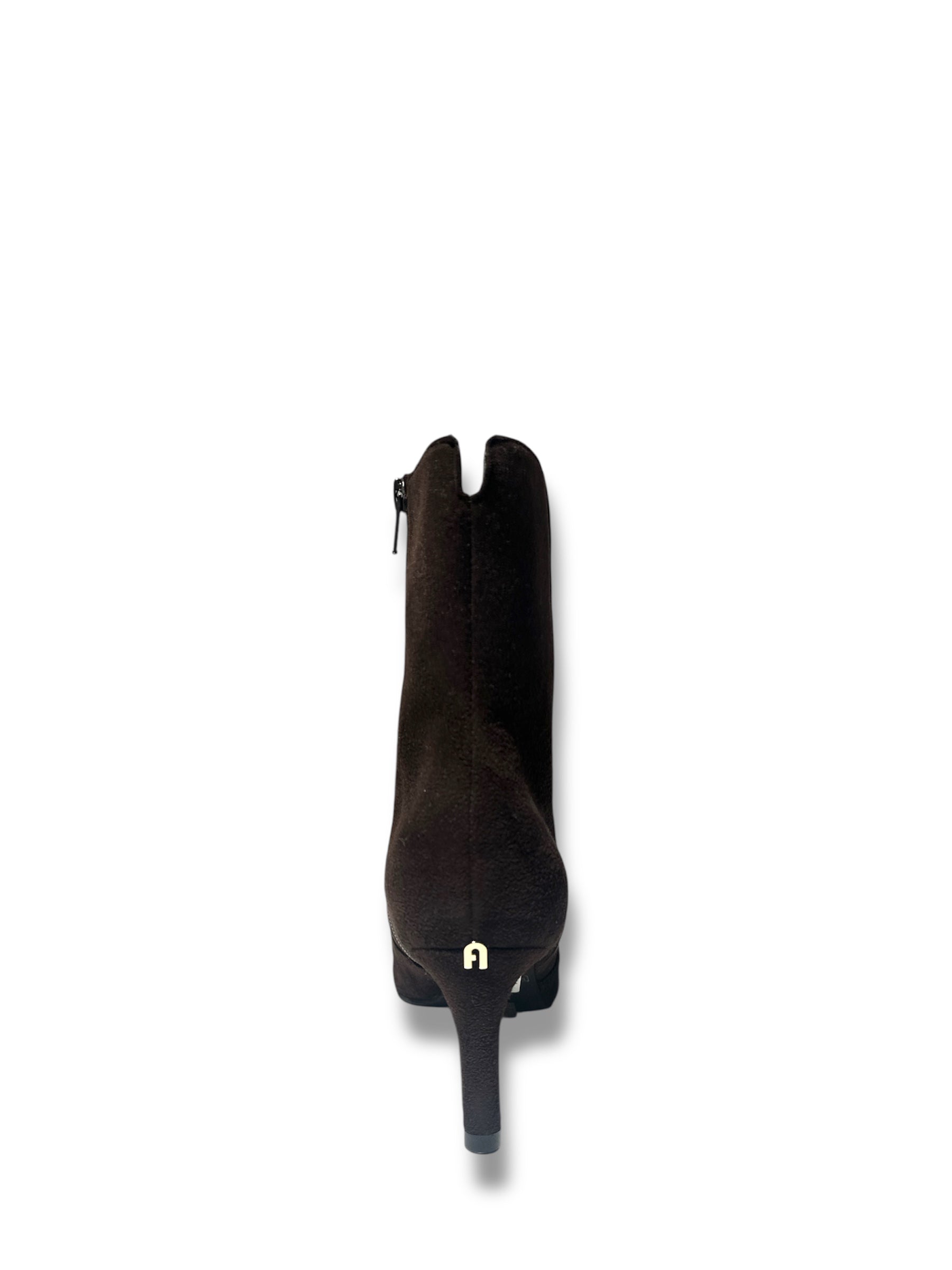 Stivaletto in camoscio color cioccolato FURLA, linea affusolata con tacco sottile di 7cm, fondo in gomma, zip interna e piccolo spacchetto aperto sulla caviglia.