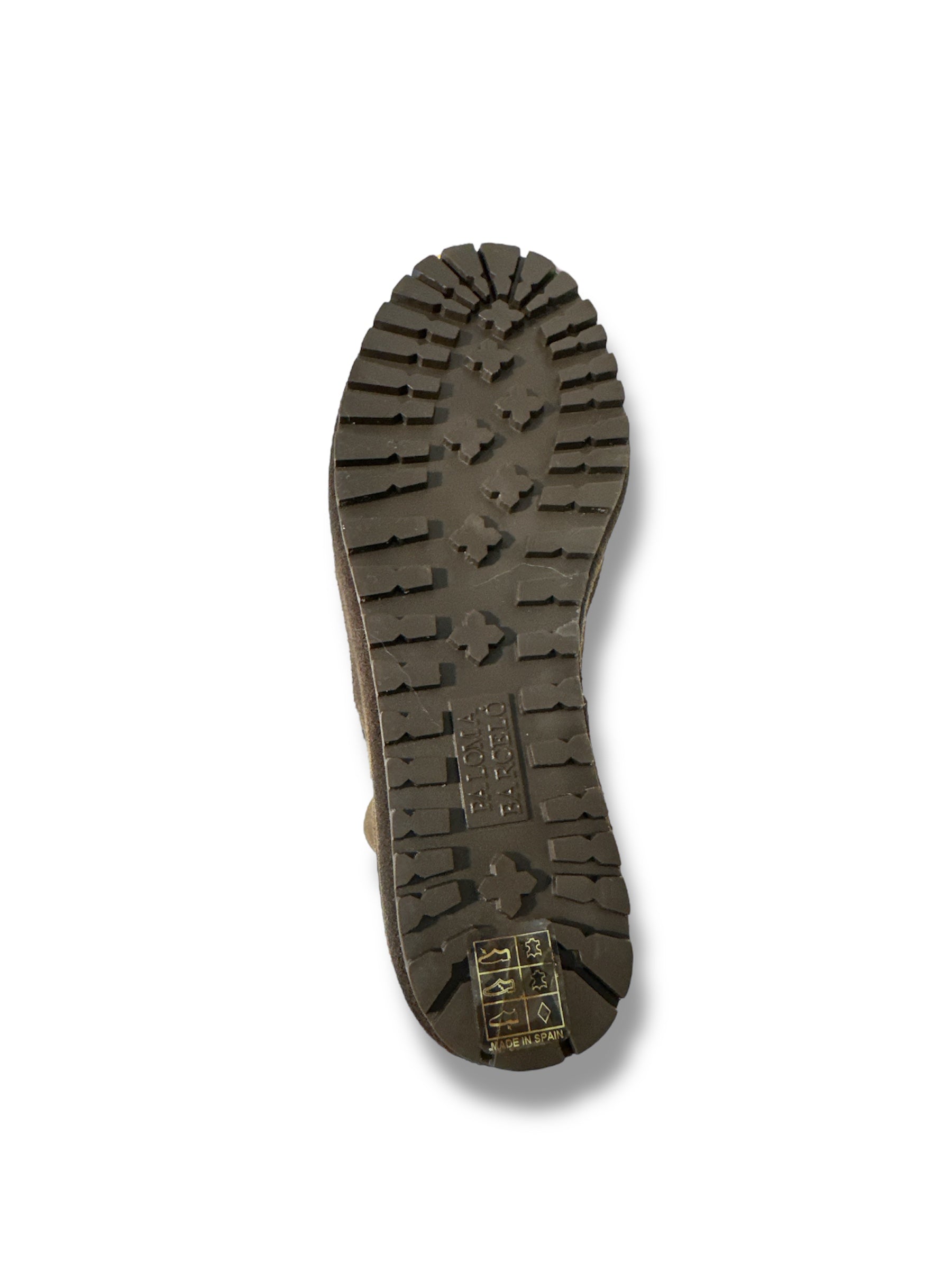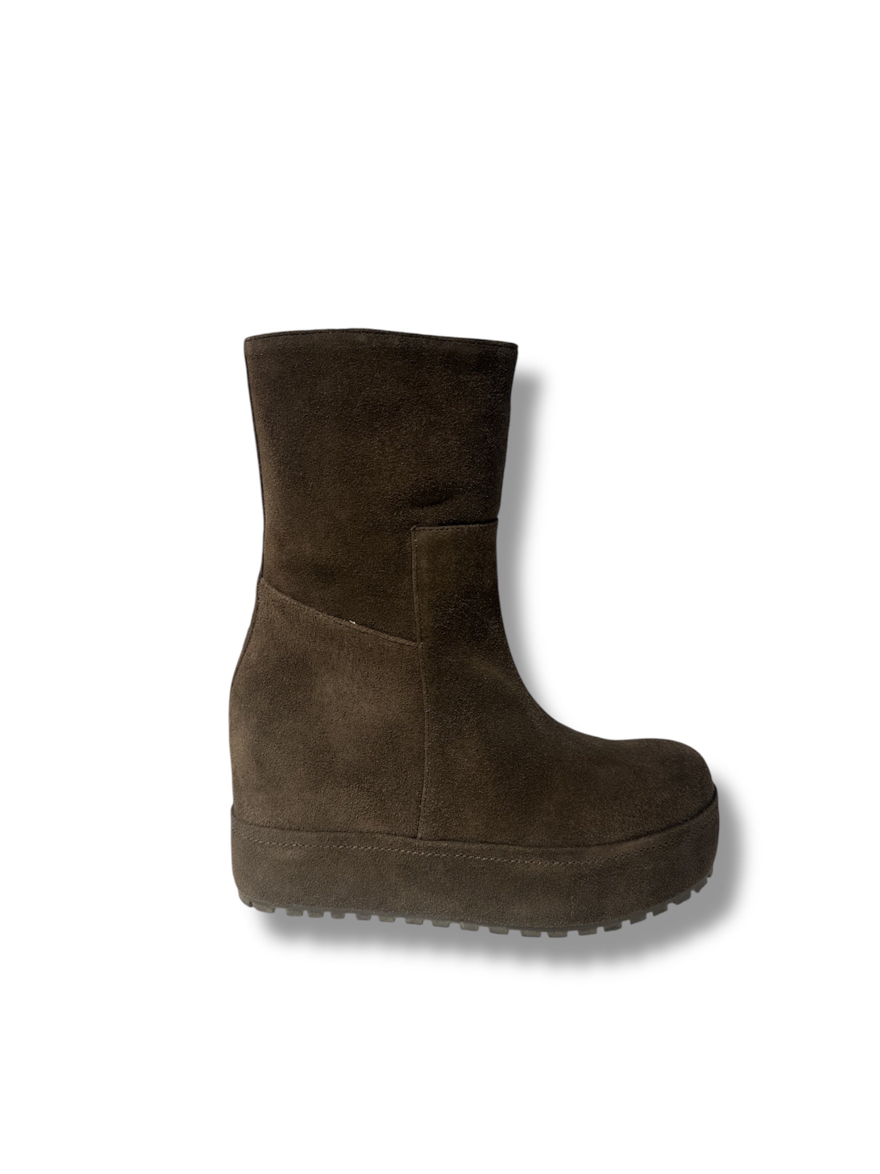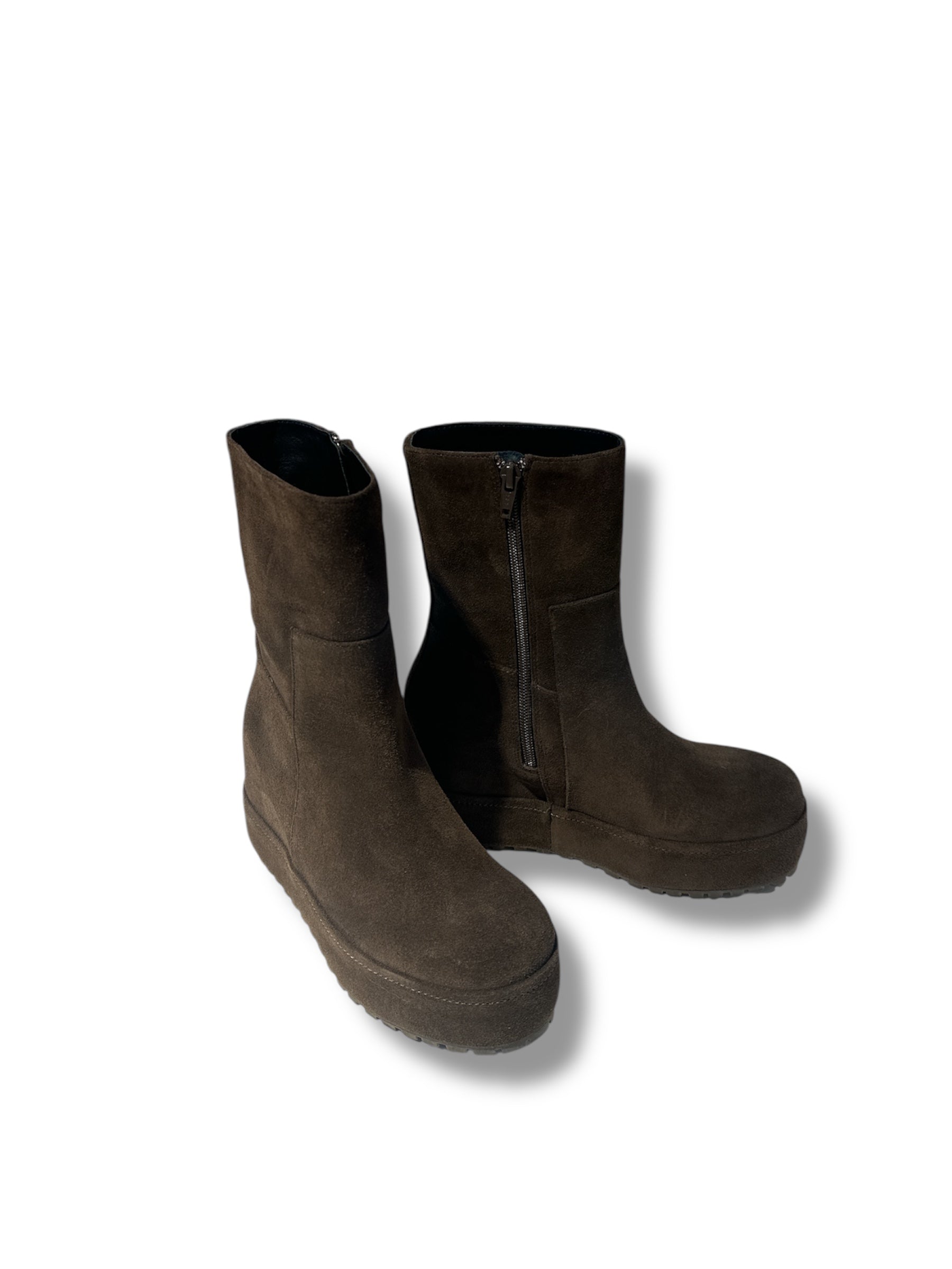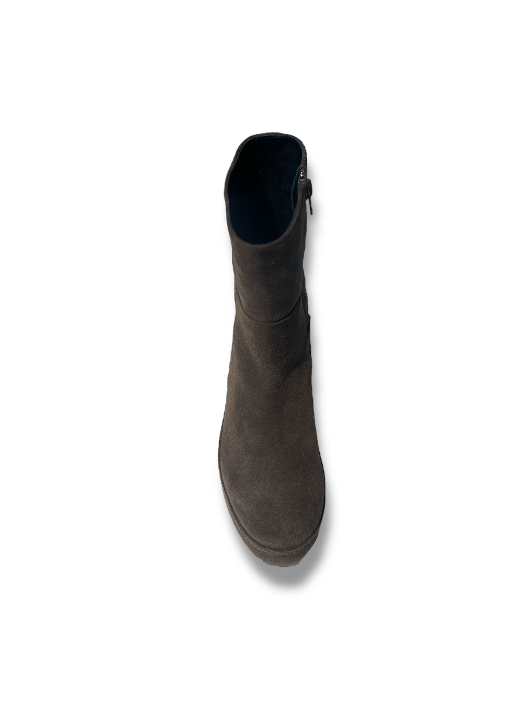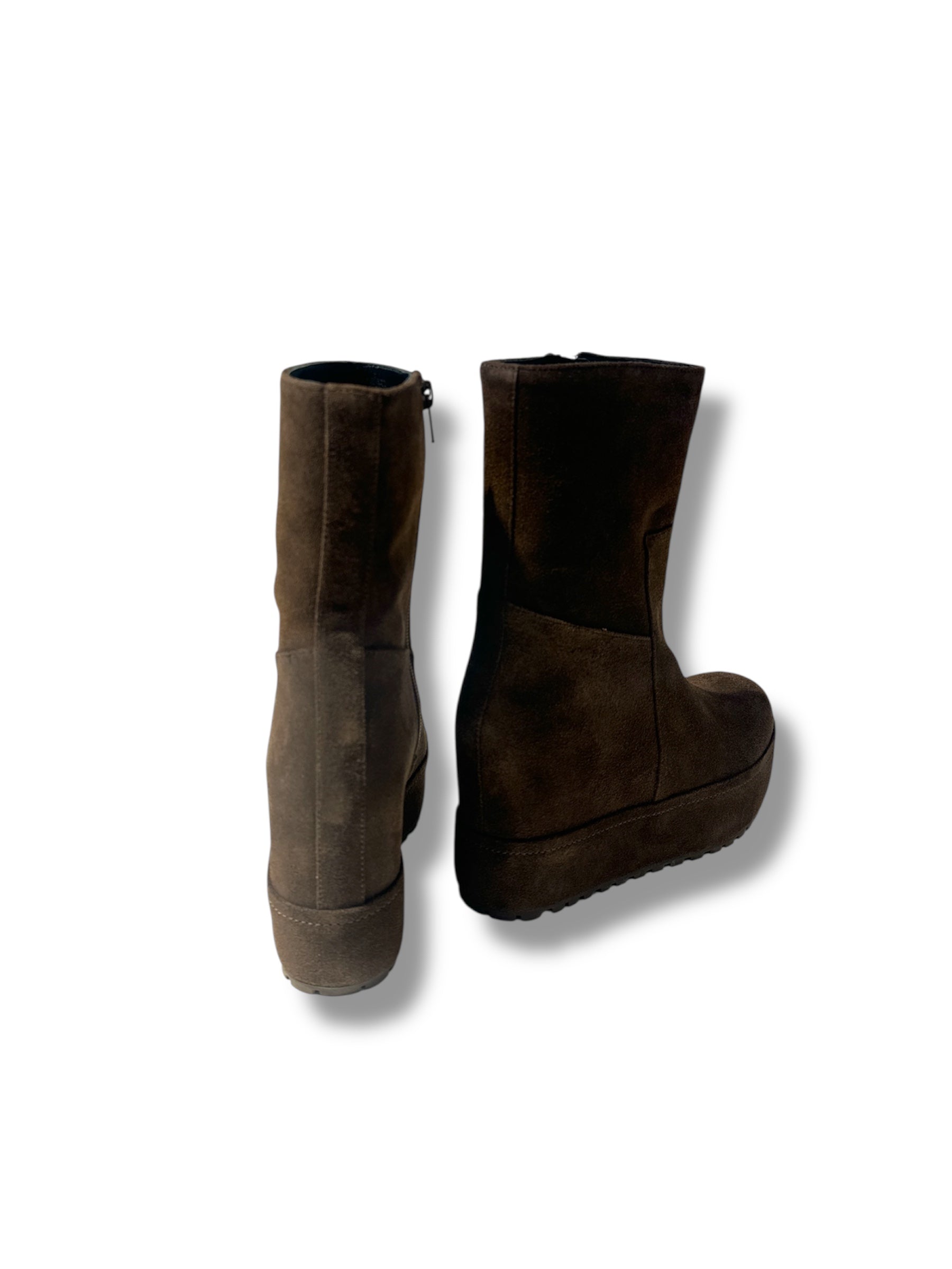 Stivaletto platform Paloma Barcelò con tomaia in camoscio marrone e zip alto al polpaccio. Fondo a zeppa ricoperta in pelle nera alta 4 cm e ulteriore zeppa interna alta 3 cm per un totale di 7 cm. Fodera in pelle e fondo gomma. Made in Spain.