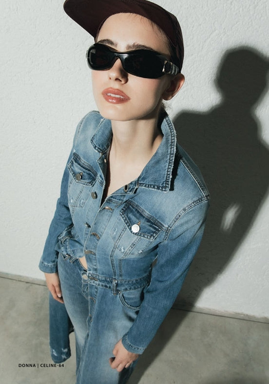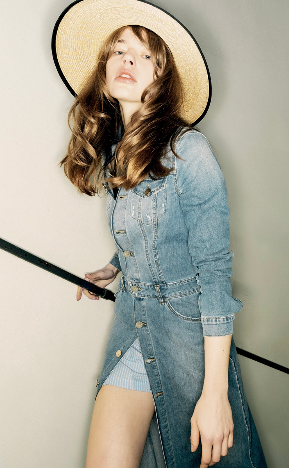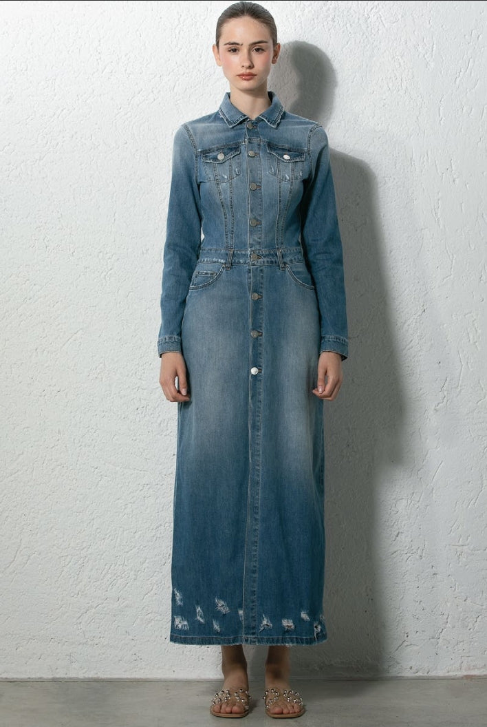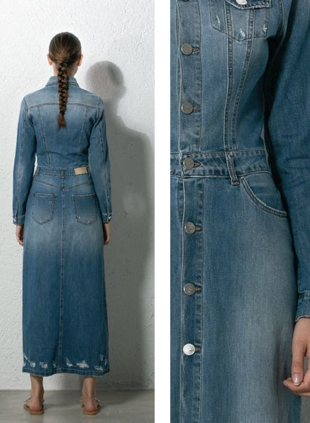 Abito chemisier in denim elasticizzato con rotture effetto vintage, abbottonatura frontale